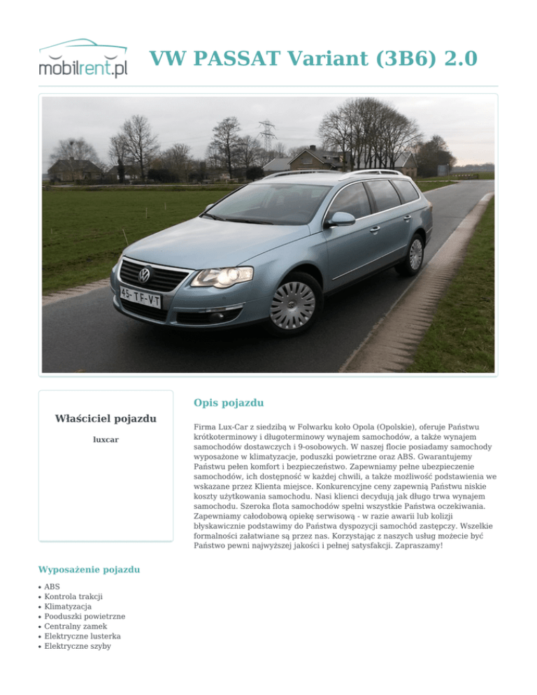 VW PASSAT Variant (3B6) 2.0 Opis pojazdu Właściciel pojazdu luxcar Wyposażenie pojazdu ● ● ● ● ● ● ● ABS Kontrola trakcji Klimatyzacja Pooduszki powietrzne Centralny zamek Elektryczne lusterka Elektryczne szyby Firma Lux-Car z siedzibą w Folwarku koło Opola (Opolskie), oferuje Państwu krótkoterminowy i długoterminowy wynajem samochodów, a także wynajem samochodów dostawczych i 9-osobowych. W naszej flocie posiadamy samochody wyposażone w klimatyzacje, poduszki powietrzne oraz ABS. Gwarantujemy Państwu pełen komfort i bezpieczeństwo. Zapewniamy pełne ubezpieczenie samochodów, ich dostępność w każdej chwili, a także możliwość podstawienia we wskazane przez Klienta miejsce. Konkurencyjne ceny zapewnią Państwu niskie koszty użytkowania samochodu. Nasi klienci decydują jak długo trwa wynajem samochodu. Szeroka flota samochodów spełni wszystkie Państwa oczekiwania. Zapewniamy całodobową opiekę serwisową - w razie awarii lub kolizji błyskawicznie podstawimy do Państwa dyspozycji samochód zastępczy. Wszelkie formalności załatwiane są przez nas. Korzystając z naszych usług możecie być Państwo pewni najwyższej jakości i pełnej satysfakcji. Zapraszamy! ● ● ● ● ● ● ● ● ● Immobilizer Komputer pokładowy Radio + CD Tempomat Wspomaganie kierownicy kombi manualna diesel niebieski Rezerwacje Początek rezerwacji Koniec rezerwacji