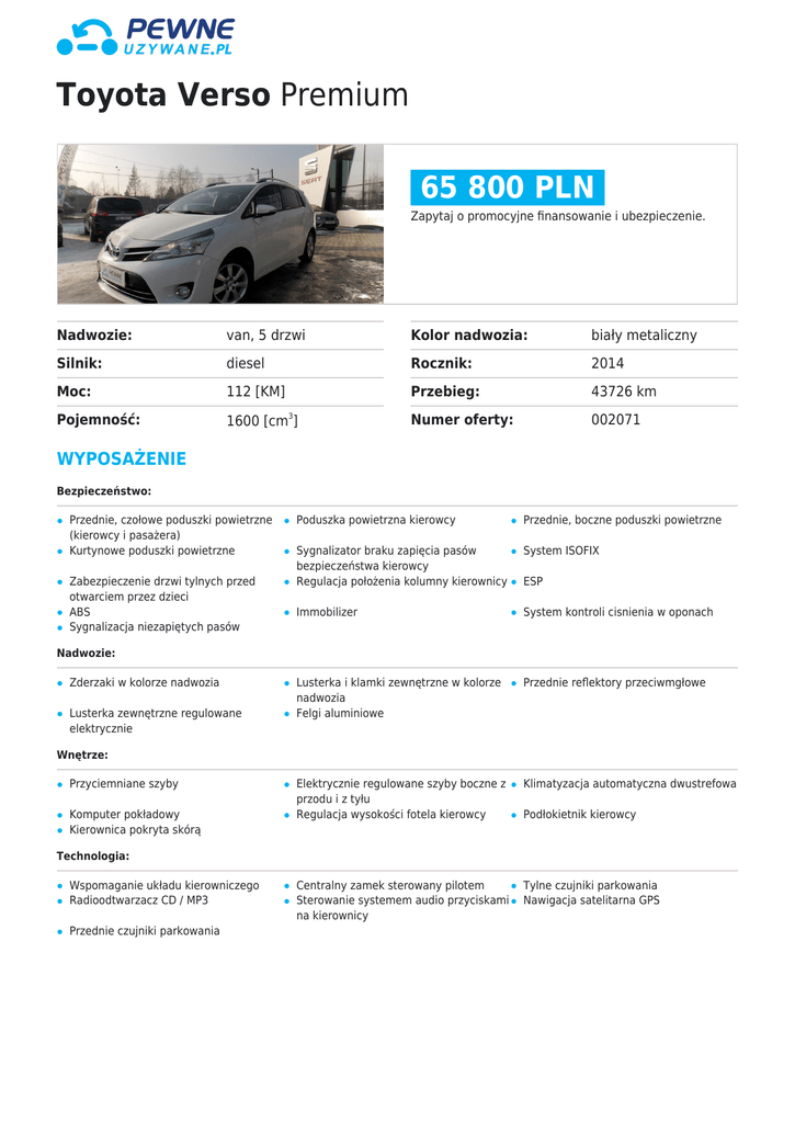 Toyota Verso Premium 65 800 PLN Zapytaj o promocyjne finansowanie i ubezpieczenie. Nadwozie: van, 5 drzwi Kolor nadwozia: biały metaliczny Silnik: diesel Rocznik: 2014 Moc: 112 [KM] Przebieg: 43726 km Pojemność: 1600 [cm ] Numer oferty: 002071 3 WYPOSAŻENIE Bezpieczeństwo: Przednie, czołowe poduszki powietrzne (kierowcy i pasażera) Kurtynowe poduszki powietrzne Zabezpieczenie drzwi tylnych przed otwarciem przez dzieci ABS Sygnalizacja niezapiętych pasów Poduszka powietrzna kierowcy Przednie, boczne poduszki powietrzne Sygnalizator braku zapięcia pasów bezpieczeństwa kierowcy Regulacja położenia kolumny kierownicy System ISOFIX Immobilizer System kontroli cisnienia w oponach Lusterka i klamki zewnętrzne w kolorze nadwozia Felgi aluminiowe Przednie reflektory przeciwmgłowe Elektrycznie regulowane szyby boczne z przodu i z tyłu Regulacja wysokości fotela kierowcy Klimatyzacja automatyczna dwustrefowa Centralny zamek sterowany pilotem Sterowanie systemem audio przyciskami na kierownicy Tylne czujniki parkowania Nawigacja satelitarna GPS ESP Nadwozie: Zderzaki w kolorze nadwozia Lusterka zewnętrzne regulowane elektrycznie Wnętrze: Przyciemniane szyby Komputer pokładowy Kierownica pokryta skórą Podłokietnik kierowcy Technologia: Wspomaganie układu kierowniczego Radioodtwarzacz CD / MP3 Przednie czujniki parkowania Toyota Verso Premium DODATKOWE INFORMACJE: Sprzedajemy tylko pewne samochody używane, stan techniczny weryfikujemy w naszym autoryzowanym serwisie Ford /Nissan / Suzuki / Hyundai / Seat Możliwość zakupu dodatkowej gwarancji : Wariant STANDARD Wariant COMFORT Finansowanie - Możliwość finansowania pojazdu poprzez kredyt lub leasing Ubezpieczenia - Pakiety dealerskie ubezpieczeń komunikacyjnych Zapraszamy do salonu! SALON CZYNNY OD PONIEDZIAŁKU DO PIĄTKU 9-19 W SOBOTY 10-15 Pewne Używane Kraków Jasnogórska 60 ul. Jasnogórska 60, tel.:12 662 00 02 www.blog.pgd.pl Nota prawna Dane zawarte w niniejszej propozycji handlowej mają wyłącznie charakter informacyjny. Podane informacje nie stanowią oferty ani zapewnienia, w szczególności w rozumieniu art. 66 § 1 oraz art. 5561 Kodeksu cywilnego. Wiążące ustalenie ceny, wyposażenia oraz specyfikacji samochodu następuje w pisemnej umowie sprzedaży/zamówienia samochodu. Ze względu na ograniczenia techniczne (np. odwzorowanie kolorów przez monitor lub sposób wydruku), kolory przedstawione w niniejszej propozycji handlowej mogą się różnić od rzeczywistych kolorów nadwozia i tapicerki. Niniejsza propozycja handlowa oraz wszelkie załączniki z nią związane są poufne i nie mogą być przekazywane osobom trzecim. Prezentowane zdjęcia mogą zawierać wyposażenie opcjonalne (akcesoryjne), dodatkowo płatne. Warunki oferty maja charakter orientacyjny i mogą zostać zmienione w momencie uaktualnienia cen lub warunków promocji.