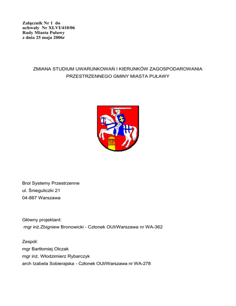 Załącznik Nr 1 do uchwały Nr XLVI/410/06 Rady Miasta Puławy z dnia 25 maja 2006r ZMIANA STUDIUM UWARUNKOWAŃ I KIERUNKÓW ZAGOSPODAROWANIA PRZESTRZENNEGO GMINY MIASTA PUŁAWY Brol Systemy Przestrzenne ul. Śnieguliczki 21 04-867 Warszawa Główny projektant: mgr inż.Zbigniew Bronowicki - Członek OUI/Warszawa nr WA-362 Zespół: mgr Bartłomiej Olczak mgr inż. Włodzimierz Rybarczyk arch Izabela Sobierajska - Członek OUI/Warszawa nr WA-278 Uchwała Nr XXVII/247/04 Rady Miasta Puławy z dnia 17 grudnia 2004r w sprawie przystąpienia do zmiany studium uwarunkowań i kierunków zagospodarowania przestrzennego Gminy Miasta Puławy Na podstawie art. 18 ust. 2 pkt. 5 ustawy z dnia 8 marca 1990r o samorządzie gminnym (tekst jednolity z 2001r. Dz.U. Nr 142 poz. 1591) w związku z art. 32 ust. 2 oraz art. 27 ustawy z dnia 27 marca 2003r. o planowaniu i zagospodarowaniu przestrzennym ( tekst jednolity ustawy w Dz.U. Nr 80 z 2003r, poz. 717) po zapoznaniu się z wynikami analizy zmian w zagospodarowaniu przestrzennym gminy miasto Puławy przeprowadzonymi przez Prezydenta Miasta, Rada Miasta Puławy uchwala, co następuje §1 Stwierdza się, że studium uwarunkowań i kierunków zagospodarowania przestrzennego zatwierdzone przez Radę Miasta Puławy uchwałą Nr LIX/414/98 z dnia 28 maja 1998 w sprawie uchwalenia studium i kierunków zagospodarowania przestrzennego gminy Miasta Puławy jest nieaktualne w zakresie zgodności z planem wojewódzkim zagospodarowania przestrzennego oraz w części dotyczącej układu komunikacyjnego miasta i terenów wymagających zmiany dotychczasowego przeznaczenia. §2 Przystępuje się do sporządzenia zmiany studium uwarunkowań i kierunków zagospodarowania przestrzennego gminy Miasta Puławy w części tekstowej i graficznej w granicach administracyjnych Gminy Miasto Puławy określonych w załączniku nr 1 do niniejszej uchwały. §3 Zakres opracowania zmian studium uwarunkowań i kierunków zagospodarowania Gminy Miasto Puławy zostanie dokonany zgodnie przepisami art. 10 ustawy o planowaniu i zagospodarowaniu przestrzennym oraz z przedłożonymi wynikami analizy zmian w zagospodarowaniu przestrzennym w Gminie Miasto Puławy stanowiącymi załącznik nr 2 do niniejszej uchwały. §4 Wykonanie uchwały powierza się Prezydentowi Miasta Puławy §5 Uchwała podlega opublikowaniu w lokalnej prasie, obwieszczeniu na tablicy ogłoszeń w Urzędzie Miasta oraz na tablicach ogłoszeń, na terenie miasta. §6 Uchwała wchodzi w życie z dniem ogłoszenia. Przewodniczący Rady Miasta Puławy Lucjan Tomaszewski SPIS TREŚCI WSTĘP 1.1 Położenie miasta.......................................................................................................... 8 1.2 Podstawowe dane o mieście ..........................................................................................8 1.3 Historia miasta................................................................................................................8 1.4 Kompozycja przestrzenna miasta.................................................................................10 Rozdział I UWARUNKOWANIA ZAGOSPODAROWANIA PRZESTRZENNEGO 1.Uwarunkowania przyrodnicze zagospodarowania przestrzennego 1.1. Położenie geograficzne................................................................................................13 1.2. Powiązania przyrodnicze i ekologiczne........................................................................13 1.3. Rzeźba terenu .............................................................................................................13 1.4. Budowa geologiczna ...................................................................................................14 1.5. Surowce geologiczne...................................................................................................15 1.6. Warunki wodne............................................................................................................15 1.6.1. Wody powierzchniowe..............................................................................................15 1.6.2. Wody podziemne i zaopatrzenie w wodę..................................................................16 1.7. Warunki glebowe .........................................................................................................21 1.8. Atmosfera.....................................................................................................................23 1.9. Klimat........................................................... ...............................................................23 1.10. Szata roślinna............................................................................................................24 1.10.1. Roślinność potencjalna...........................................................................................24 1.10. 2. Roślinność rzeczywista..........................................................................................24 1.11. Tereny zieleni.............................................................................................................26 1.12. Fauna.........................................................................................................................28 1.13. Struktura ekologiczna.................................................................................................28 1.14. Walory przyrodniczo-krajobrazowe............................................................................29 1.15. Ochrona środowiska przyrodniczego.................................................................................29 1.15.1. Natura 2000.........................................................................................................................31 2. Uwarunkowania społeczno-kulturowe 2.1. Środowisko kulturowe..................................................................................................32 2.2. Zasady ochrony konserwatorskiej...............