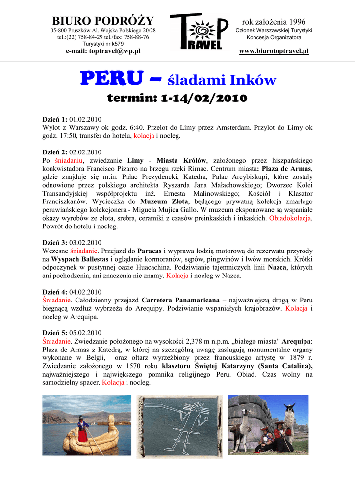 BIURO PODRÓśY rok załoŜenia 1996 05-800 Pruszków Al. Wojska Polskiego 20/28 Członek Warszawskiej Turystyki Koncesja Organizatora tel.:(22) 758-84-29 tel./fax: 758-88-76 Turystyki nr k579 e-mail: [email protected] www.biurotoptravel.pl PERU – śladami Inków termin:: 1-14/02/2010 Dzień 1: 01.02.2010 Wylot z Warszawy ok godz. 6:40. Przelot do Limy przez Amsterdam. Przylot do Limy ok godz. 17:50, transfer do hotelu, kolacja i nocleg. Dzień 2: 02.02.2010 Po śniadaniu, zwiedzanie Limy - Miasta Królów, załoŜonego przez hiszpańskiego konkwistadora Francisco Pizarro na brzegu rzeki Rimac. Centrum miasta: Plaza de Armas, gdzie znajduje się m.in. Pałac Prezydencki, Katedra, Pałac Arcybiskupi, które zostały odnowione przez polskiego architekta Ryszarda Jana Małachowskiego; Dworzec Kolei Transandyjskiej współprojektu inŜ. Ernesta Malinowskiego; Kościół i Klasztor Franciszkanów. Wycieczka do Muzeum Złota, będącego prywatną kolekcja zmarłego peruwiańskiego kolekcjonera - Miguela Mujica Gallo. W muzeum eksponowane są wspaniałe okazy wyrobów ze złota, srebra, ceramiki z czasów preinkaskich i inkaskich. Obiadokolacja. Powrót do hotelu i nocleg. Dzień 3: 03.02.2010 Wczesne śniadanie. Przejazd do Paracas i wyprawa łodzią motorową do rezerwatu przyrody na Wyspach Ballestas i oglądanie kormoranów, sępów, pingwinów i lwów morskich. Krótki odpoczynek w pustynnej oazie Huacachina. Podziwianie tajemniczych linii Nazca, których ani pochodzenia, ani znaczenia nie znamy. Kolacja i nocleg w Nazca. Dzień 4: 04.02.2010 Śniadanie. Całodzienny przejazd Carretera Panamaricana – najwaŜniejszą drogą w Peru biegnącą wzdłuŜ wybrzeŜa do Arequipy. Podziwianie wspaniałych krajobrazów. Kolacja i nocleg w Arequipa. Dzień 5: 05.02.2010 Śniadanie. Zwiedzanie połoŜonego na wysokości 2,378 m n.p.m. „białego miasta” Arequipa: Plaza de Armas z Katedrą, w której na szczególną uwagę zasługują monumentalne organy wykonane w Belgii, oraz ołtarz wyrzeźbiony przez francuskiego artystę w 1879 r. Zwiedzanie załoŜonego w 1570 roku klasztoru Świętej Katarzyny (Santa Catalina), najwaŜniejszego i największego pomnika religijnego Peru. Obiad. Czas wolny na samodzielny spacer. Kolacja i nocleg. Dzień 6: 06.02.2010 Śniadanie. Wycieczka do Kanionu Colca znajdującego się w odległości około 200 km od Arequipy. Droga prowadzi przez tereny Rezerwatu Narodowego Salinas i Aguada Blanca, który został załoŜony w celu ochrony dziko Ŝyjących vicunii - najszlachetniejszego gatunku wielbłądowatych. Dojazd do kanionu Colca w okolicy miejscowości Chivay. Po drugiej stronie góruje wulkan Mismi, z którego wodospadów rodzi się potęŜna rzeka Amazonka. Zakwaterowanie w hotelu. MoŜliwość kąpieli w gorących źródłach. Kolacja i nocleg. Dzień 7: 07.02.2010 Wczesna pobudka. Po śniadaniu wyjazd do punktu widokowego Cruz del Condor, skąd moŜna podziwiać majestatyczne kondory, a takŜe surowe piękno najgłębszego kanionu na świecie po raz pierwszy zdobytego przez polska ekipę kajakarzy w 1981roku. Przejazd do Puno, miasta połoŜonego nad najwyŜej leŜącym jeziorem Ŝeglownym na świecie Titicaca (3,850 m npm). Zakwaterowanie w hotelu, kolacja i nocleg. Dzień 8: 08.02.2010 Śniadanie. Wycieczka na pływające wyspy ludu Uros, którzy nadal podtrzymują tradycje swych przodków, którzy przed wiekami uciekli na jezioro by odizolować się od zwaśnionych lokalnych plemion. Wyspy zbudowane są z trzciny totora, rosnącej bujnie w płytkich miejscach. Z tej trzciny mieszkańcy wysp, budują m.in. łodzie zwane balsas. Trzcina totora, stanowi teŜ jeden z głównych składników ich poŜywienia. Wycieczka na stałą wyspę Taquile, której mieszkańcy do dziś dnia zachowują zwyczaje swoich przodków. Jest to jedyna społeczność, w której przędzeniem i tkaniem zajmują się wyłącznie męŜczyźni. Powrót do miasta Puno. Kolacja i nocleg. Dzień 9: 09.02.2010 Po śniadaniu przejazd do Cusco. W drodze zwiedzanie waŜnych miejsc historycznych takich jak Pucara i Raqchi (Świątynia Boga Wiracocha). Typowy obiad - bufet w miejscowości Sicuani. Krótki postój na przełęczy La Raya, znajdującej się na wysokości 4.350 m n.p.m., gdzie łączą się Kordyliera Wschodnia i Zachodnia, tworząc tzw. węzeł Vilcanota. Zaczyna tam swój bieg rzeka Urubamba, na tym odcinku zwana Vilcanota. Postój w miasteczku Andahuaylillas, gdzie znajduje się piękny kościółek z XVI wieku. Po południu dojazd do historycznej stolicy Państwa Inków Tahuantinsuyo - Cusco. Nocleg. Dzień 10: 10.02.2010 Wczesna pobudka. Po śniadaniu wyjazd pociągiem turystycznym "Backpacker" do Aguas Calientes. Przesiadka do małych autobusów w celu dotarcia do "Zaginionego Miasta Inków". Miasto Machu Picchu, jednego z Siedmiu Współczesnych Cudów Świata, którego nazwa w języku keczua oznacza Stara Góra. Zostało ono odkryte dopiero w 1911 roku przez amerykańskiego historyka Hirama Binghama. Zwiedzanie poszczególnych sektorów, świątyń, dzielnic mieszkalnych, kamieniołomu oraz zegara słonecznego. Obiad. Powrót pociągiem do Cusco. Nocleg Dzień 11: 11.02.2010 Po śniadaniu wycieczka do Świętej Doliny Inków - niepowtarzalnej, pełnej urokliwych krajobrazów doliny, leŜącej nad rzeką Wilkamaju (Święta Rzeka) obecnie zwaną Urubamba. Zwiedzanie ruin archeologicznych w Pisac, a takŜe ludowego targowiska. Obiad w restauracji. Przejazd świętą doliną do miasteczka Ollantaytambo, wybudowanego na bazie inkaskich murów, dzięki czemu jest jednym z najlepszych przykładów układu urbanistycznego z czasów Inków. W czasach Inków było to waŜne miejsce pod względem strategicznym, administracyjnym, a takŜe rolniczym. Powrót do miast, kolacja i nocleg. Dzień 12: 12.02.2010 Śniadanie. Zwiedzanie Cusco: Plaza de Armas, Katedry, Coricancha (Świątyni Słońca). Zgodnie z charakterystyką kultur andyjskich, Inkowie stworzyli plan miasta Cusco w kształcie