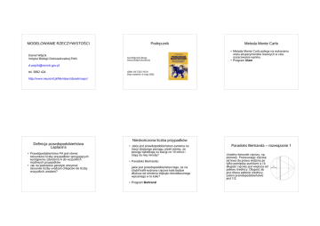 MODELOWANIE RZECZYWISTOŚCI Podręcznik Metoda Monte Carlo ● Daniel Wójcik Instytut Biologii Doświadczalnej PAN Iwo Białynicki-Birula Iwona Białynicka-Birula ● Metoda Monte Carlo polega na wykonaniu wielu eksperymentów losowych w celu oszacowania wyniku. Program Ulam [email protected] tel. 5892 424 ISBN: 83-7255-103-0 Data wydania: 6 maja 2002 http://www.neuroinf.pl/Members/danek/swps/ Definicja prawdopodobieństwa Laplace'a ● ● Prawdopodobieństwo PA jest równe stosunkowi liczby przypadków sprzyjających wystąpieniu zdarzenia A do wszystkich możliwych przypadków Jak na podstawie genetyki otrzymać stosunek liczby urodzeń chłopców do liczby wszystkich urodzeń? Nieskończona liczba przypadków ● ● Jakie jest prawdopodobieństwo zastania na stacji stojącego pociągu, jeżeli wiemy, że pociągi wjeżdżają na stację co 10 minut i stoją na niej minutę? Paradoks Bertranda: jakie jest prawdopodobieństwo tego, że na chybił trafił wybrana cięciwa koła będzie dłuższa od ramienia trójkąta równobocznego wpisanego w to koło? ● Program Bertrand Paradoks Bertranda – rozwiązanie 1 Ustalmy kierunek cięciwy, np. pionowy. Przesuwając cięciwę od lewa do prawa widzimy,że tylko pomiędzy punktami a i b długość cięciwy jest większa od połowy średnicy. Długość ab jest równa połowie średnicy, zatem prawdopodobieństwo jest 1/2. Paradoks Bertranda – rozwiązanie 2 Rozważmy cięciwę zaczepioną w jednym punkcie. Zmieniając jej kąt nachylenia względem średnicy w tym punkcie od -90 do +90 stopni dostajemy wszystkie możliwe cięciwy. Te z nich, które tworzą kąt od -30 do +30 stopni ze średnicą są dłuższe od połowy średnicy. Zatem szukane prawdopodobieństwo wynosi 60/180 = 1/3 Paradoks Bertranda – rozwiązanie 3 Wybierzmy przypadkowo dwa punkty na okręgu łącząc je cięciwą. Pierwszy punkt jest dowolny, drugi musi leżeć na jednej trzeciej okręgu naprzeciwko pierwszego punktu, by cięciwa była odpowiednio długa. Zatem prawdopodobieństwo wynosi również 1/3. Ciągi liczb losowych ● ● ● ● Czy ciąg 0,1,0,1,0,1,... jest losowy? Napisz na kartce ciąg zer i jedynek o długości 100 znaków Policz ile jest w tym ciągu podciągów złożonych z trzech, czterech i pięciu jedynek Porównaj z wynikami wygenerowanymi przez program Bernoulli Paradoks Bertranda – rozwiązanie 4 Środek każdej cięciwy leży wewnątrz koła i wyznacza jednoznacznie jej położenie. Stosunek części koła w której leżą środki cięciw spełniających zadany warunek do pola całego koła wynosi 1/4; ta część koła jest również kołem o promieniu równym połowie długości promienia dużego koła. Prawdopodobieństwo wylosowania ciągów samych jedynek Generatory liczb losowych ● ● Komputery generują liczby pseudolosowe, nie losowe Wygenerowane liczby powtarzają się po pewnym czasie. Im dłuższy okres, tym lepszy generator. Im lepieje „potasowane” liczby, tym lepszy generator. ● ● Aby uzyskać samotną jedynkę w binarnym ciągu trzeba wyrzucić po kolei 0,1,0 – prawdopodobieństwo ½ * ½ * ½ = 1/8 Aby uzyskać n jedynek w binarnym ciągu trzeba wyrzucić po kolei 0,1, ... ,1,0 – to daje prawdopodobieństwo n2 1 1 1 1 1 ∗ ∗...∗ ∗ = 2 2 2 2 2 n razy ● Zatem prawdopodobieństwo wyrzucenia 6,7,8 jedynek pod rząd to odpowiednio 1/256, 1/512 i 1/1024 Deska Galtona Deska Galtona ● Pochylona deska z wbitymi gwoździami ułożonymi w trójkąt. Można jej użyć do wizualizacji wielokrotnego rzucania monetą ● Trójkąt Pascala Jeżeli prawdopodobieństwo skoku w prawo lub w lewo na każdym gwoździu jest takie samo, to prawdopodobieństwo rozkładu na ostatnim poziomie dane jest przez trójkąt Pascala Program Galton Trójkąt Pascala powstaje przy obliczaniu n-tej potęgi dwumianu. Każdy współczynnik w trójkącie Pascala równy jest liczbie dróg jakimi można do niego dojść Błądzenie przypadkowe Inne źródła liczb losowych Współczynniki dwumianu ● Liczby w n-tym wierszu trójkąta Pascala, zwane współczynnikami dwumianowymi, oznaczane są symbolem Newtona i dane są wzorem: ● n! kn= k ! n−k ! ● Zatem prawdopodobieństwa trafienia do odpowiedniej przegródki wynoszą p n , k = ● Zachodzi n n! 2n k ! n−k ! ∑k =0 p n , k =1 ● Ruch punktu na prostej lub w przestrzeni o dowolnym wymiarze polegający na wykonywaniu kroków o stałej długości losowo w jednym z kilku wybranych kierunków. Deska Galtona jest równoważna błądzeniu przypadkowemu na prostej. ● ● Tabele liczb losowych, np. rozwinięcia liczb normalnych Pomiary fizyczne odpowiednich układów Spacery losowe – model dyfuzji Prawdopodobieństwo wystąpienia dowolnego tekstu Liczby normalne ponownie ● ● ● ● Błądzenie przypadkowe (spacer losowy) w przestrzeni stanowi model dyfuzji i ruchów Browna – rozprzestrzeniania się cząsteczek w danym środowisku. Średnia odległość od punktu początkowego rośnie z czasem t jak t ● ● Program Smoluchowski ● Kodowanie tekstów w rozwinięciach Liczba normalna – liczba, w której rozwinięciu w danym układzie każdy blok cyfr jest tak samo prawdopodobny jak każdy inny blok tej samej długości Rozwijają liczbę normalną w bazie o podstawie 36 możemy generować losowe teksty: 10 cyfr + 26 liter łacińskich, albo 35 polskich liter i spacja. 1 36 ● Znajdowanie tekstów w rozwinięciach liczb normalnych nie tylko zależy od podstawy ale i od kodowania, tj. od tego co przypiszemy danemu symbolowi w rozwinięciu ● ● 1 10 45 000 000 ≈ 1 60 000 000 czyli w tekście długości 60 mln znaków oba te słowa powinny wystąpić przynajmniej raz Przykład rozwinięcia liczby pi po polsku. Matematyczna teoria informacji zajmuje się pojemnością kanału transmisji informacji, zupełnie abstrahuje od znaczenia, wartości i sensu przekazywanej informacji. Informacja i niepewność to dwie strony tego samego medalu: zdobywając informację usuwamy n