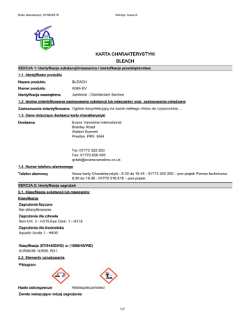 Data aktualizacji: 01/06/2015 Wersja: Issue 8 KARTA CHARAKTERYSTYKI BLEACH SEKCJA 1: Identyfikacja substancji/mieszaniny i identyfikacja przedsiębiorstwa 1.1. Identyfikator produktu Nazwa produktu BLEACH Numer produktu A065 EV Identyfikacja wewnętrzna Janitorial - Disinfectant Section 1.2. Istotne zidentyfikowane zastosowania substancji lub mieszaniny oraz zastosowania odradzane Zastosowania zidentyfikowane Ogólne dezynfekujący na bazie ciekłego chloru do czyszczenia ... 1.3. Dane dotyczące dostawcy karty charakterystyki Dostawca Evans Vanodine International Brierley Road Walton Summit Preston. PR5 8AH Tel: 01772 322 200 Fax: 01772 626 000 [email protected] 1.4. Numer telefonu alarmowego Telefon alarmowy Nowe karty Charakterystyki - 8.30 do 16.45 - 01772 322 200 – pon-piątek Pomoc techniczna 8.30 do 16.45 - 01772 318 818 – pon-piątek SEKCJA 2: Identyfikacja zagrożeń 2.1. Klasyfikacja substancji lub mieszaniny Klasyfikacja Zagrożenia fizyczne Nie sklasyfikowane. Zagrożenia dla zdrowia Skin Irrit. 2 - H315 Eye Dam. 1 - H318 Zagrożenia dla środowiska Aquatic Acute 1 - H400 Klasyfikacja (67/548/EWG) or (1999/45/WE) Xi;R36/38. N;R50. R31. 2.2. Elementy oznakowania Piktogram Hasło ostrzegawcze Niebezpieczeństwo Zwroty wskazujące rodzaj zagrożenia 1/7 Data aktualizacji: 01/06/2015 Wersja: Issue 8 BLEACH H400 Działa bardzo toksycznie na organizmy wodne. H315 Działa drażniąco na skórę. H318 Powoduje poważne uszkodzenie oczu. Zwroty wskazujące środki ostrożności P102 Chronić przed dziećmi. P280 Stosować rękawice ochronne/odzież ochronną/ochronę oczu/ochronę twarzy. P235+P410 Przechowywać w chłodnym miejscu. Chronić przed światłem słonecznym. P301+P330+P331 W PRZYPADKU POŁKNIĘCIA: wypłukać usta. NIE wywoływać wymiotów. P302+P352 W PRZYPADKU KONTAKTU ZE SKÓRĄ: Umyć dużą ilością wody. P332+P313 W przypadku wystąpienia podrażnienia skóry: Zasięgnąć porady/zgłosić się pod opiekę lekarza. P305+P351+P338 W PRZYPADKU DOSTANIA SIĘ DO OCZU: Ostrożnie płukać wodą przez kilka minut. Wyjąć soczewki kontaktowe, jeżeli są i można je łatwo usunąć. Nadal płukać. P315 Natychmiast zasięgnąć porady/zgłosić się pod opiekę lekarza. P501 Zawartość/pojemnik usuwać zgodnie z lokalnymi przepisami. Informacje uzupełniające na etykiecie. EUH031 W kontakcie z kwasami uwalnia toksyczne gazy. Zawiera PODCHLORYN SODU, ROZTWÓR ZAWIERAJĄCY ... % AKTYWNEGO CL 2.3. Inne zagrożenia Produkt nie zawiera żadnych substancji sklasyfikowanych jako PBT lub vPvB. SEKCJA 3: Skład/informacja o składnikach 3.2. Mieszaniny PODCHLORYN SODU, ROZTWÓR ZAWIERAJĄCY ... % AKTYWNEGO CL 3-5% Numer CAS: 7681-52-9 Numer WE: 231-668-3 Współczynnik M (toksyczność ostra) = 10 Klasyfikacja Klasyfikacja (67/548/EWG) or (1999/45/WE) Skin Corr. 1B - H314 C;R34 R31 N;R50 Eye Dam. 1 - H318 Aquatic Acute 1 - H400 Pełny tekst zwrotów wskazujących rodzaj zagrożenia (zwrotów R) i określeń zagrożeń jest przedstawiony w sekcji 16. SEKCJA 4: Środki pierwszej pomocy 4.1. Opis środków pierwszej pomocy Wdychanie Mało prawdopodobna droga narażenia, gdyż produkt nie zawiera substancji lotnych. Jeśli wchłonięto rozpyloną ciecz/mgły, należy wykonać następujące czynności. Przenieść poszkodowanego na świeże powietrze i zapewnić ciepło i odpoczynek w pozycji umożliwiającej oddychanie. Połknięcie Nie wywoływać wymiotów. Podać duże ilości wody do picia. Zasięgnąć pomocy medycznej. Kontakt ze skórą Umyć dużą ilością wody. Zasięgnąć porady medycznej jeśli podrażnienia utrzymują się po umyciu. Kontakt z oczami Natychmiast spłukać dużą ilością wody. Usunąć szkła kontaktowe i otworzyć szeroko powieki. Kontynuować płukanie. Natychmiast wezwać pomoc medyczną. 4.2. Najważniejsze ostre i opóźnione objawy oraz skutki narażenia Informacje ogólne Nasilenie opisanych objawów będzie różnić się w zależności od stężenia i czasu narażenia. 2/7 Data aktualizacji: 01/06/2015 Wersja: Issue 8 BLEACH Wdychanie Podrażnienie nosa, gardła i dróg oddechowych. Połknięcie Może wywoływać złe samopoczucie w przypadku spożycia. Kontakt ze skórą Działa drażniąco na skórę. Długotrwały lub częsty kontakt może powodować zaczerwienienie i podrażnienie. Kontakt z oczami Poważne podrażnienie, pieczenie i łzawienie. Długotrwały kontakt powoduje poważne uszkodzenie oczu i tkanek. 4.3. Wskazania dotyczące wszelkiej natychmiastowej pomocy lekarskiej i szczególnego postępowania z poszkodowanym Wskazówki dla lekarza Leczyć objawowo. SEKCJA 5: Postępowanie w przypadku pożaru 5.1. Środki gaśnicze Odpowiednie środki gaśnicze Produkt nie jest łatwopalny. Używać środków gaśniczych odpowiednich dla palących się materiałów w najbliższym otoczeniu. 5.2. Szczególne zagrożenia związane z substancją lub mieszaniną Szczególne zagrożenia Produkty rozkładu termicznego lub spalania mogą zawierać następujące substancje: Drażniące gazy lub pary. 5.3. Informacje dla straży pożarnej Specjalny sprzęt ochronny dla strażaków Nosić aparat oddechowy z niezależnym dopływem powietrza i odpowiednie ubranie ochronne. SEKCJA 6: Postępowanie w przypadku niezamierzonego uwolnienia do środowiska 6.1. Indywidualne środki ostrożności, wyposażenie ochronne i procedury w sytuacjach awaryjnych Osobiste środki ostrożności Stosować odzież ochronną, rękawice ochronne oraz ochronę oczu i twarzy. Informacje dotyczące odpowiedniego sprzętu ochrony osobistej, patrz sekcja 8. 6.2. Środki ostrożności w zakresie ochrony środowiska Środki ostrożności w zakresie ochrony środowiska Preparat niebezpieczny dla środowiska: Wycieki i niekontrolowane zrzuty do cieków wodnych muszą być niezwłocznie zgłaszane organom ochrony środowiska lub innym odpowiednim organom. 6.3. Metody i materiały zapobiegające rozprzestrzenianiu się skażenia i służące do usuwania skażenia Metody usuwan
