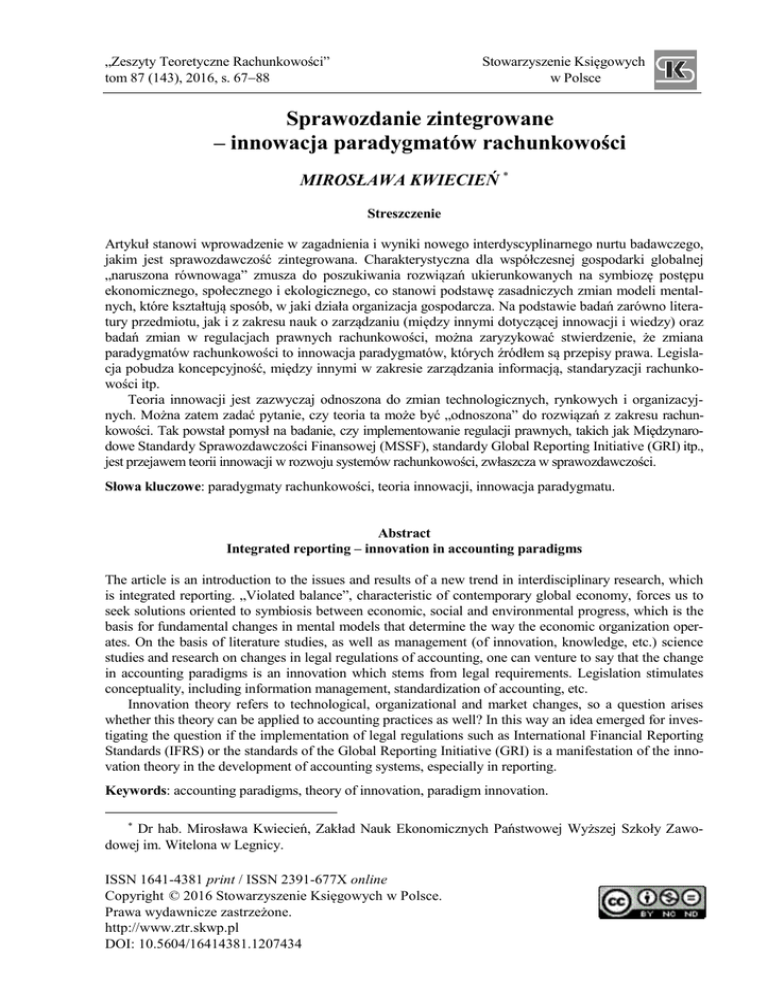 „Zeszyty Teoretyczne Rachunkowości” tom 87 (143), 2016, s. 6788 Stowarzyszenie Księgowych w Polsce Sprawozdanie zintegrowane – innowacja paradygmatów rachunkowości MIROSŁAWA KWIECIEŃ * Streszczenie Artykuł stanowi wprowadzenie w zagadnienia i wyniki nowego interdyscyplinarnego nurtu badawczego, jakim jest sprawozdawczość zintegrowana. Charakterystyczna dla współczesnej gospodarki globalnej „naruszona równowaga” zmusza do poszukiwania rozwiązań ukierunkowanych na symbiozę postępu ekonomicznego, społecznego i ekologicznego, co stanowi podstawę zasadniczych zmian modeli mentalnych, które kształtują sposób, w jaki działa organizacja gospodarcza. Na podstawie badań zarówno literatury przedmiotu, jak i z zakresu nauk o zarządzaniu (między innymi dotyczącej innowacji i wiedzy) oraz badań zmian w regulacjach prawnych rachunkowości, można zaryzykować stwierdzenie, że zmiana paradygmatów rachunkowości to innowacja paradygmatów, których źródłem są przepisy prawa. Legislacja pobudza koncepcyjność, między innymi w zakresie zarządzania informacją, standaryzacji rachunkowości itp. Teoria innowacji jest zazwyczaj odnoszona do zmian technologicznych, rynkowych i organizacyjnych. Można zatem zadać pytanie, czy teoria ta może być „odnoszona” do rozwiązań z zakresu rachunkowości. Tak powstał pomysł na badanie, czy implementowanie regulacji prawnych, takich jak Międzynarodowe Standardy Sprawozdawczości Finansowej (MSSF), standardy Global Reporting Initiative (GRI) itp., jest przejawem teorii innowacji w rozwoju systemów rachunkowości, zwłaszcza w sprawozdawczości. Słowa kluczowe: paradygmaty rachunkowości, teoria innowacji, innowacja paradygmatu. Abstract Integrated reporting – innovation in accounting paradigms The article is an introduction to the issues and results of a new trend in interdisciplinary research, which is integrated reporting. „Violated balance”, characteristic of contemporary global economy, forces us to seek solutions oriented to symbiosis between economic, social and environmental progress, which is the basis for fundamental changes in mental models that determine the way the economic organization operates. On the basis of literature studies, as well as management (of innovation, knowledge, etc.) science studies and research on changes in legal regulations of accounting, one can venture to say that the change in accounting paradigms is an innovation which stems from legal requirements. Legislation stimulates conceptuality, including information management, standardization of accounting, etc. Innovation theory refers to technological, organizational and market changes, so a question arises whether this theory can be applied to accounting practices as well? In this way an idea emerged for investigating the question if the implementation of legal regulations such as International Financial Reporting Standards (IFRS) or the standards of the Global Reporting Initiative (GRI) is a manifestation of the innovation theory in the development of accounting systems, especially in reporting. Keywords: accounting paradigms, theory of innovation, paradigm innovation. Dr hab. Mirosława Kwiecień, Zakład Nauk Ekonomicznych Państwowej Wyższej Szkoły Zawodowej im. Witelona w Legnicy. * ISSN 1641-4381 print / ISSN 2391-677X online Copyright © 2016 Stowarzyszenie Księgowych w Polsce. Prawa wydawnicze zastrzeżone. http://www.ztr.skwp.pl DOI: 10.5604/16414381.1207434 Mirosława Kwiecień 68 Wprowadzenie Nauki ekonomiczne, w tym rachunkowość, bardzo znacząco poszerzają przedmiot badań, poszukując immanentnych dla siebie metod badawczych i porządkując wiedzę o paradygmatach czy też o prawidłowościach. Inspiracją dla niniejszego artykułu były między innymi rozważania zawarte w publikacji A. Szychty (2013), a zwłaszcza stwierdzenia, które autorka formułuje na podstawie rozważań T.S. Kuhna (1985). „Wydaje się, że przyczyną braku spójności badaczy w kwestii paradygmatu rachunkowości był fakt, że schemat rozwoju nauki nakreślony przez Kuhna odnosi się do nauk przyrodniczych. Kuhn twierdził, że rozwój nauki polega na formułowaniu określonych teorii opartych na pewnym paradygmacie w etapie jej rozwoju zwanym nauką normalną, trwającym aż do momentu wystąpienia kryzysu wyrażającego się brakiem możliwości rozwiązania coraz większej liczby problemów naukowych zgodnie z regułami aktualnego paradygmatu. Dochodzi więc do rewolucji naukowej, która przynosi radykalną i postępową zmianę paradygmatu” (Szychta, 2013, s. 245). Na tym tle nasuwa się pytanie, czy teoria normatywna jako metoda działania poznawczego rozstrzygnie dyskurs o paradygmatach rachunkowości. Celem podjętych badań jest próba udzielenia odpowiedzi na pytanie, czy sprawozdanie zintegrowane będzie wskazaniem norm dla praktyki rachunkowości z zastosowaniem pytań badawczych, jak powinno być, co powinno być, co należy zastosować? Czy sprawozdanie zintegrowane „uprawomocnia” zrównoważony rozwój, czyli ekonomię umiaru i będzie stanowić o dominującym paradygmacie rachunkowości – „sposobu albo narzędzia utrzymania i usankcjonowania społecznego i ekonomicznego porządku w obrębie określonej społeczności” (Szychta, 2013, s. 246). Osią rozważań są paradygmaty rachunkowości – badania o charakterze interpretacyjnym i krytycznym zarówno literatury przedmiotu, jak i innych dyscyplin naukowych, zwłaszcza ekonomii, filozofii ekonomii oraz regulacji prawnych i analiz empirycznych. Szczególnie ważnym źródłem moich dociekań naukowych były prezentacje wyników badań prowadzonych przez ekonomistów z różnych dyscyplin naukowych w rozumieniu klasyfikacji nauk (Babuśka, 2013), między innymi ekonomii, finansów, nauki o zarządzaniu oraz rachunkowości, na VIII i IX Kongresie Ekonomistów Polskich oraz podczas Zjazdów Katedr Rachunkowości (2013–2015). Wykorzystane metody badawc