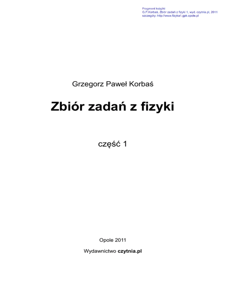 Grzegorz Paweł Korbaś Zbiór zadań z fizyki część 1 Opole 2011 Wydawnictwo czytnia.pl © Copyright by Grzegorz Paweł Korbaś & czytnia.pl Projekt okładki: Agnieszka Paprotna-Bąk Powielanie całości lub części w jakikolwiek sposób bez zgody autora oraz wydawnictwa jest niezgodne z prawem Wydawnictwo: czytnia.pl www.czytnia.pl Druk i oprawa: OPOLGRAF S.A. www.opolgraf.com.pl Opole 2011 Wydanie pierwsze ISBN 978-83-7822-000-8 Spis treści Spis treści............................................................................................................3 Wstęp..................................................................................................................5 Zadania...............................................................................................................7 1.Elementy matematyki.................................................................................7 2.Kinematyka...............................................................................................11 3.Dynamika..................................................................................................17 4.Praca i energia mechaniczna.....................................................................20 5.Bryła sztywna............................................................................................23 6.Grawitacja.................................................................................................27 7.Szczególna teoria względności..................................................................30 Rozwiązania......................................................................................................33 1.Elementy matematyki................................................................................33 2.Kinematyka...............................................................................................46 3.Dynamika..................................................................................................67 4.Praca i energia mechaniczna.....................................................................78 5.Bryła sztywna............................................................................................86 6.Grawitacja.................................................................................................98 7.Szczególna teoria względności................................................................114 Aneks A. Zapis równań na współrzędnych i na wartościach...........................121 Aneks B. Dokładność rozwiązań.....................................................................125 3 4 Wstęp Powstanie zbioru Niniejszy zbiór zadań powstawał w ciągu kilku lat pracy w liceum, w którym autor uczył klasy o profilu matematyczno-fizycznym oraz matematycznoinformatycznym. W pierwszej części zbioru znalazły się zadania, które były rozwiązywane w pierwszej klasie. Uczniowie utrzymujący bardzo dobry poziom rozwiązywali wszystkie prezentowane zadania, co korzystający ze zbioru może potraktować jako wyznacznik zalecanego przez autora poziomu (zadania sprawiające większe problemy zostały oznaczone gwiazdką). Opis zawartości Zbiór powstawał przy założeniu, że powinien zawierać typowe zadania o różnym poziomie trudności do wszystkich treści nauczania - zarówno ze starej jak i nowej podstawy programowej, z zakresu podstawowego oraz rozszerzonego. Wszystkie zadania posiadają swoje pełne rozwiązania. Zdaniem autora naukę fizyki należy prowadzić tak, aby mieć pewność, że w rozwoju nie przeszkadzają braki matematyczne. W związku z tym pierwsze zadania związane są z elementami matematyki i można je przećwiczyć w całości na początku lub sięgać do nich, w miarę potrzeby, w trakcie rozwiązywania zadań z innych działów. Kolejne trzy działy (kinematyka, dynamika, praca i energia mechaniczna) powinny być ćwiczone w podanej kolejności, a dopiero po ich opanowaniu warto przystąpić (w dowolnej kolejności) do przećwiczenia pozostałych działów. Autor nie dołączył do zbioru części powtórkowych, zakładając, że praca ze zbiorem stanowi uzupełnienie tradycyjnego toku nauki opartego na kontakcie z nauczycielem, podręcznikiem i innymi źródłami, w których można znaleźć odpowiednie prawa i wzory niezbędne do prawidłowego rozwiązania zadań. W aneksach do zbioru autor nakreślił często pojawiające się przy zadaniach problemy. W aneksie A omówiono zagadnienie sposobu zapisu równań. Aneks B związany jest z dokładnością rozwiązań i zdaniem autora warto go przestudiować przed rozpoczęciem pracy ze zbiorem. Sposób korzystania ze zbioru Z punktu widzenia dydaktycznego autor proponuje uczniom korzystać ze zbioru zgodnie z następującym schematem: 1. Uczeń samodzielnie wykonuje dane zadanie i porównuje całe rozwiązania (nie tylko odpowiedzi). 2. Jeśli rozwiązanie nie jest poprawne lub uczeń w ogóle nie potrafi rozwiązać danego zadania, to zapoznaje się z rozwiązaniem. Jeśli w rozwiązaniu są elementy niezrozumiałe, to uczy się uzupełniając braki i korzystając z różnych źródeł (nauczyciel, podręcznik, Internet, dyskusje koleżeńskie) tak, aby w pełni zrozumieć rozwiązanie. 5 3. Po 2-3 dniach od pełnego zrozumienia rozwiązania uczeń ponownie podejmuje próbę samodzielnego rozwiązania zadania. Takie postępowanie można powtarzać aż do skutku. 4. W wymieniony sposób uczeń rozwiązuje tyle zadań ile potrafi lub ile zostało mu wskazane przez nauczyciela. 5. Po przerobieniu całego działu, po pewnym czasie (1-2 miesiącach) uczeń wybiera losowo 3-4 zadania i robi sobie samodzielnie sprawdzian. Takie sprawdziany z przerobionych działów uczeń może ponawiać np. co pół roku. Jest to dobra metoda utrwalania materiału i stopniowego przygotowania do matury. Należy pamiętać, że rozwiązywanie typowych zadań z fizyki jest tylko jednym z elementów nauki tego przedmiotu. Równocze