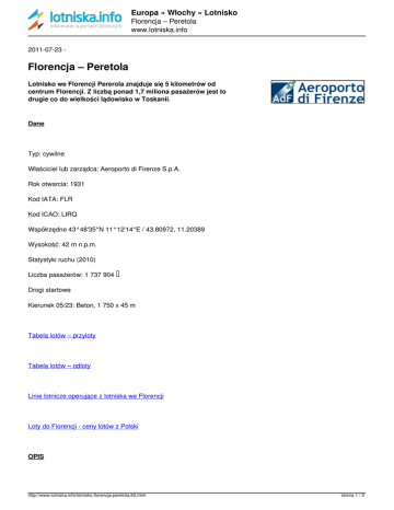 Europa » Włochy » Lotnisko Florencja – Peretola www.lotniska.info 2011-07-23 - Florencja – Peretola Lotnisko we Florencji Pererola znajduje się 5 kilometrów od centrum Florencji. Z liczbą ponad 1,7 miliona pasażerów jest to drugie co do wielkości lądowisko w Toskanii. Dane Typ: cywilne Właściciel lub zarządca: Aeroporto di Firenze S.p.A. Rok otwarcia: 1931 Kod IATA: FLR Kod ICAO: LIRQ Współrzędne 43°48'35″N 11°12'14″E / 43.80972, 11.20389 Wysokość: 42 m n.p.m. Statystyki ruchu (2010) Liczba pasażerów: 1 737 904 ▲ Drogi startowe Kierunek 05/23: Beton, 1 750 x 45 m Tabela lotów – przyloty Tabela lotów – odloty Linie lotnicze operujące z lotniska we Florencji Loty do Florencji - ceny lotów z Polski OPIS http://www.lotniska.info/lotnisko,florencja-peretola,65.html strona 1 / 3 Europa » Włochy » Lotnisko Florencja – Peretola www.lotniska.info Lotnisko we Florencji imienia wielkiego włoskiego podróżnika Amerigo Vespucci posiada dość niewielki pas startowy który mierzy sobie 1750 metrów długości i 30 metrów szerokości. Zarządcą lotniska jest firma AdF S.p.A. notowana na giełdzie w Mediolanie. Lotnisko oferuje połączenia krajowe jak i międzynarodowe, współpracuje głównie z narodowymi liniami lotniczymi. Lotnisko jest główną bazą dla linii Meridiana. Lotnisko zaopatrzone jest w 23 stanowiska check-in. Prezentacja lotniska we Florencjii (video) HISTORIA Historia lotniska wiąże się z rokiem 1938 kiedy to zapoczątkowano budowę pasu startowego o długości 1000 metrów i szerokości 60 metrów. W latach 40-tych na lotnisku rozpoczęto pierwsze loty pasażerskie. W 1984 doszło do wydłużenia pasa startowego do 1400 metrów. Po roku 1992 wybudowano terminal przylotów jak i odlotów, również dokonano ponownego wydłużenia pasa startowego o 250 metrów. DOJAZD Lotnisko w Florencji połączone jest ze stacją kolejową we Florencji poprzez autobusy Vola In bus firmy ATAF i Sita. Ataf: Tel. +39 800/424500 - http://www.ataf.net/ Sita: Tel. +39 800/373760 - www.sita-on-line.it Godziny kursowania http://www.aeroporto.firenze.it/IT/index.php?percorso=contents&jk=17&curr=0 Z lotniska we Florencji na lotnisko w Pizie kursuje autobus Terravision (cena biletu 10 euro) Taxi Cena kursu z lotniska do centrum Florencji to koszt rzędu 20-25 EUR, czas przejazdu 15 minut. Wypożyczanie samochodów Na lotnisku działają takie firmy jak: Auto Europa/Sicily by Car http://www.lotniska.info/lotnisko,florencja-peretola,65.html strona 2 / 3 Europa » Włochy » Lotnisko Florencja – Peretola www.lotniska.info Avis Budget Autonoleggio Europcar Hertz Italy by Car Maggiore/National http://www.lotniska.info/lotnisko,florencja-peretola,65.html http://www.lotniska.info/lotnisko,florencja-peretola,65.html Powered by TCPDF (www.tcpdf.org) strona 3 / 3