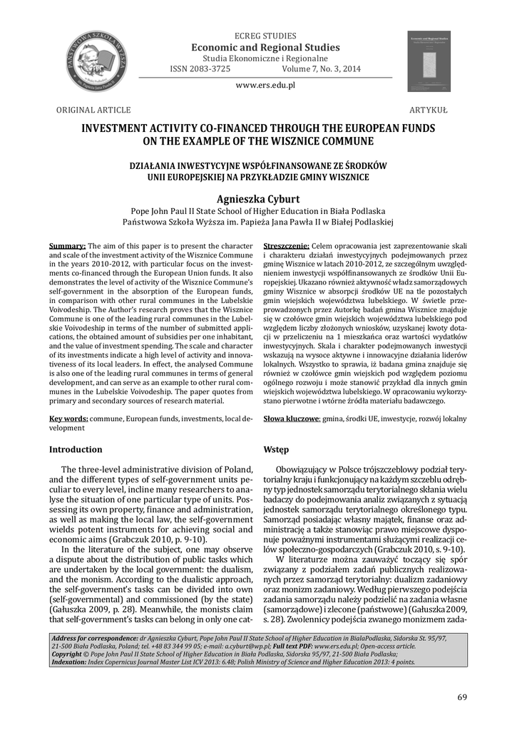 ECREG STUDIES Economic and Regional Studies Studia Ekonomiczne i Regionalne ISSN 2083-3725 Volume 7, No. 3, 2014 www.ers.edu.pl ORIGINAL ARTICLE ARTYKUŁ INVESTMENT ACTIVITY CO-FINANCED THROUGH THE EUROPEAN FUNDS ON THE EXAMPLE OF THE WISZNICE COMMUNE DZIAŁANIA INWESTYCYJNE WSPÓŁFINANSOWANE ZE ŚRODKÓW UNII EUROPEJSKIEJ NA PRZYKŁADZIE GMINY WISZNICE Agnieszka Cyburt Pope John Paul II State School of Higher Education in Biała Podlaska Państwowa Szkoła Wyższa im. Papieża Jana Pawła II w Białej Podlaskiej Summary: The aim of this paper is to present the character and scale of the investment activity of the Wisznice Commune in the years 2010-2012, with particular focus on the investments co- inanced through the European Union funds. It also demonstrates the level of activity of the Wisznice Commune’s self-government in the absorption of the European funds, in comparison with other rural communes in the Lubelskie Voivodeship. The Author’s research proves that the Wisznice Commune is one of the leading rural communes in the Lubelskie Voivodeship in terms of the number of submitted applications, the obtained amount of subsidies per one inhabitant, and the value of investment spending. The scale and character of its investments indicate a high level of activity and innovativeness of its local leaders. In effect, the analysed Commune is also one of the leading rural communes in terms of general development, and can serve as an example to other rural communes in the Lubelskie Voivodeship. The paper quotes from primary and secondary sources of research material. Streszczenie: Celem opracowania jest zaprezentowanie skali i charakteru działań inwestycyjnych podejmowanych przez gminę Wisznice w latach 2010-2012, ze szczególnym uwzględnieniem inwestycji współ inansowanych ze środków Unii Europejskiej. Ukazano również aktywność władz samorządowych gminy Wisznice w absorpcji środków UE na tle pozostałych gmin wiejskich województwa lubelskiego. W świetle przeprowadzonych przez Autorkę badań gmina Wisznice znajduje się w czołówce gmin wiejskich województwa lubelskiego pod względem liczby złożonych wniosków, uzyskanej kwoty dotacji w przeliczeniu na 1 mieszkańca oraz wartości wydatków inwestycyjnych. Skala i charakter podejmowanych inwestycji wskazują na wysoce aktywne i innowacyjne działania liderów lokalnych. Wszystko to sprawia, iż badana gmina znajduje się również w czołówce gmin wiejskich pod względem poziomu ogólnego rozwoju i może stanowić przykład dla innych gmin wiejskich województwa lubelskiego. W opracowaniu wykorzystano pierwotne i wtórne źródła materiału badawczego. Key words: commune, European funds, investments, local development Słowa kluczowe: gmina, środki UE, inwestycje, rozwój lokalny Introduction Wstęp The three-level administrative division of Poland, and the different types of self-government units peculiar to every level, incline many researchers to analyse the situation of one particular type of units. Possessing its own property, inance and administration, as well as making the local law, the self-government wields potent instruments for achieving social and economic aims (Grabczuk 2010, p. 9-10). In the literature of the subject, one may observe a dispute about the distribution of public tasks which are undertaken by the local government: the dualism, and the monism. According to the dualistic approach, the self-government’s tasks can be divided into own (self-governmental) and commissioned (by the state) (Gałuszka 2009, p. 28). Meanwhile, the monists claim that self-government’s tasks can belong in only one cat- Obowiązujący w Polsce trójszczeblowy podział terytorialny kraju i funkcjonujący na każdym szczeblu odrębny typ jednostek samorządu terytorialnego skłania wielu badaczy do podejmowania analiz związanych z sytuacją jednostek samorządu terytorialnego określonego typu. Samorząd posiadając własny majątek, inanse oraz administrację a także stanowiąc prawo miejscowe dysponuje poważnymi instrumentami służącymi realizacji celów społeczno-gospodarczych (Grabczuk 2010, s. 9-10). W literaturze można zauważyć toczący się spór związany z podziałem zadań publicznych realizowanych przez samorząd terytorialny: dualizm zadaniowy oraz monizm zadaniowy. Według pierwszego podejścia zadania samorządu należy podzielić na zadania własne (samorządowe) i zlecone (państwowe) (Gałuszka 2009, s. 28). Zwolennicy podejścia zwanego monizmem zada- Address for correspondence: dr Agnieszka Cyburt, Pope John Paul II State School of Higher Education in BialaPodlaska, Sidorska St. 95/97, 21-500 Biała Podlaska, Poland; tel. +48 83 344 99 05; e-mail: [email protected]; Full text PDF: www.ers.edu.pl; Open-access article. Copyright © Pope John Paul II State School of Higher Education in Biała Podlaska, Sidorska 95/97, 21-500 Biała Podlaska; Indexation: Index Copernicus Journal Master List ICV 2013: 6.48; Polish Ministry of Science and Higher Education 2013: 4 points. 69 ECREG STUDIES, Vol. 7, No 3, 2014, Investment activity co- inanced... egory, which includes all activities undertaken in the self-government’s name and on its responsibility (Dolnicki 2001, p. 166). Moreover, the tasks can be divided into four basic groups: technical infrastructure, social infrastructure, public order and safety, spatial and ecological order. However, it has to be noted that particular types of units deal only with selected aspects of the areas mentioned above. The primary task of self-governments is to cater to the needs of local inhabitants, and to develop the unit itself. They engage in investment activity in order to improve the living conditions of the inhabitants of their units. Local investment policy provides new job opportunities, improves technical infrastructure, and answers the needs of people and businesses with increasing ef iciency. At local level, there are many obstacles to the developm