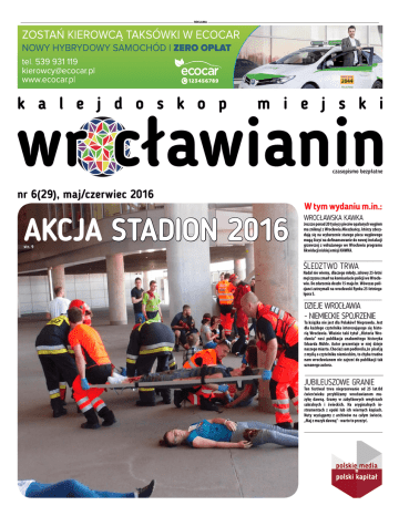 REKLAMA czasopismo bezpłatne nr 6(29), maj/czerwiec 2016 AKCJA STADION 2016 str. 9 W tym wydaniu m.in.: WROCŁAWSKA KAWKA Jeszcze ponad 20 tysięcy pieców opalanych węglem ma zniknąć z Wrocławia.Mieszkańcy, którzy zdecydują się na wyburzenie starego pieca węglowego mogą liczyć na dofinansowanie do nowej instalacji grzewczej z wdrażanego we Wrocławiu programu likwidacji niskiej emisji KAWKA. ŚLEDZTWO TRWA Nadal nie wiemy, dlaczego młody, zdrowy 25-letni mężczyzna zmarł na komisariacie policji we Wrocławiu. Do zdarzenia doszło 15 maja br. Wówczas policjanci zatrzymali na wrocławski Rynku 25-letniego Igora S. DZIEJE WROCŁAWIA - NIEMIECKIE SPOJRZENIE Ta książka nie jest dla Polaków? Nieprawda. Jest dla każdego czytelnika interesującego się historią Wrocławia. Właśnie taki tytuł „Historia Wrocławia” nosi publikacja znakomitego historyka Eduarda Mühle. Autor prezentuje w niej dzieje naszego miasta. Chociaż sam podkreśla,że pisał ją z myślą o czytelniku niemieckim, to chyba trudno nam wrocławianom nie zajrzeć do publikacji tak uznanego autora. JUBILEUSZOWE GRANIE Ten festiwal trwa nieprzerwanie od 25 lat.Od ćwierćwieku przybliżamy wrocławianom muzykę dawną. Gramy w zabytkowych wnętrzach sakralnych i świeckich. Na oryginalnych instrumentach z epoki lub ich wiernych kopiach. Nuty wyciągamy z archiwów na całym świecie. „Maj z muzyk dawną” - warto to przeżyć. polskie media = polski kapitał Z DRUGIEJ STRONY www.wroclawianin.info ZAMIAST WSTĘPNIAKA tegoroczne mistrzostwa i ustawić sobie jako czasoumilacz na telefonie - dzownicie do mnie - to będziecie słyszeć słowa wsparcia naszej drużyny. No i niestety, kompletnie nie wiem, czy i jaki mamy oficjalny hymn na Euro 2016. Znalazłam kilka propozycji różnych wykonawców, żadna jednak nie porywa czy choćby denerwuje tak, jak słynne „Koko, koko, Euro spoko”. Zatem, jak w tytule - zamiast wstępniaka - proponuję przypomnieć sobie ten utwór, bo miał charakter - jak nasza drużyna. Autorem jest oczywiście zespół Jarzębina. Doskwiera mi upał. Lato jeszcze się nie zaczęło, a ja już mam go dosyć. Szczerze mówiąc, niezbyt lubię duszne dni w mieście, kiedy między murami nie ma wiatru, a na niebie kłębią się ciężkie chmury. Pogoda nie może się zdecydować, czy uraczyć nas deszczem czy dopiec słońcem. Wiem, narzekam jak typowy Polak. Mistrzostwa Europy jeszcze się na dobre nie zaczęły, a my już pakujemy naszych i każemy im wracać do domu. A ja nie. Chociaż nie jestem wielkim fanem piłki nożnej, to kibicuję wszystkim Polakom, którzy robią dobre rzeczy. Wspieram sportowców, ludzi kultury, przedsiębiorców odnoszących sukcesy na zagranicznych rynkach. Wspieram też naszych piłkarzy. Niech znawcy mówią, co chcą - widzę ogromny progres w stosunku do Euro 2012. Widzę dobrą drużynę, w której każdemu zależy na zwycięstwie. Dlatego postanowiłam znaleźć hymn naszej drużyny na Cieszą się Polacy, cieszy Ukraina, Że tu dla nas wszystkich Euro się zaczyna, Że tu dla nas wszystkich Euro się zaczyna. Hej! /Kokokoko Euro Spoko, Piłka leci hen wysoko, wszyscy razem zaśpiewajmy, naszym HOROSKOP WRÓŻKI HONORATY doping dajmy. /2x Nasi dzielni chłopcy to biało-czerwoni, Wygrać im się uda Ucieszy się Smuda Wygrać im się uda Ucieszy się Smuda Hej! /Kokokoko Euro Spoko, Piłka leci hen wysoko, wszyscy razem zaśpiewajmy, naszym doping dajmy. /2x Orzełki biegajcie żwawo po murawie, Zdobywajcie gole i będzie po sprawie Zdobywajcie gole i będzie po sprawie /Kokokoko Euro Spoko, Piłka leci hen wysoko, wszyscy razem zaśpiewajmy, naszym doping dajmy. /2x Nie myśl sobie bracie, że rady nie damy Nie kłopocz się siostro My euro wygramy Iza Siwińska Baran (21.03-20.04) Odnówcie waszą wielką miłość. Wystarczy, że przypomnicie sobie, co robiliście na początku waszego związku. Byk (21.04-20.05) Grunt to rodzina. Dziś będziesz mógł to powiedzieć bez cienia sarkazmu. Bliscy wesprą cię w bardzo trudnym dla ciebie momencie. Bliźnięta (21.05-21.06) Nie zabraknie ci dobrego humoru. Twoje samopoczucie będzie widoczne i zaraźliwe, dlatego wszyscy wokół ciebie będą dziś równie szczęśliwi. Rak (22.06-22.07) Z wielką radością przekonasz się, że twój partner jest nie tylko miłością twojego życia, ale również najlepszym przyjacielem. W chwilach trudnych możesz liczyć na jego pomoc. Lew (23.07-23.08) Poczujesz potrzebę znalezienia nowych znajomych. Może nie zawsze odnajdujesz nić porozumienia z dotychczasowymi. To dobre rozwiązanie. ZŁOWIONE W SIECI Panna (24.08-23.09) Bardzo prawdopodobne sukcesu w sferze materialnej. Jeżeli dobrze zainwestujesz dziś swoje pieniądze, masz spore szanse na wielkie zyski. Poradź się znajomych, którzy znają się na tym. Waga (24.09-23.10) Stracisz grunt pod nogami. Nie martw się jednak i postaraj uspokoić. Rozmowa z przyjacielem pozwoli - Kochanie, co byś zrobiła gdybym wygrał w lotka? - Wzięłabym połowę i się wyprowadziła. - To masz tu 5 zł i pakuj się. - Tak. - Jakim? - Czarny Chrysler 300C, sedan, silnik 6.1 HEMI, wersja SRT8, skórzana tapicerka... Dzień dobry, chciałbym zgłosić zaginięcie żony. WYjechała na zakupy rano i do tej pory nie wróciła. - OK. Jakiego jest wzrostu? - Nie wiem dokładnie. Dość niska. - Budowa ciała? - Raczej normalna. - Kolor oczu? - W sumie nie wiem. - Kolor włosów? - Ciężko powiedzieć, co chwila farbuje. - W co była ubrana? - Nie wiem, nie zwróciłem uwagi. - Pojechała samochodem? W sklepie: - Proszę cacao? - Nie ma - ekspedientka odpowiada. - Jak nie ma, jak jest - upiera się klient i wskazuje: - o, tu stoi! - A... To kakao - wyjaśnia sklepowa. I dodaje: -To nie wie pan, że ce czyta się jak ka? Co jeszcze podać? - Kukier! - Mówi się „cukier” ci szybko znaleźć rozwiązanie z tej sytuacji. Skorpion (24.10-22.11) Uważaj na wydatki, by za chwilę się nie okazało, że będziesz musi