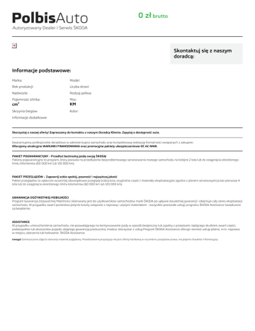 0 zł brutto Skontaktuj się z naszym doradcą: Informacje podstawowe: Marka: Model: Rok produkcji: Liczba drzwi: Nadwozie: Rodzaj paliwa: Pojemność silnika: Moc: cm3 KM Skrzynia biegów: Kolor: Informacje dodatkowe: Skorzystaj z naszej oferty! Zapraszamy do kontaktu z naszym Doradcą Klienta. Zapytaj o dostępność auta. Gwarantujemy profesjonalne doradztwo w zakresie kupna samochodu oraz kompleksową realizację formalności związanych z zakupem. Oferujemy atrakcyjne WARUNKI FINANSOWANIA oraz promocyjne pakiety ubezpieczeniowe OC AC NNW. PAKIET POGWARANCYJNY - Przedłuż beztroską jazdę swoją ŠKODĄ! Pakiety pogwarancyjne to program, który pozwala na przedłużenie bezproblemowego serwisowania nowego samochodu na kolejne 2 lata lub do osiągnięcia określonego limitu kilometrów (60 000 km lub 120 000 km). PAKIET PRZEGLĄDÓW – Zapewnij sobie spokój, pewność i najwyższą jakość Pakiet przeglądów to opłacone wcześniej obowiązkowe przeglądy (robocizna, oryginalne części i materiały eksploatacyjne zgodne z planem serwisowym) przez pierwsze 4 lata lub do osiągnięcia określonego limitu kilometrów (60 000 km lub 120 000 km). GWARANCJA DOŻYWOTNIEJ MOBILNOŚCI Program Gwarancja Dożywotniej Mobilności skierowany jest do użytkowników samochodów marki ŠKODA po upływie dwuletniej gwarancji i obejmuje cały okres eksploatacji samochodu. W przypadku awarii poniesiesz jedynie koszty związane z naprawą i użytymi materiałami - wszystkie pozostałe usługi programu ŠKODA Assistance świadczone są bezpłatnie. ASSISTANCE W przypadku unieruchomienia samochodu, nie pozwalającego na kontynuowanie jazdy w sposób bezpieczny lub zgodny z przepisami, będącego skutkiem awarii części, podzespołów lub akcesoriów pojazdu objętego gwarancją producenta, możesz skorzystać z usług Program ŠKODA Assistance oferuje również usługi płatne, m.in. naprawa w miejscu zdarzenia lub holowanie. ŠKODA Assistance. Uwaga! Zamieszczone zdjęcia stanowią materiał poglądowy. Przedstawiona propozycja nie jest ofertą handlową w rozumieniu przepisów prawa, ma jedynie charakter informacyjny.