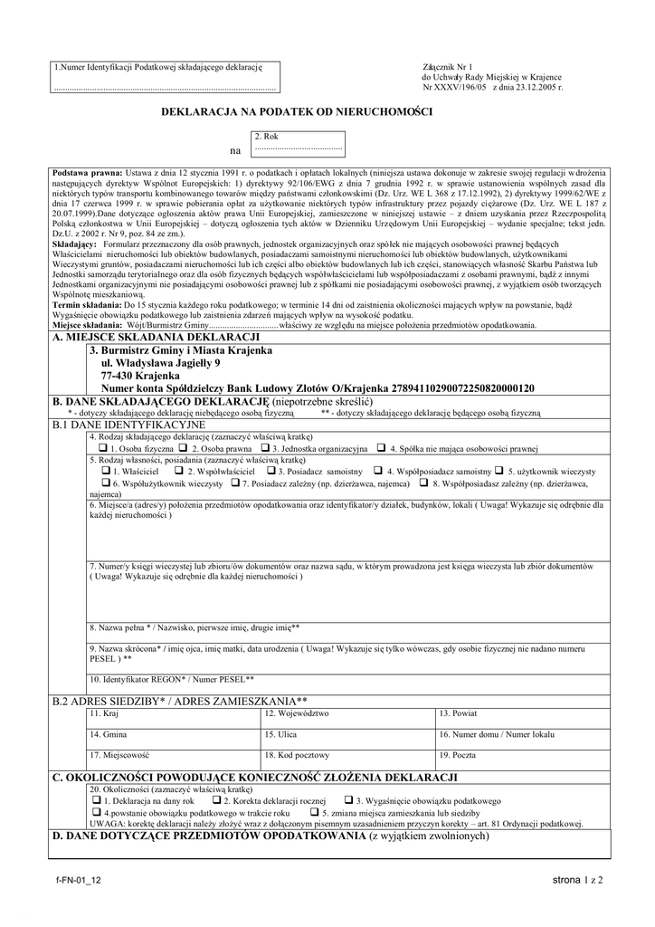 Załącznik Nr 1 do Uchwały Rady Miejskiej w Krajence Nr XXXV/196/05 z dnia 23.12.2005 r. 1.Numer Identyfikacji Podatkowej składającego deklarację ................................................................................................... DEKLARACJA NA PODATEK OD NIERUCHOMOŚCI na 2. Rok ....................................... Podstawa prawna: Ustawa z dnia 12 stycznia 1991 r. o podatkach i opłatach lokalnych (niniejsza ustawa dokonuje w zakresie swojej regulacji w drożenia następujących dyrektyw Wspólnot Europejskich: 1) dyrektywy 92/106/EWG z dnia 7 grudnia 1992 r. w sprawie ustanowienia wspólnych zasad dla niektórych typów transportu kombinowanego towarów między państwami członkowskimi (Dz. Urz. WE L 368 z 17.12.1992), 2) dyrektywy 1999/62/WE z dnia 17 czerwca 1999 r. w sprawie pobierania opłat za użytkowanie niektórych typów infrastruktury przez pojazdy ciężarowe (Dz. Urz. WE L 187 z 20.07.1999).Dane dotyczące ogłoszenia aktów prawa Unii Europejskiej, zamieszczone w niniejszej ustawie – z dniem uzyskania przez Rzeczpospolitą Polską członkostwa w Unii Europejskiej – dotyczą ogłoszenia tych aktów w Dzienniku Urzędowym Unii Europejskiej – wydanie specjalne; tekst jedn. Dz.U. z 2002 r. Nr 9, poz. 84 ze zm.). Składający: Formularz przeznaczony dla osób prawnych, jednostek organizacyjnych oraz spółek nie mających osobowości prawnej będących Właścicielami nieruchomości lub obiektów budowlanych, posiadaczami samoistnymi nieruchomości lub obiektów budowlanych, użytkownikami Wieczystymi gruntów, posiadaczami nieruchomości lub ich części albo obiektów budowlanych lub ich części, stanowiących własność Skarbu Państwa lub Jednostki samorządu terytorialnego oraz dla osób fizycznych będących współwłaścicielami lub współposiadaczami z osobami prawnymi, bądź z innymi Jednostkami organizacyjnymi nie posiadającymi osobowości prawnej lub z spółkami nie posiadającymi osobowości prawnej, z wyjątkiem osób tworzących Wspólnotę mieszkaniową. Termin składania: Do 15 stycznia każdego roku podatkowego; w terminie 14 dni od zaistnienia okoliczności mających wpływ na powstanie, bądź Wygaśnięcie obowiązku podatkowego lub zaistnienia zdarzeń mających wpływ na wysokość podatku. Miejsce składania: Wójt/Burmistrz Gminy............................... właściwy ze względu na miejsce położenia przedmiotów opodatkowania. A. MIEJSCE SKŁADANIA DEKLARACJI 3. Burmistrz Gminy i Miasta Krajenka ul. Władysława Jagiełły 9 77-430 Krajenka Numer konta Spółdzielczy Bank Ludowy Złotów O/Krajenka 27894110290072250820000120 B. DANE SKŁADAJĄCEGO DEKLARACJĘ (niepotrzebne skreślić) * - dotyczy składającego deklarację niebędącego osobą fizyczną ** - dotyczy składającego deklarację będącego osobą fizyczną B.1 DANE IDENTYFIKACYJNE 4. Rodzaj składającego deklarację (zaznaczyć właściwą kratkę) q 1. Osoba fizyczna q 2. Osoba prawna q 3. Jednostka organizacyjna q 4. Spółka nie mająca osobowości prawnej 5. Rodzaj własności, posiadania (zaznaczyć właściwą kratkę) q 1. Właściciel q 2. Współwłaściciel q 3. Posiadacz samoistny q 4. Współposiadacz samoistny q 5. użytkownik wieczysty q 6. Współużytkownik wieczysty q 7. Posiadacz zależny (np. dzierżawca, najemca) q 8. Współposiadasz zależny (np. dzierżawca, najemca) 6. Miejsce/a (adres/y) położenia przedmiotów opodatkowania oraz identyfikator/y działek, budynków, lokali ( Uwaga! Wykazuje się odrębnie dla każdej nieruchomości ) 7. Numer/y księgi wieczystej lub zbioru/ów dokumentów oraz nazwa sądu, w którym prowadzona jest księga wieczysta lub zbiór dokumentów ( Uwaga! Wykazuje się odrębnie dla każdej nieruchomości ) 8. Nazwa pełna * / Nazwisko, pierwsze imię, drugie imię** 9. Nazwa skrócona* / imię ojca, imię matki, data urodzenia ( Uwaga! Wykazuje się tylko wówczas, gdy osobie fizycznej nie nadano numeru PESEL ) ** 10. Identyfikator REGON* / Numer PESEL** B.2 ADRES SIEDZIBY* / ADRES ZAMIESZKANIA** 11. Kraj 12. Województwo 13. Powiat 14. Gmina 15. Ulica 16. Numer domu / Numer lokalu 17. Miejscowość 18. Kod pocztowy 19. Poczta C. OKOLICZNOŚCI POWODUJĄCE KONIECZNOŚĆ ZŁOŻENIA DEKLARACJI 20. Okoliczności (zaznaczyć właściwą kratkę) q 1. Deklaracja na dany rok q 2. Korekta deklaracji rocznej q 3. Wygaśnięcie obowiązku podatkowego q 4.powstanie obowiązku podatkowego w trakcie roku q 5. zmiana miejsca zamieszkania lub siedziby UWAGA: korektę deklaracji należy złożyć wraz z dołączonym pisemnym uzasadnieniem przyczyn korekty – art. 81 Ordynacji podatkowej. D. DANE DOTYCZĄCE PRZEDMIOTÓW OPODATKOWANIA (z wyjątkiem zwolnionych) f-FN-01_12 strona 1 z 2 Wyszczególnienie Podstawa opodatkowania D.1 POWIERZCHNIA GRUNTÓW (Uwaga! Wykazujemy z dokładnością do 1 m2) 1. związanych z prowadzeniem działalności gospodarczej, 21. bez względu na sposób zakwalifikowania w ewidencji gruntów i budynków ................... m2 2. pod jeziorami, zajętych na zbiorniki wodne retencyjne 24. lub elektrowni wodnych .................... ha 3. pozostałych, w tym: 27. a/ przeznaczonych pod budownictwo letniskowe lub ................... m2 użytkowanych na cele letniskowe, b/ zajęte na prowadzenie odpłatnej statutowej działalności pożytku publicznego przez organizację ................... m2 pożytku publicznego, c/ innych pozostałych ................... m2 D.2 POWIERZCHNIA UŻYTKOWA BUDYNKÓW LUB ICH CZĘŚCI (*) Stawka podatku Kwota podatku w zł, gr wynikająca z Uchwały Rady Miejskiej w zł, gr 22. 23. .................,....... 25. .................,....... 28. .................,....... 26. .................,....... 29. .................,....... . ................,....... ................,....... ................,....... ................,....... ................,....... * Do powierzchni użytkowej budynku lub jego części należy zaliczyć powierzchnię mierzoną, po wewnętrznej 