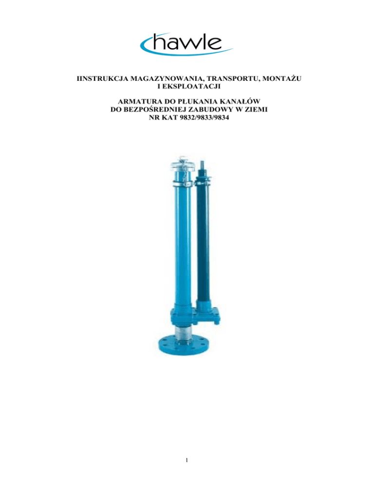 IINSTRUKCJA MAGAZYNOWANIA, TRANSPORTU, MONTAŻU I EKSPLOATACJI ARMATURA DO PŁUKANIA KANAŁÓW DO BEZPOŚREDNIEJ ZABUDOWY W ZIEMI NR KAT 9832/9833/9834 1 Spis treści : 1. PRZEZNACZENIE 2. OPIS PRODUKTU 3. MAGAZYNOWANIE I TRANSPORT 4. MONTAŻ 5. EKSPLOATACJA 6. KONTAKT 2 1. PRZEZNACZENIE Armatura do płukania kanałów nr kat 9832-9834 przeznaczona jest do płukania przewodów, na maksymalne ciśnienie robocze 16 bar. Armatura przeznaczona jest generalnie do bezpośredniej zabudowy w ziemi. Zastosowanie armatury do płukania do bezpośredniej zabudowy w ziemi z punktu widzenia ekonomicznego powoduje znaczną redukcję kosztów inwestycyjnych i obniżkę kosztów konserwacji - serwisowania. Armatura winna być zabudowana w oparciu o projekt techniczny, zgodnie warunkami określonymi przez właściwe normy i warunki techniczne wykonania określone przez użytkownika w sposób uwzględniający zabezpieczenie przed zamarzaniem i możliwość przeprowadzania konserwacji. W obszarze wodociągowym armatura nadaje się również do systemów nawadniania. Medium- woda: - pitna, - ścieki bytowo-gospodarcze. Stosowanie do innego medium, wymaga uzgodnienia z Producentem. 2. OPIS PRODUKTU Cechy konstrukcyjne: - pozwala na uniknięcie wysokich kosztów budowy i eksploatacji studzienek, - eliminuje niebezpieczeństwo związane z pracami serwisowymi w komorach lub studzienkach, - bardzo łatwe płukanie dzięki wolnemu przelotowi rury płuczącej i armaturze odcinającej, - przyłącze rury płuczącej wyposażone w nasadę typu C (52 mm) z pokrywą nasady zabezpieczoną łańcuszkiem, - trzy typy przyłącza do rurociągu: • odejście kołnierzowe proste, • odejście kołnierzowe 45°, • kątowe złącze wciskowe System ISO 90°. Dane techniczne: - maksymalne ciśnienie robocze: 16 bar, - korpus: żeliwo sferoidalne GJS-400, - wrzeciono i płyta odcinająca: stal nierdzewna; płyta w stanie otwartym nie ma kontaktu z przepływającym medium, - przyłącze płuczące: nasada typu C, materiał: aluminium, - zamknięcie: pokrywa z czopem trójkątnym, materiał aluminium, - uszczelka: NBR. Wymiary, ciężary i materiały: Odpowiednie informacje dla poszczególnych typów i wymiarów znajdują się w katalogach HAWLE (woda ) lub na stronie internetowej www.hawle.pl. 3 Zespoły te w wykonaniu kołnierzowym DN50 lub DN80 dostępne są w wersji: z prostym odejściem kołnierzowym nr kat 9834, z odejściem kołnierzowym pod katem 45° kat 9832, z złączem wciskowym typu ISO pod kątem 45° kat 9833, Właściwy dobór armatury ma późniejszy wpływ na sprawność i poprawność działania całego systemu. 3. MAGAZYNOWANIE I TRANSPORT Armaturę do płukania rurociągów należy magazynować i transportować na paletach w położeniu poziomym. Na czas transportu należy zabezpieczyć armaturę przed przemieszczaniem i możliwością powstania uszkodzeń mechanicznych. Pojedyncze wyroby zabezpieczone są na czas transportu poprzez owinięcie folią, większe ilości 4 zabezpieczone są poprzez przekładki z foli pęcherzykowej lub karton. Niedopuszczalne jest z uwagi na możliwość uszkodzenia powłoki, zrzucanie armatury do wykopu, składowanie jedna na drugiej bez przekładek z foli lub kartonu .lub ciągnięcie po terenie itp. Dla zachowania właściwości ochronnych powłoki z żywicy epoksydowej, należy zapobiegać szkodliwym oddziaływaniu pogodowym na powłokę - np. promieniowaniu UV oraz jej uszkodzeniom mechanicznym podczas magazynowania, transportu oraz montażu. Armatury poddanej wpływom promieniowania słonecznego, nie należy przez dłuższy czas przechowywać na wolnym powietrzu. Armatura winna być przechowywana w pomieszczeniach wolnych od zanieczyszczeń mechanicznych, chemicznych i bakteriologicznych. 4. MONTAŻ Przed zamontowaniem należy sprawdzić zgodność otrzymanego wyrobu z zamówieniem oraz z jego przeznaczeniem – istotne elementy to średnica, głębokość zabudowy oraz wartość ciśnienia roboczego na jaką została armatura została dobrana. Armatura przeznaczona do bezpośredniej zabudowy podziemnej może być montowana na rurociągu przy użyciu opaski do nawiercania lub trójnika, zaś wszystkie prace konserwacyjne można prowadzić z poziomu terenu, co znacznie poprawia warunki bezpieczeństwa dla osób dokonujących przeglądu i konserwacji. UWAGA: Armaturę należy montować na rurociągach w pozycji pionowej. Przed zespołami, nie jest wymagane zamontowanie armatury odcinającej gdyż element odcinający wchodzi w skład zespołu. Przed przystąpieniem do montażu należy: sprawdzić czystość wnętrza oraz czołowych powierzchni przyłączy, sprawdzić stan powłoki ochronnej na żeliwnych elementach zaworu (kołnierz mocujący (1.6)-cokół (1.1), w przypadku stwierdzenia drobnych uszkodzeń powłoki należy użyć do ich usunięcia zestawu naprawczego nr kat. 3442 lub farby renowacyjnej nr kat. 4341. 5 Montaż armatury winien się odbywać w sposób eliminujący uderzenia mogące spowodować uszkodzenia powłoki elastomerowej. Sposób i miejsce zabudowy armatury musi uwzględniać zabezpieczenie armatury przed zamarznięciem. Po zamontowaniu armatury należy przeprowadzić próbę ciśnieniową WYPOSAŻENIE DODATKOWE: - skrzynka uliczna do armatury do płukania nr kat 2058, - klucz uruchamiający nr kat 3410, - klucz do nasady nr kat 3460. WYPOSAŻENIE DODATKOWE UŁATWIAJĄCE PROCES PŁUKANIA - stojaki do armatury do płukania Cechy konstrukcyjne: - przeznaczony do montażu na zestawie do płukania kanałów, umożliwiający łatwe i szybkie podłączenie węża z nasadą typu C. Dane techniczne: - max. ciśnienie robocze: 16 bar, - rura i kolano: stal cynkowana 2”, - sprzęgła typu C: aluminium, - zawór kulowy DN2”: mosiądz niklowany - wysokość H: 660 5. EKSPLOATACJA UWAGA: Przed otwarciem nasady należy koniecznie sprawdzić czy armatura jest zamknięta jeśli nie należy ją zamknąć. Armatura uruchamiana jest poprzez wykonanie połowę obrotu 