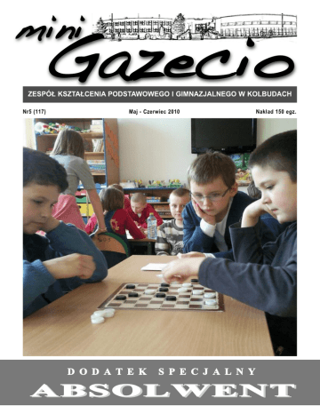 mini Gazecio ZESPÓŁ KSZTAŁCENIA PODSTAWOWEGO I GIMNAZJALNEGO W KOLBUDACH Nr5 (117) Maj - Czerwiec 2010 D O D A T E K S P E C J A L N Y Nakład 150 egz. AB BS O OL W WE N T T Z życia szkoły i językoEG ZA MI N G IMN AZ JAL NY niczą wą. Tym razem J ak co roku, burząc spokój wszystkich nauczycieli i wielu (żeby nie powiedzieć - niektórych) uczniów, w kwietniu odbył się trzydniowy egzamin gimnazjalny. Pisaliśmy część humanistyczną, matematyczno – przyrod- jeszcze nie będą miały wpływu na rekrutację do szkół średnich wyniki naszych umiejętności lingwistycznych, ale w przyszłym roku strzeżcie się koleżanki i koledzy. .. Do egzaminu przystąpiło 170 uczniów, a nad prawidłowością jego przebiegu czuwała również pani z kuratorium. Chyba zawsze jest tak, że uczniowie są zaskakiwani niektórymi pytaniami. I teraz też tak było – nie spodziewaliśmy się niektórych zagadnień z WoS, dotyczących lokalnych samorządów. „Cudze chwalicie, s w e g o n i e z n a c i e ...“ J edni wybierają się w podróż do Wilna, inni do Londynu, a my - drugoklasiści - pojechaliśmy do Warszawy. Program trzydniowej wycieczki był bardzo atrakcyjny i zakładał wizytę, choć krótką, w najważniejszych miejscach stolicy. Byliśmy pod Pałacem Prezydenckim i w Wilanowie, na Powązkach i na Starówce oraz w Parlamencie. W kuluarach sejmu widzieliśmy wielu znanych polityków. Są prawdziwi, czasem trochę inni niż w okienku telewizora. Pstrykaliśmy fotki. Prezentujemy jedną z nich z prezydent Warszawy panią Hanną Gronkiewicz - Walz. Klasa 2A M A R Z E N I A GIMNAZJALISTÓW Z bliża się koniec roku, więc jedno z marzeń uczniów powoli się spełnia ☺ WAKACJE ! Jakie jeszcze są Wasze marzenia ? Trzeciogimnazjaliści marzą o tym, aby dostać się do jak najlepszej szkoły, tej, którą niedawno sobie wybrali. Albo o wspaniałych ocenach, co niestety nie jest już tak prawdopodobne jak dostanie się do szkoły, bo jaki nauczyciel podwyższy ocenę z 3 na 5 ?? Ale nie wszystkie nasze marzenia wiążą się ze szkołą, są też takie, które dotyczą na- 2 szej przyszłości, tej dalszej. Chłopcy marzą o zawodzie mechanika bądź informatyka, a dziewczyny - i tu zdania są podzielone... Jedna chce być fryzjerką, kosmetyczką, inna uważa, że to słabe zawody, że lepiej siedzieć za biurkiem i pracować w dużej firmie. Wielu z nas marzy o dalekich podróżach - tych egzotycznych i nie tylko. Ja na przykład wolałabym jechać/lecieć do Irlandii niż na Hawaje. Pragniemy też uczyć się języków, doskonalić angielski, niemiecki. Czym są w ogóle marzenia z naukowego punktu widzenia? Marzenia dzienne – mówi jakiś tam słownik - fantazje, myśli i wyobrażenia występujące w czasie pełnej świadomości. Mogą sięgać A i kolejność zadań z polskiego spłatała nam figla, który będzie kosztował nas aż 4 punkty. W ogóle z wypracowaniem było coś nie tak - żadnego odwołania do lektury. Podejrzane. Ale my jesteśmy dobrej myśli. ;) Ola 3b O KONCERT statni koncert w tym roku szkolnym -„Wiosna na świecie”, zgodnie z tytułem prezentował melodie i instrumenty świata. Widzieliśmy i słuchaliśmy instrumentów z Afryki i Ameryki Południowej. Wykonawcy reprezentowali trzy kraje: Polskę, Gwatemalę i Peru. Publiczność, czyli klasy I – III i 4 – 6, świetnie bawiła się przy rytmach pieśni Indian i energetycznej samby. Artyści chwalili – jak zwykle – kulturalną aktywność uczniów naszej szkoły. Na następnych koncertach spotkamy się od października. Pani Ania .................................. przeszłości, teraźniejszości lub przyszłości. Dotyczą różnych tematów, wyróżnia się m.in. marzenia o sukcesie, czynach bohaterskich, przygodach. Redakcja życzy Wam wszystkim jak najszybszego spełnienia marzeń ! ☺ Klaudia 2B Na okładce: Turniej gry w warcaby dla kl.0-III Gazeta Zespołu Kształcenia Podstawowego i Gimnazjalnego w Kolbudach. Redagują uczniowie naszej szkoły; opieka: I. Frączek, M. Szenkin Chmielewska, B. Pigoń - Reglińska: wspólpraca: D.Czajkowska, M. Treder, B. Wożniak; fotografie z imprez szkolnych: Janek Kobiela, I. Frączek. Wydawca: ZKPiG 83-050 Kolbudy, ul. Wybickiego 33, tel. (058) 682 72 24, e-mail: [email protected], http://www.kolbudy.neosrtada.pl PIOSENKA K O N K U R S Y E K O L O G I C Z N A B E Z P I E C Z E Ń S T W O RUCHU DROGOWEGO W połowie kwietnia br., w Pruszczu Gd. przeprowadzono powiatowe eliminacje Ogólnopolskiego Turnieju Bezpieczeństwa Ruchu Drogowego. Nasza drużyna w składzie: Anna Bębenek, Zuzanna Zborowska i Patryk Waliński z kl.1F zajęła III miejsce. Serdecznie gratulujemy i życzymy dalszych sukcesów. Pani Mira P INFORMATYCZNY XIII Przegląd Piosenki Ekologicznej odbył się 8 czerwca br.. Organizatorem był Zespół Publicznego Gimnazjum i Szkoły Podstawowej w Przyjaźni. Naszą szkołę reprezentował zespół Bosz, w skład którego wchodzą: Gabrysia Krysiak (gitara, perkusja), Beata Rutkowska (keyboard, perkusja) i Mateusz Słowik (gitara), wszyscy z klasy VA. Wykonali oni dwa utwory: „Ekologia to nie jest łatwa sprawa” (kompozycja własna zespołu) oraz przebój zespołu Bic Cyc „Makumba”. Wszyscy otrzymali albumy o przyrodzie i mapy. Pani Ania o raz trzeci startowaliśmy w ogólnopolskim konkursie wiedzy o Internecie „DialnetMasters Mistrzowie Internetu“, organizowanego przez Dialog i Politechnikę Wrocławską. Z roku na rok konkurencja jest coraz silniejsza. W eliminacjach wojewódzkich brało udział ponad 120 drużyn, do półfinału wchodziło tylko 8. Miłą niespodzianką była informacja, że dwie nasze drużyny: RUF i THE END, awansowały do półfinału w kwietniu br. odbył się Konkurs na Najlepszczego Matematyka Gminy Kolbudy. W klasach VI sp zwyciężyła Karolina Drabent VIC, natomiast w gimnazjum, w klasach 2 Zuzanna Zborowska. Red. W N A J L E P S Z Y M A T E M A T Y K GMINY KOLBUDY W PRZYRODNICZO -EKOLOGICZNY