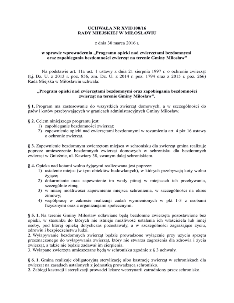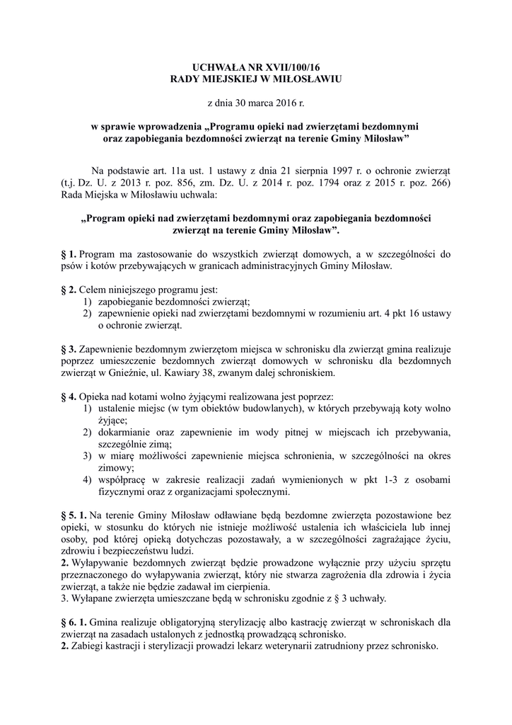 UCHWAŁA NR XVII/100/16 RADY MIEJSKIEJ W MIŁOSŁAWIU z dnia 30 marca 2016 r. w sprawie wprowadzenia „Programu opieki nad zwierzętami bezdomnymi oraz zapobiegania bezdomności zwierząt na terenie Gminy Miłosław” Na podstawie art. 11a ust. 1 ustawy z dnia 21 sierpnia 1997 r. o ochronie zwierząt (t.j. Dz. U. z 2013 r. poz. 856, zm. Dz. U. z 2014 r. poz. 1794 oraz z 2015 r. poz. 266) Rada Miejska w Miłosławiu uchwala: „Program opieki nad zwierzętami bezdomnymi oraz zapobiegania bezdomności zwierząt na terenie Gminy Miłosław”. § 1. Program ma zastosowanie do wszystkich zwierząt domowych, a w szczególności do psów i kotów przebywających w granicach administracyjnych Gminy Miłosław. § 2. Celem niniejszego programu jest: 1) zapobieganie bezdomności zwierząt; 2) zapewnienie opieki nad zwierzętami bezdomnymi w rozumieniu art. 4 pkt 16 ustawy o ochronie zwierząt. § 3. Zapewnienie bezdomnym zwierzętom miejsca w schronisku dla zwierząt gmina realizuje poprzez umieszczenie bezdomnych zwierząt domowych w schronisku dla bezdomnych zwierząt w Gnieźnie, ul. Kawiary 38, zwanym dalej schroniskiem. § 4. Opieka nad kotami wolno żyjącymi realizowana jest poprzez: 1) ustalenie miejsc (w tym obiektów budowlanych), w których przebywają koty wolno żyjące; 2) dokarmianie oraz zapewnienie im wody pitnej w miejscach ich przebywania, szczególnie zimą; 3) w miarę możliwości zapewnienie miejsca schronienia, w szczególności na okres zimowy; 4) współpracę w zakresie realizacji zadań wymienionych w pkt 1-3 z osobami fizycznymi oraz z organizacjami społecznymi. § 5. 1. Na terenie Gminy Miłosław odławiane będą bezdomne zwierzęta pozostawione bez opieki, w stosunku do których nie istnieje możliwość ustalenia ich właściciela lub innej osoby, pod której opieką dotychczas pozostawały, a w szczególności zagrażające życiu, zdrowiu i bezpieczeństwu ludzi. 2. Wyłapywanie bezdomnych zwierząt będzie prowadzone wyłącznie przy użyciu sprzętu przeznaczonego do wyłapywania zwierząt, który nie stwarza zagrożenia dla zdrowia i życia zwierząt, a także nie będzie zadawał im cierpienia. 3. Wyłapane zwierzęta umieszczane będą w schronisku zgodnie z § 3 uchwały. § 6. 1. Gmina realizuje obligatoryjną sterylizację albo kastrację zwierząt w schroniskach dla zwierząt na zasadach ustalonych z jednostką prowadzącą schronisko. 2. Zabiegi kastracji i sterylizacji prowadzi lekarz weterynarii zatrudniony przez schronisko. 3. Zabiegom, o których mowa w ust. 1, nie podlegają zwierzęta umieszczone w miejscu ograniczonego pobytu z uwagi na możliwość zgłoszenia się właściciela lub opiekuna oraz przeznaczenia do adopcji. § 7. Poszukiwanie właścicieli dla bezdomnych zwierząt realizowane jest poprzez: 1) informowanie o możliwości adopcji zwierząt bezdomnych w sposób zwyczajowo przyjęty na terenie gminy, w tym na stronach internetowych; 2) współdziałanie z organizacjami społecznymi w zakresie poszukiwania nowych właścicieli zwierząt; 3) działania edukacyjne, których zadaniem jest podniesienie poziomu wiedzy mieszkańców Gminy w zakresie obowiązków, jakie ciążą na osobach utrzymujących lub hodujących psy albo koty; 4) prowadzenie edukacji dzieci i młodzieży uczęszczających do szkół prowadzonych przez gminę poprzez wprowadzenie do treści programowych w dziedzinie ochrony środowiska zagadnień związanych z humanitarnym traktowaniem zwierząt domowych i hodowlanych, standardami opieki nad zwierzętami, potrzebą ograniczenia liczby zwierząt poprzez sterylizację i kastrację. § 8. 1. Usypianie ślepych miotów może nastąpić wyłącznie w schronisku dla zwierząt bezdomnych lub w lecznicy dla zwierząt, po uprzednim uzgodnieniu z Burmistrzem Gminy. 2. Do dokonania czynności usypiania jest uprawniony wyłącznie lekarz weterynarii Wojciech Kawski mający siedzibę w Miłosławiu, Pl. Wiosny Ludów 18. 3. Fakt uśpienia ślepych miotów odnotowuje się w ewidencji prowadzonej przez Urząd gminy. 4. Zwierzę usypiane musi być traktowane, do ostatniej chwili życia, łagodnie i przyjaźnie, należy zaoszczędzić mu trwogi i dodatkowych udręczeń. Zabieg uśpienia powinien być wykonany w sposób humanitarny (narkoza, następnie środek usypiający podany dożylnie). 5. Zwłoki uśpionych zwierząt muszą być odpowiednio zabezpieczone do czasu zabrania ich przez służby do tego przeznaczone. § 9. 1. Miejsce na ograniczony pobyt dla bezdomnych zwierząt gospodarskich i domowych zapewni Rolnicza Spółdzielnia Produkcyjna w Kębłowie 9, 62-320 Miłosław, natomiast dla psów - gospodarstwo rodzinne Anna, Marek Jandy w Pałczynie 13. 2. Jednocześnie z umieszczeniem zwierząt w gospodarstwie gmina podejmie starania w zakresie znalezienia obecnego lub nowego właściciela dla tych zwierząt. 3. Zwierzęta umieszczone w gospodarstwie muszą być dokładnie opisane. § 10. 1. Zapewnienie całodobowej opieki weterynaryjnej w przypadku zdarzeń drogowych z udziałem zwierząt realizowane jest przez lekarza weterynarii, o którym mowa w § 8 ust. 2. 2. Zdarzenie drogowe z udziałem zwierząt należy zgłaszać pracownikowi Urzędu Gminy Miłosław, który będzie koordynował dalsze postępowanie. 3. Numery telefonu będą dostępne na stronie internetowej Urzędu Gminy, Posterunku Policji w Miłosławiu oraz u sołtysów. § 11. 1. Środki finansowe na realizację programu określa się corocznie w budżecie gminy. 2. Środki przeznaczone na ten cel w budżecie gminy na rok 2016 wynoszą 22.500,00 PLN. 3. Podmioty, które zgodnie z odrębną umową ubiegają się o zwrot wydatków poniesionych m.in. na: 1) zakup karmy i niezbędnych środków dla utrzymania zwierząt przed przekazaniem do schroniska, 2) uśpienie ślepych miotów, 3) utrzymanie zwierzęcia w schronisku, zobowiązane są do ich udokumentowania. 4. Wypłaty dokonywane będą na podstawie przedłożonej w Urzędzie Gminy faktury. 5. O częściowy z