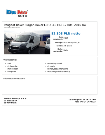 Peugeot Boxer Furgon Boxer L3H2 3.0 HDi 177KM, 2016 rok Kod oferty: BMA-1243 82 303 PLN netto Rok 2016 produkcji: Wersja: Dostawczy do 3,5t Silnik: 3.0 diesel Kolor Biały nadwozia: Wyposażenie: - ABS el. lusterka immobiliser komputer - centralny zamek el. szyby klimatyzacja manualna wspomaganie kierownicy Informacje dodatkowe: Budmat Auto Sp. z o. o. ul. Bielska 67 09-400 Płock Tel.: Peugeot: 24 267 47 60 Fax: +48 24 2674723