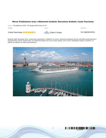 Morze Śródziemne wraz z Balearami – Barcelona – Costa Fascinosa Termin: 30 październik 2016 - 06 listopad 2016 (ilość dni: 8) Statek: Costa Fascinosa Linia: Cena od: Costa Cruises na zapytanie/os. Wyobraź sobie luksusowy hotel, niesamowity apartament z widokiem na morze, wykwintną światową kuchnię, atmosferę ekskluzywności i najznakomitszy serwis. Pomyśl teraz, że codziennie budzisz się w tym samym pokoju, ale w innym niezwykłym miejscu na świecie. To właśnie są wakacje na statku wycieczkowym. 1/3 EV:42145 TRASA REJSU Data Port Wpłynięcie Wypłynięcie niedziela 30.10.2016 Barcelona 20:30 20:30 poniedziałek 31.10.2016 Walencja 09:00 20:00 wtorek 01.11.2016 Palma de Mallorca, Majorka 08:00 18:00 dzień 4 środa 02.11.2016 Dzień na morzu --:-- --:-- dzień 5 czwartek 03.11.2016 Palermo, Sycylia 09:00 18:00 piątek 04.11.2016 Neapol 07:30 13:30 sobota 05.11.2016 Savona 09:00 17:00 niedziela 06.11.2016 Barcelona 14:30 14:30 dzień 1 dzień 2 dzień 3 dzień 6 dzień 7 dzień 8 Legenda Hiszpania Hiszpania Hiszpania Włochy Włochy Włochy Hiszpania CENNIK Cena katalogowa Kabina wewnętrzna na zapytanie Kabina zewnętrzna z oknem na zapytanie Kabina zewnętrzna z balkonem na zapytanie Suite (apartament) na zapytanie Samsara Suite na zapytanie Kabina jednoosobowa na zapytanie 3 i 4 osoba dorosła w kabinie na zapytanie dziecko do 18 lat jako 3 i 4 osoba w kabinie Opłaty portowe Cena promocyjna tylko opłaty portowe €140.00 2/3 EV:42145 Uwaga! Ceny za osobę w kabinie dwuosobowej. Cena zawiera: zakwaterowanie w kabinie wybranej kategorii; wyżywienie - 3 główne posiłki, przekąski między posiłkami; napoje serwowane do śniadania i w bufetach samoobsługowych; serwis bagażowy podczas wejścia i zejścia ze statku; serwis kabinowy; korzystanie ze wszystkich urządzeń sportowo - rekreacyjnych znajdujących się na pokładzie statku (basen, jacuzzi, sala fitness, itp.); udział we wszystkich imprezach organizowanych na statku (przedstawienia w teatrze, koncerty, programy animacyjne itp.). Cena nie zawiera: kosztów dojazdu do portu; opłat portowych; ewentualnych noclegów w hotelu przed/po rejsie i transferów; wycieczek fakultatywnych w trakcie rejsu; korzystania z barów, mini baru w kabinie oraz napojów zamawianych w restauracji; korzystania z punktów usługowych (fryzjer, pralnia, fotograf, salon piękności i odnowy biologicznej, internet) i wydatków osobistych; napiwków dla obsługi na statku (kwota uzależniona od długości rejsu); ubezpieczenia KL, NNW i bagaż, kosztów wiz (tam gdzie wymagane). Uwagi: Od 01.12.2015 na wszystkich rejsach Costa Cruises (z min. 5 noclegów) można zarezerwować następujące pakiety all inclusive: dla dzieci 4-17 lat Giovani od 15.99€/os./dzień, dla dorosłych: Brindiamo od 24.99€/os./dzień, Piu Gusto od 27.99€/os./dzień, Intenditore od 45.99€/os./dzień (pakiet musi być wykupiony przez każdą osobę zakwaterowaną w kabinie - można zakupić w biurze przed rejsem). Na Państwa życzenie zarezerwujemy przelot, transfery do/z portu, parking, dodatkowe noclegi oraz zadbamy o odpowiednie ubezpieczenie podróżne. 3/3 EV:42145