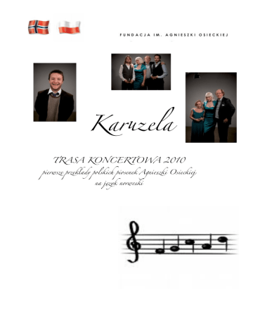 Kar!ela TRASA KONCERTOWA 2010 pierwsze przekłady polskich piosenek Agnieszki Osieckiej na język norweski Kar!ela to nazwa międzynarodowego zespołu muzycznego, który powstał specjalnie, by grać klasykę polskiej piosenki w nowych zaskakujących wersjach przy współpracy z Fundacją Okularnicy imienia Agnieszki Osieckiej Pomysł, który narodził się spontanicznie, trudno zaszufladkować, gdyż balansuje na granicy kilku kultur europejskich i łączy różne gatunki muzyki. Spotkają się w nim zupełnie odmienne temperamenty artystyczne: środkowoeuropejski, słowiański i skandynawski. Projekt łączy brzmienia jazzowe, folkowe, country i klasyczne, a zaproszeni do udziału artyści swobodnie poruszają się między tymi gatunkami. Wierzymy, iż rezultatem tego spotkania będą ciekawe, niepowtarzalne interpretacje i fascynujące koncerty. Dzięki projektowi ukażą się pierwsze przekłady polskich piosenek na język norweski. W repertuarze znajdą się przede wszystkim standardy Agnieszki Osieckiej. Jakie z prawie 2000 piosenek napisanych przez tę autorkę wybiorą norwescy muzycy? To na razie tajemnica. Oprócz piosenek Osieckiej, w ramach koncertów Karuzeli zabrzmią utwory dwóch innych mistrzów gatunku - Jonasza Kofty i Jacka Kaczmarskiego. W skład zespołu wchodzą znakomici muzycy i wokaliści z Norwegii i z Polski. Zespół powstał w 2009 roku, kiedy to Jørn Simen Øverli i Tora Augestad zachwycili się pięknem polskich piosenek autorstwa wielkiej poetki i pisarki Agnieszki Osieckiej. Szef artystyczny projektu, Jørn Simen Øverli wsiadł w samolot do Warszawy, odnalazł Fundację Okularnicy im. Agnieszki Osieckiej i namówił polskich przyjaciół Agnieszki Osieckiej do swego pomysłu. Na spotkaniu postanowiliśmy, że przetłumaczymy najpiękniejsze polskie piosenki na norweski, zaaranżujemy je na nowo, stworzymy polsko-norweski zespół i zaśpiewamy je w Norwegii i w Polsce. Skandynawia usłyszy polskie standardy, a Polacy usłyszą norweskie pomysły na własną klasykę gatunku. Poezję Agnieszki Osieckiej na język angielski przetłumaczyła prozą córka Poetki, Agata Passent, oraz kierująca Fundacją Marta Dobromirska-Passent. Na bazie tych tłumaczeń Jørn Simen Øverli tworzy norweskie wersje piosenek. Wsparcie projektu zostało udzielone przez Islandię, Liechtenstein oraz Norwegię poprzez dofinansowanie ze środków Mechanizmu Finansowego Europejskiego Obszaru Gospodarczego oraz Norweskiego Mechanizmu Finansowego oraz przez Ministerstwo Kultury i Dziedzictwa Narodowego. Zespół Kar!ela Zespół został stworzony specjalnie dla tego przedsięwzięcia. Zaprosiliśmy najlepszych młodych artystów z Norwegii i z Polski, którzy czują się swobodnie między różnymi gatunkami muzyki i na scenach międzynarodowych. Takich, którzy pomimo różnic kulturowych będą mogli porozumieć się dzięki językowi unwersalnemu, jakim jest muzyka. Przepiękne, ponadczasowe kompozycje takich polskich mistrzów jak Seweryn Krajewski, Andrzej Zieliński, Krzysztof Komeda, Jan Ptaszyn Wróblewski, zasługują na to, by w sposób nowy, odkrywczy wykonywały je kolejne pokolenia mistrzów. Teksty piosenek Agnieszki Osieckiej, to poezja najwyższej rangi. Teksty są głębokie, wieloznaczne, zaskakują ironią, dowcipem, wiele w nich melancholii, samotności. Bohaterki i bohaterowie tych piosenek to często ludzie na zakręcie, ludzie którzy nie żałują, którzy nie mają prostych recept na życie. Dlatego by śpiewać Osiecką, trzeba mieć wielką wrażliwość, talent interpretatorski i być nietuzinkową osobowości Tora Augestad, wokal, www.toraaugestad.no Znana Norweska wokalistka, ur. 1979 r., ukończyła Norweską Akademię Muzyczną. Śpiewa jazz, muzykę klasyczną, dyryguje, ale znakomicie odnajduje się także w klimacie kabaretowym, o czym świadczy sukces jej płyty „Music for a While”, w której interpretuje piosenki wybitnego niemieckiego kompozytora Kurta Weila („Mackie Majcher”, „Opera za trzy grosze”). Tora mieszka i pracuje w Berlinie. Joanna Lewandowska-Zbudniewek, wokal, www.joannalewandowska.art.pl Fenomenalnie utalentowana młoda wokalistka śpiewająca mądre, trudne utwory. Ukończyła Szkołę Muzyczną pierwszego i drugiego stopnia w klasie fortepianu. Prawdziwą szkołą piosenki była dla niej pięcioletnia przygoda w musicalu „Metro”. Lekcje tańca, emisji głosu, jazzu, aktorstwa na pewno przyczyniły się do jej dalszych sukcesów. W roku 2002 swą porywającą interpretacją „Koni” Włodzimierza Wysockiego w tłumaczeniu Agnieszki Osieckiej zdobyła drugą nagrodę, uznanie jury i publiczności w Ogólnopolskim Konkursie Wokalnym „Pamiętajmy o Osieckiej”. Nawiązała współpracę ze znanym kompozytorem Jerzym Satanowskim, a jej fascynacja twórczością Agnieszki Osieckiej, Jonasza Kofty i Jacka Kaczmarskiego sprawia, że wykonuje je podczas koncertów, festiwali i programów muzycznych. Ważniejsze nagrody to m.in Stypendium im. Marka Grechuty, Grand Prix na Festiwalu „Tańczące Eurydyki”, II miejsce, nagroda dziennikarzy i nagroda Prezesa Telewizji na 40. Studenckim Festiwalu Piosenki. Jørn Simen Øverli, wokal, gitara akustyczna, www.casanostra.no Jørn Simen Øverli to pomysłodawca i artystyczny lider projektu. To właśnie Jørn kompletuje zespół i wspólnie z muzykami wybiera utwory. Jest norweskim wokalistą, balladzistą i gitarzystą, który już od kilkunastu lat inspiruje się piosenką rosyjską i polską. Sukcesem okazały się m.in. dwie płyty, jakie nagrał ze swoimi tłumaczeniami i nowymi aranżacjami utworów Włodzimierza Wysockiego. Zainteresowanie publiczności norweskiej tymi albumami przeszło wszelkie oczekiwania. Jørn zagrał dotąd ponad 2000 koncertów prezentując twórczość Włodziemierza Wysockiego po norwesku. Od 1986 roku regularnie odwiedza też kraje słowiańskie, poznał wielu ekspertów od twórczości Wysockiego, jego przyjaciół i rodzinę. Zafascynow