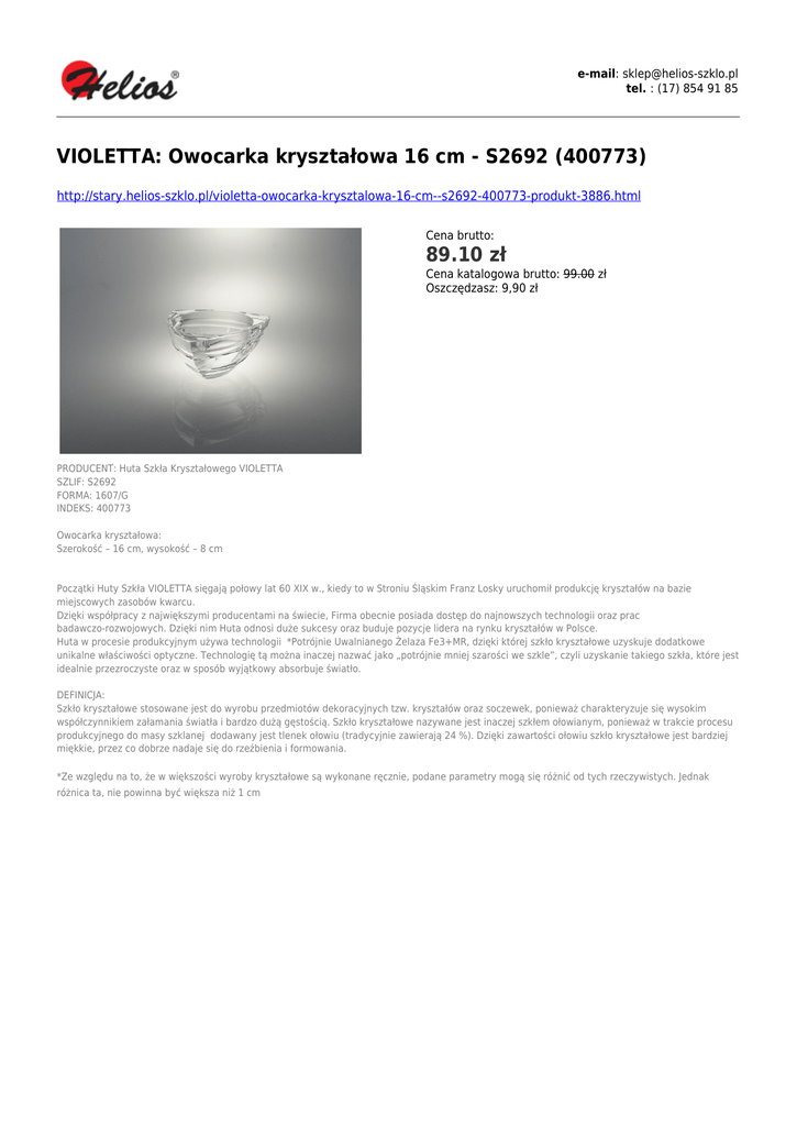 e-mail: [email protected] tel. : (17) 854 91 85 VIOLETTA: Owocarka kryształowa 16 cm - S2692 (400773) http://stary.helios-szklo.pl/violetta-owocarka-krysztalowa-16-cm--s2692-400773-produkt-3886.html Cena brutto: 89.10 zł Cena katalogowa brutto: 99.00 zł Oszczędzasz: 9,90 zł PRODUCENT: Huta Szkła Kryształowego VIOLETTA SZLIF: S2692 FORMA: 1607/G INDEKS: 400773 Owocarka kryształowa: Szerokość – 16 cm, wysokość – 8 cm Początki Huty Szkła VIOLETTA sięgają połowy lat 60 XIX w., kiedy to w Stroniu Śląskim Franz Losky uruchomił produkcję kryształów na bazie miejscowych zasobów kwarcu. Dzięki współpracy z największymi producentami na świecie, Firma obecnie posiada dostęp do najnowszych technologii oraz prac badawczo-rozwojowych. Dzięki nim Huta odnosi duże sukcesy oraz buduje pozycje lidera na rynku kryształów w Polsce. Huta w procesie produkcyjnym używa technologii *Potrójnie Uwalnianego Żelaza Fe3+MR, dzięki której szkło kryształowe uzyskuje dodatkowe unikalne właściwości optyczne. Technologię tą można inaczej nazwać jako „potrójnie mniej szarości we szkle”, czyli uzyskanie takiego szkła, które jest idealnie przezroczyste oraz w sposób wyjątkowy absorbuje światło. DEFINICJA: Szkło kryształowe stosowane jest do wyrobu przedmiotów dekoracyjnych tzw. kryształów oraz soczewek, ponieważ charakteryzuje się wysokim współczynnikiem załamania światła i bardzo dużą gęstością. Szkło kryształowe nazywane jest inaczej szkłem ołowianym, ponieważ w trakcie procesu produkcyjnego do masy szklanej dodawany jest tlenek ołowiu (tradycyjnie zawierają 24 %). Dzięki zawartości ołowiu szkło kryształowe jest bardziej miękkie, przez co dobrze nadaje się do rzeźbienia i formowania. *Ze względu na to, że w większości wyroby kryształowe są wykonane ręcznie, podane parametry mogą się różnić od tych rzeczywistych. Jednak różnica ta, nie powinna być większa niż 1 cm
