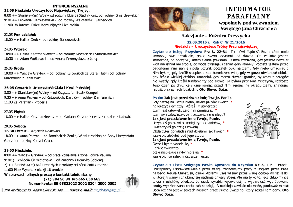 INTENCJE MSZALNE 22.05 Niedziela Uroczystość Najświętszej Trójcy. 8:00 ++ Stanisław(m) Wolny od rodziny Ekiert i Stadnik oraz od rodziny Smardzewskich 9:30 ++ Leokadia Cierniejewska - od rodziny Walczaków i Sarneckich. 11:00 W intencji Dzieci Komunijnych i ich rodzin 23.05 Poniedziałek 18.00 ++ Halina Czub - od rodziny Burszewskich 24.05 Wtorek 18:00 ++ Halina Kaczmarkiewicz – od rodziny Nowackich i Smardzewskich. 18:30 ++ Adam Wołkowski – od wnuka Przemysława z żoną. 25.05 Środa 18:00 ++ Wacław Grzybek – od rodziny Kurowskich ze Starej Huty i od rodziny Kurowskich z Janisławic. 26.05 Czwartek Uroczystość Ciała i Krwi Pańskiej 8.00 ++ Stanisław(m) Wolny – od Krzysztofa i Beaty Cempel. 9.30 ++ Anna Pacyna – od Kątowskich, Darulów i rodziny Ziemiańskich 11.00 Za Parafian - Procesja 27.05 Piątek 18.00 ++ Halina Kaczmarkiewicz – od Mariana Kaczmarkiewicz z rodziną z Latawic 28.05 Sobota 16.30 Chrzest – Wojciech Rosiewicz. 18.00 ++ Anna Pacyna – od Bronieckich Zenka, Wiesi z rodziną od Anny i Krzysztofa Gracz i od rodziny Kohla i Czub. 29.05 Niedziela. 8:00 ++ Wacław Grzybek – od brata Zdzisława z żoną i córką Pauliną 9:301). Leokadia Cierniejewska – od Zuzanny i Henryka Sobieraj 2) ++ Stanisław(m) Baś i zmarłych z rodziny od córki Zofii z rodziną.. 11:00 Piotr Wysota z okazji 18 urodzin W sprawach pilnych proszę o kontakt telefoniczny (71) 384 56 84 lub 665 650 663 Numer konta: 85 95821023 2002 0204 2000 0002 Prowadzący: ks. Adam Gliwiński SDB adres e-mail: [email protected] INFORMATOR PARAF IAL NY wspólnoty pod wezwaniem Świętego Jana Chrzciciela Salezjanie – Kuźnica Czeszycka 22.05.2016 r. Rok C Nr 21/2016 Niedziela - Uroczystość Trójcy Przenajświętszej Czytanie z Księgi Przysłów: Prz 8, 22-31 To mówi Mądrość Boża: «Pan mnie stworzył, swe arcydzieło, przed swymi czynami, od dawna. Od wieków jestem stworzona, od początku, zanim ziemia powstała. Jestem zrodzona, gdy jeszcze bezmiar wód nie istniał ani źródła, co wodą tryskają, i zanim góry stanęły. Poczęta jestem przed pagórkami, nim ziemię i pola uczynił, początek pyłu na ziemi. Gdy niebo umacniał, z Nim byłam, gdy kreślił sklepienie nad bezmiarem wód, gdy w górze utwierdzał obłoki, gdy źródła wielkiej otchłani umacniał, gdy morzu stawiał granice, by wody z brzegów nie wyszły, gdy kreślił fundamenty pod ziemię. Ja byłam przy Nim mistrzynią, rozkoszą Jego dzień po dniu, cały czas igrając przed Nim, igrając na okręgu ziemi, znajdując radość przy synach ludzkich». Oto Słowo Boże. Psalm Jak jest przedziwne imię Twoje, Panie. Gdy patrzę na Twoje niebo, dzieło palców Twoich, * na księżyc i gwiazdy, któreś Ty utwierdził: czym jest człowiek, że o nim pamiętasz, * czym syn człowieczy, że troszczysz się o niego? Jak jest przedziwne imię Twoje, Panie. Uczyniłeś go niewiele mniejszym od aniołów, * uwieńczyłeś go czcią i chwałą. Obdarzyłeś go władzą nad dziełami rąk Twoich, * wszystko złożyłeś pod jego stopy: Jak jest przedziwne imię Twoje, Panie. Owce i bydło wszelakie, * i dzikie zwierzęta, ptaki niebieskie i ryby morskie, * wszystko, co szlaki mórz przemierza. Czytanie z Listu Świętego Pawła Apostoła do Rzymian Rz 5, 1-5 - Bracia: Dostąpiwszy usprawiedliwienia przez wiarę, zachowajmy pokój z Bogiem przez Pana naszego Jezusa Chrystusa, dzięki któremu uzyskaliśmy przez wiarę dostęp do tej łaski, w której trwamy i chlubimy się nadzieją chwały Bożej. Ale nie tylko to, lecz chlubimy się także z ucisków, wiedząc, że ucisk wyrabia wytrwałość, a wytrwałość wypróbowaną cnotę, wypróbowana cnota zaś nadzieję. A nadzieja zawieść nie może, ponieważ miłość Boża rozlana jest w sercach naszych przez Ducha Świętego, który został nam dany. Oto Słowo Boże. Słowa Ewangelii wg św. Jana J 16, 12-15: Jezus powiedział swoim uczniom: «Jeszcze wiele mam wam do powiedzenia, ale teraz jeszcze znieść nie możecie. Gdy zaś przyjdzie On, Duch Prawdy, doprowadzi was do całej prawdy. Bo nie będzie mówił od siebie, ale powie wszystko, cokolwiek słyszy, i oznajmi wam rzeczy przyszłe. On Mnie otoczy chwałą, ponieważ z mojego weźmie i wam oznajmi. Wszystko, co ma Ojciec, jest moje. Dlatego powiedziałem, że z mojego bierze i wam objawi». Oto słowo Pańskie. Z życia Parafii: Dziś Nasza Wspólnota Parafialna, zwłaszcza jej młodsza generacja parafian, przeżywa przepiękną uroczystość Pierwszej Komunii Świętej. Widać to z zewnątrz jak i wewnątrz świątyni. W sobotę 21 maja trzecioklasiści przeżyli swoją pierwszą Spowiedź Świętą. Przy tej okazji serdecznie dziękuję za pomoc i posługę sakramentalną księdzu Jackowi z Bukowic i księdzu Waldemarowi z Cieszyna. Serca Naszych Młodych Parafian napełnione są Boża Miłością i radością z przyjęcia Pana Jezusa po raz pierwszy w życiu. Jest to dla nich piękna i wzruszająca chwila gdy do swojego serca mogą przyjąć Ciało Zbawiciela. Dzieci i ich rodziców oraz rodziców chrzestnych i zaproszonych gości otaczamy naszą modlitwą by w ich sercach Sam Bóg gościł jak najczęściej i otaczał ich swoim błogosławieństwem i opiekę. Zaproszenie: Serdecznie zapraszamy na Pielgrzymkę Autokarową do Torunia- Gietrzwałdu – Gdańska Termin: od 23 d0 26.06.2016 r. Koszt uczestnictwa 450 zł. Zapisy do 25.05.2016 u ks. Jacka Falkowskiego sdb. Kontakt: tel: 784 388 743 1 dzień – Toruń 2 dzień – Gietrzwałd i nocleg w Gdańsku 3 dzień Gdańsk W drodze powrotnej zwiedzanie Malborka W poszczególne dni zapewnione posiłki śniadanie i obiadokolacje. Zapraszamy i zachęcamy do wspólnego pielgrzymowania. Uroczystość Najświętszej Trójcy. Trzy Osoby w Jednej. Dla wielu to absurd. Dla nas, chrześcijan, prawda wiary. Wielka tajemnica, której nie sposób zrozumieć człowiekowi. „Dogmat o Trójcy Świętej ukształtował się dopiero w IV wieku – tłumaczy Anna Św