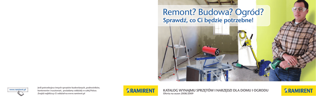 Remont? Budowa? Ogród? Sprawdź, co Ci będzie potrzebne! www.ramirent.pl Jeśli potrzebujesz innych sprzętów budowlanych, podnośników, kontenerów i rusztowań, posiadamy oddziały w całej Polsce. Znajdź najbliższy Ci oddział na www.ramirent.pl Katalog wynajmu sprzĘtów i narzędzi dla domu i ogrodu Oferta na sezon 2008/2009 SPIS TREŚCI Mamy dla Ciebie mnóstwo sprzętu! Dla ułatwienia podzieliliśmy go według miejsca jego zastosowania. Pomyśl, gdzie chcesz popracować i sprawdź, co Ci będzie potrzebne! PRACE W OGRODZIE 40 Urządzenia do koszenia i pielęgnacji trawnika 42 Urządzenia ogrodnicze i piły 44 Urządzenia do pielęgnacji ogrodu oraz łupania drewna kominkowego 46 PRACE WNĘTRZARSKIE Małe elektronarzędzia www.ramirent.pl 6 8 Urządzenia do prac wykończeniowych, tapetowania 10 Przecinarki, pilarki, cykliniarki 12 Szlifierki, urządzenia do obróbki drewna i betonu 14 Maszyny i narzędzia do obróbki rur 16 Sprężarki, narzędzia pneumatyczne i urządzenia pomiarowe 18 Nagrzewnice, osuszacze, odkurzacze 20 PRACE NA WYSOKOŚCI 34 Urządzenia do prac dekarskich, wciągarki, kosze zsypowe 36 Rusztowania, drabiny 38 PRACE NA ZEWNĄTRZ 22 Zagęszczarki, wibratory, szlifierki, frezarki i pilarki 24 Narzędzia brukarskie i betoniarki 26 Agregaty prądotwórcze, spawalnicze, spawarki i pompy 28 Młoty 30 Urządzenia do mycia, odśnieżania i transportu 32 SPIS alfabetyczny Agregat jednofazowy Agregat trójfazowy Areator elektryczny do trawników 28 28 43 Betoniarka Bruzdownica 27 9 Cykliniarka kątowa Cykliniarka taśmowa Dmuchawa do liści 13 13 47 Drabiny aluminiowe 38, 39 Imak brukarski 26 Kosiarka elektryczna Kosiarka spalinowa z napędem 42 42 Młotek gumowy Młotowiertarka Młot udarowo-obrotowy Młoty wyburzeniowe Myjka na zimną wodę Nagrzewnica elektryczna Nagrzewnica gazowa Nagrzewnica spalinowa Nożyce elektryczne do blachy 21 20 20 36 21 21 32 36 25 12 16 11 29 Elektryczna piła łańcuchowa do drewna Elektryczne nożyce do żywopłotu Elektryczne urządzenie do czyszczenia rur Elektryczny obcinacz do gałęzi Elektryczny rozdrabniacz do gałęzi Elektryczny strug ręczny do drewna 16 46 47 15 Frezarka elektryczna do betonu 25 Odkurzacz do prania dywanów Odkurzacz przemysłowy Odśnieżarka spalinowa Opalarka elektryczna do farb i lakierów Opryskiwacz ogrodowy Osuszacz powietrza Gilotyna ręczna do cięcia kostki brukowej Glebogryzarka spalinowa Grubościówka do drewna Gwintownica elektryczna do rur Gwoździarka pneumatyczna 26 44 15 17 19 Palnik do papy Pilarka budowlana Pilarka ręczna Piła szablasta do rur Podnośnik montażowy do płyt Pompa szlamowa spalinowa 45 46 27 9 31 30, 31 33 10 45 21 Pompa zanurzalna Przecinarka stolikowa 29 13 Ręczna elektryczna szlifierka do betonu 15 Ręczna szlifierka oscylacyjna do drewna 14 Ręczna szlifierka taśmowa do drewna 14 Ręczny mieszalnik do zapraw i kleju 11 Rusztowanie 38 Siewnik do trawy i nawozów 43 Spalinowa piła łańcuchowa do drewna 45 Spalinowy agregat spawalniczy 29 Spawarka 29 Sprężarka tłokowa ze zbiornikiem 18 Stół do przycinania tapet 10 Stolikowa piła do drewna (ukośnica) 13 Stolikowa przecinarka do glazury 12 Szlifierka do betonu 25 Szlifierka do gładzi gipsowych 15 Szlifierka kątowa 8 Sztyfciarka pneumatyczna 19 Świder glebowy spalinowy 44 Urządzenie do łupania drewna kominkowego 47 Urządzenie do nakładania kleju na tapety Urządzenie do zrywania wykładzin dywanowych 11 11 Walec do trawników Wciągarka budowlana Wciągarka do dachówki Wertykulator Wibrator mechaniczny Wkrętarka Wózek do transportu po schodach Wózek paletowy Wykaszarka spalinowa Wykrywacz metali Wyrzynarka do drewna Wyważak brukarski 45 37 37 43 25 8 33 33 43 19 9 27 Zagęszczarka Zakrętarka Zamrażarka do rur Zestaw koszy zsypowych Zgrzewarka mufowa do rur 24 9 17 37 17 Podstawowe zasady wynajmu w wypożyczalniach narzędzi dla domu i ogrodu Ramirent: Objaśnienia znaków wykorzystywanych w katalogu: 1. Sprzęt wynajmowany jest na doby lub tygodnie – prezentowane w cenniku ceny są stawkami dobowymi oraz tygodniowymi. 2. Wysokość stawki najmu zależna jest od czasu najmu. 3. Wszystkie transakcje rozliczane są za gotówkę, kartą płatniczą lub kredytową z góry za cały deklarowany okres najmu. 4. Szczegółowe warunki reguluje umowa najmu. 5. Przy wynajmie obowiązuje indywidualne ubezpieczenie sprzętu. 6. Dokumenty potrzebne przy pierwszym najmie: W zależności od rozmiaru sprzętu będziesz potrzebować odpowiedniego środka transportu: Osoby fizyczne: • Dowód osobisty • Drugi dokument tożsamości potwierdzający adres zameldowania z dowodu osobistego Osoby fizyczne prowadzące działalność gospodarczą: • Dowód osobisty • Drugi dokument tożsamości potwierdzający adres zameldowania z dowodu osobistego • Dokumenty rejestrowe: zaświadczenie o wpisie do ewidencji działalności gospodarczej, zaświadczenia o nadaniu numerów NIP oraz REGON • Pisemne pełnomocnictwo (podpisane przez właściciela firmy) upoważniające do zawierania umów i odbioru sprzętu osobę, która zgłasza się po odbiór sprzętu (pierwszy wynajem osobiście przez właściciela) Spółki prawa handlowego: • Dokumenty rejestrowe: wyciąg z rejestru handlowego z numerem KRS (nie starszy niż 6 miesięcy), zaświadczenia o nadaniu numerów NIP oraz REGON • Pisemne pełnomocnictwo spółki (podpisane przez osoby uprawnione do reprezentowania spółki) upoważniające do zawierania umów i odbioru sprzętu osobę, która zgłasza się po odbiór sprzętu Oferta sprzętów i ich cen zawarta w niniejszym katalogu dotyczy wyłącznie dwóch oddziałów Ramirent: w Poznaniu (Centrum Handlowe Franowo) oraz w Warszawie (Park Handlowy Janki). samochód osobowy przyczepka samochód dostawczy Bezpieczeństwo przede wszystkim. Na co uważać i jak bezpiecznie używać sprzętu objaśnią Ci te znaki: niebezpieczeństwo porażenia maska ochronna ochraniacz słuchu obuwie ochronne rękawice ochronne oc