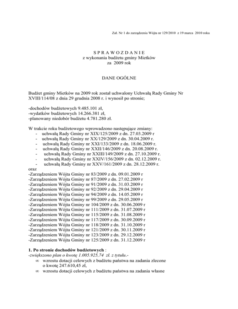 SPRAWOZDANIE z wykonania budżetu gminy Mietków za 2009 rok