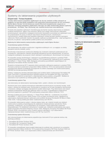 O nas Produkty Szkolenia Kolorystyka Kontakt z nami Systemy do lakierowania pojazdów użytkowych Ekspert radzi - Tomasz Kazakidis. Tematu lakierowania pojazdów użytkowych nie da się omówić w kilku słowach ze względu na szeroką gamę pojazdów oraz systemów przeznaczonych do ich renowacji. Marka Spies Hecker od lat dostarcza swoim Klientom kompleksowe wsparcie w zakresie renowacji pojazdów użytkowych oferując nie tylko doskonałej jakości systemy produktowe - Hi-Class, Top i Economy, ale również know-how oraz szkolenia. Produkty dla pojazdów użytkowych charakteryzują się bardzo wysoką odpornością na działanie środków chemicznych, wilgoci oraz ścierania. Biorąc pod uwagę różnorodność materiałów konstrukcyjnych, specyficzne rozwiązania techniczne stosowane w produkcji aut użytkowych oraz ich przeznaczenie do pracy w różnych warunkach atmosferycznych, chemicznych i mechanicznych, powłoki lakierowe pojazdów użytkowych muszą sprostać wysokim wymogom odbiorców. Warto podkreślić również, że pojazdy użytkowe są wizytówką firmy - stąd wymagania w stosunku do jakości i wytrzymałości powłok powinny być priorytetem. Systemy do lakierowania samochodów użytkowych marki Spies Hecker: 4-warstwowy system Hi-Class Lakierowania pojazdów użytkowych - system HiClass Systemy do lakierowania pojazdów użytkowych Jest dedykowany dla sektora autobusów i ciągników siodłowych m.in. ze względu na efekty specjalne kolorów (metaliki, perły). Konstrukcje nowoczesnych autobusów składają się z kratownic stalowych piaskowanych lub śrutowanych, pokrywanych metodą natryskową specjalnymi grunto-wypełniaczami, do których następnie przyklejane są poszycia z blach stalowych ocynkowanych, aluminiowych lub tworzyw. W przypadku poszyć aluminiowych i stalowych na przeszlifowaną papierem o gradacji P180 i umytą preparatem Permanent Silikon Entferner 7010 powierzchnię, aplikujemy grunt reaktywny Permafleet 1:1 Wash Primer 3688. Następnie pokrywamy ją podkładem wypełniającym do szlifowania Permafleet HS Bus Surfacer 5530. Suszenie w temperaturze 60°C zapewnia dobre parametry szlifowania papierem o gradacji P500. Ponowne przemycie powierzchni preparatem Silikon Entferner 7010 oraz zastosowanie ściereczki antystatycznej zapewni prawidłową przyczepność do lakieru bazowego serii wodorozcieńczalnej 280/480 lub konwencjonalnej 293/295. Kolejną i ostateczną warstwą zabezpieczającą jest powłoka lakieru bezbarwnego Permafleet HS Clear Coat 8320 o charakterystycznym wysokim połysku lub Permafleet HS Clear Coat 8320, który przy odpowiednich proporcjach z utwardzaczem tworzy powłokę „antygraffiti”. Możliwe do wykonania w tym systemie są również grafiki, loga firm, wielokolorowe pasy. 3-warstwowy system Top Jest skierowany do lakierowania naprawczego kabin, cystern, silosów, burt aluminiowych. Aluminium jest coraz częściej stosowanym materiałem konstrukcyjnym w produkcji naczep, muld, cystern, silosów do przewozu pasz. Konstrukcje te narażone są na duże obciążenia mechaniczne i chemiczne, dlatego wymagają odpowiednich powłok lakierowych. Przy lakierowaniu tak dużych obiektów podstawową metodą jest aplikacja mokro-na-mokro. Przeszlifowane powierzchnie aluminium papierem o gradacji P180 przemywamy preparatem Silikon Entferner 7010. Pierwszą powłoką jest grunt reaktywny 1:1 Wash Primer 3688 lub - w zależności od potrzeb Permafleet 1:1 Anti-Corrosion Wash Primer 4130 na bazie chromianów cynku. Następnie po odparowaniu międzywarstwowym aplikowany jest podkład akrylowy Permasolid HS Nass-in-Nass Füller 5330. Trzecią powłoką jest lakier nawierzchniowy serii HS 670. W przypadku lakierowania cystern i silosów miejsca takie, jak: drabinki ścieżki przy deklach można pokryć powłoką antypoślizgową dla zwiększenia bezpieczeństwa operatorów. Ramy podwozia, w zależności, czy są piaskowane czy śrutowane, można lakierować systemem dwupowłokowym. Po dokładnym odmuchaniu z resztek pyłu, dokładnie przemywamy przy użyciu pędzli preparatem Permaloid Washing Thinner 7020. Następnie stosujemy Permafleet HS Primer Surfacer 4036 z chromianami cynku w dwóch pełnych warstwach, a po odparowaniu międzywarstwowym lakier nawierzchniowy serii HS Top Coat 675. 2-warstwowy system Economy Jest rekomendowany do lakierowania pojazdów typu betoniarki.W tym systemie istotną rolę spełniają podkłady: Permafleet HS Primer Surfacer 5520 Permafleet HS Transparent Sealer 5025 Permafleet EP Primer Surfacer 4400 W przypadku przeszlifowań starej powłoki lakierowej do podłoża (stal, aluminium) na uprzednio umytą preparatem Silikon Entferner 7010 powierzchnię stosujemy HS Primer Surfacer 5520 lub EP Primer Surfacer 4400, a po odparowaniu lakiery nawierzchniowe serii HS 670/675. Lakierowania pojazdów użytkowych system HiClass - Auto Matunin warsztatlakierniczy Jeśli powłoka lakieru nie jest uszkodzona oraz nie posiada ognisk korozji, obić od kamieni, czy innych wad powłoki lakieru, możemy na powierzchnię zmatowaną włókniną i umytą zmywaczem zastosować HS Transparent Sealer 5025. Następnie, po odparowaniu międzywarstwowym aplikujemy lakier nawierzchniowy serii HS 670 /675. Efekt finalny lakierowania zależy od naszej wiedzy, przygotowania technicznego, umiejętności i warunków, w jakich wykonujemy pracę. Zachęcam do korzystania z informacji zawartych w instrukcjach technicznych, a w przypadku wątpliwości, konsultowania się z doradcą technicznym. Przy tak rozległym temacie trudno jest podać technologię w pigułce, dlatego zachęcam do uczestnictwa w szkoleniach z zakresu lakierowania pojazdów użytkowych. Więcej informacji o aktualnie organizowanych szkoleniach znaleźć można na stronie internetowej www.spieshecker.pl/szkolenia. PR Systemy do lakierowania pojazdów użytkowych (pdf | 152.23 KB) PR fotka system Hi-Class (jpg | 2.27 MB) PR fotka system Top (jpg | 548.85 KB) PR fotka system 