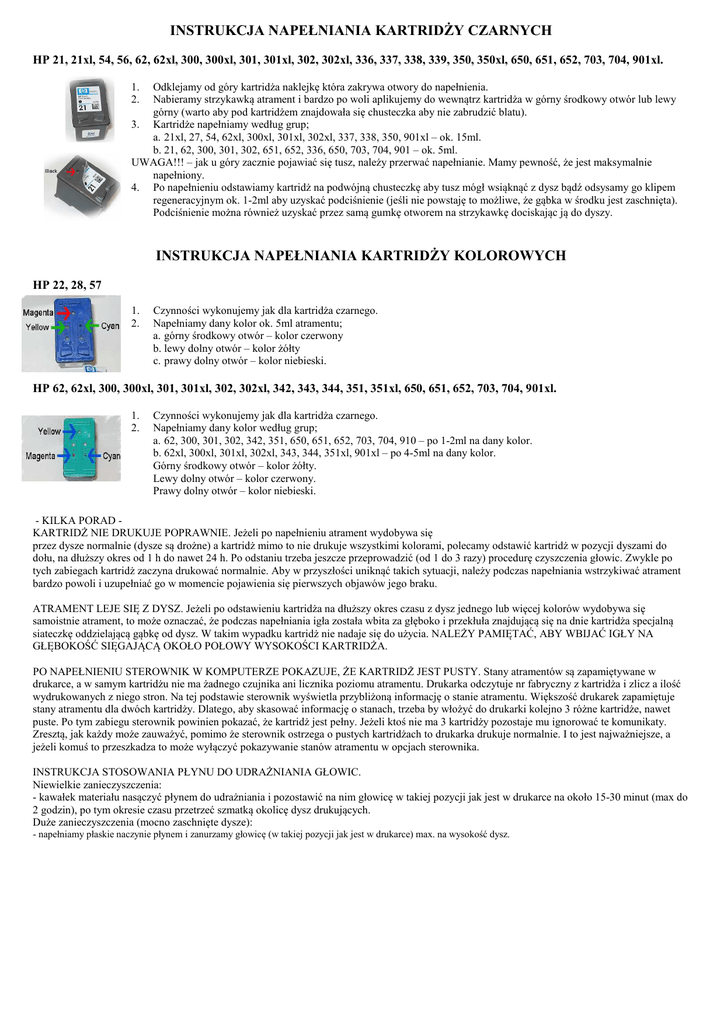 INSTRUKCJA NAPEŁNIANIA KARTRIDŻY CZARNYCH HP 21, 21xl, 54, 56, 62, 62xl, 300, 300xl, 301, 301xl, 302, 302xl, 336, 337, 338, 339, 350, 350xl, 650, 651, 652, 703, 704, 901xl. 1. 2. Odklejamy od góry kartridża naklejkę która zakrywa otwory do napełnienia. Nabieramy strzykawką atrament i bardzo po woli aplikujemy do wewnątrz kartridża w górny środkowy otwór lub lewy górny (warto aby pod kartridżem znajdowała się chusteczka aby nie zabrudzić blatu). 3. Kartridże napełniamy według grup; a. 21xl, 27, 54, 62xl, 300xl, 301xl, 302xl, 337, 338, 350, 901xl – ok. 15ml. b. 21, 62, 300, 301, 302, 651, 652, 336, 650, 703, 704, 901 – ok. 5ml. UWAGA!!! – jak u góry zacznie pojawiać się tusz, należy przerwać napełnianie. Mamy pewność, że jest maksymalnie napełniony. 4. Po napełnieniu odstawiamy kartridż na podwójną chusteczkę aby tusz mógł wsiąknąć z dysz bądź odsysamy go klipem regeneracyjnym ok. 1-2ml aby uzyskać podciśnienie (jeśli nie powstaję to możliwe, że gąbka w środku jest zaschnięta). Podciśnienie można również uzyskać przez samą gumkę otworem na strzykawkę dociskając ją do dyszy. INSTRUKCJA NAPEŁNIANIA KARTRIDŻY KOLOROWYCH HP 22, 28, 57 1. 2. Czynności wykonujemy jak dla kartridża czarnego. Napełniamy dany kolor ok. 5ml atramentu; a. górny środkowy otwór – kolor czerwony b. lewy dolny otwór – kolor żółty c. prawy dolny otwór – kolor niebieski. HP 62, 62xl, 300, 300xl, 301, 301xl, 302, 302xl, 342, 343, 344, 351, 351xl, 650, 651, 652, 703, 704, 901xl. 1. 2. Czynności wykonujemy jak dla kartridża czarnego. Napełniamy dany kolor według grup; a. 62, 300, 301, 302, 342, 351, 650, 651, 652, 703, 704, 910 – po 1-2ml na dany kolor. b. 62xl, 300xl, 301xl, 302xl, 343, 344, 351xl, 901xl – po 4-5ml na dany kolor. Górny środkowy otwór – kolor żółty. Lewy dolny otwór – kolor czerwony. Prawy dolny otwór – kolor niebieski. - KILKA PORAD KARTRIDŻ NIE DRUKUJE POPRAWNIE. Jeżeli po napełnieniu atrament wydobywa się przez dysze normalnie (dysze są drożne) a kartridż mimo to nie drukuje wszystkimi kolorami, polecamy odstawić kartridż w pozycji dyszami do dołu, na dłuższy okres od 1 h do nawet 24 h. Po odstaniu trzeba jeszcze przeprowadzić (od 1 do 3 razy) procedurę czyszczenia głowic. Zwykle po tych zabiegach kartridż zaczyna drukować normalnie. Aby w przyszłości uniknąć takich sytuacji, należy podczas napełniania wstrzykiwać atrament bardzo powoli i uzupełniać go w momencie pojawienia się pierwszych objawów jego braku. ATRAMENT LEJE SIĘ Z DYSZ. Jeżeli po odstawieniu kartridża na dłuższy okres czasu z dysz jednego lub więcej kolorów wydobywa się samoistnie atrament, to może oznaczać, że podczas napełniania igła została wbita za głęboko i przekłuła znajdującą się na dnie kartridża specjalną siateczkę oddzielającą gąbkę od dysz. W takim wypadku kartridż nie nadaje się do użycia. NALEŻY PAMIĘTAĆ, ABY WBIJAĆ IGŁY NA GŁĘBOKOŚĆ SIĘGAJĄCĄ OKOŁO POŁOWY WYSOKOŚCI KARTRIDŻA. PO NAPEŁNIENIU STEROWNIK W KOMPUTERZE POKAZUJE, ŻE KARTRIDŻ JEST PUSTY. Stany atramentów są zapamiętywane w drukarce, a w samym kartridżu nie ma żadnego czujnika ani licznika poziomu atramentu. Drukarka odczytuje nr fabryczny z kartridża i zlicz a ilość wydrukowanych z niego stron. Na tej podstawie sterownik wyświetla przybliżoną informację o stanie atramentu. Większość drukarek zapamiętuje stany atramentu dla dwóch kartridży. Dlatego, aby skasować informację o stanach, trzeba by włożyć do drukarki kolejno 3 różne kartridże, nawet puste. Po tym zabiegu sterownik powinien pokazać, że kartridż jest pełny. Jeżeli ktoś nie ma 3 kartridży pozostaje mu ignorować te komunikaty. Zresztą, jak każdy może zauważyć, pomimo że sterownik ostrzega o pustych kartridżach to drukarka drukuje normalnie. I to jest najważniejsze, a jeżeli komuś to przeszkadza to może wyłączyć pokazywanie stanów atramentu w opcjach sterownika. INSTRUKCJA STOSOWANIA PŁYNU DO UDRAŻNIANIA GŁOWIC. Niewielkie zanieczyszczenia: - kawałek materiału nasączyć płynem do udrażniania i pozostawić na nim głowicę w takiej pozycji jak jest w drukarce na około 15-30 minut (max do 2 godzin), po tym okresie czasu przetrzeć szmatką okolicę dysz drukujących. Duże zanieczyszczenia (mocno zaschnięte dysze): - napełniamy płaskie naczynie płynem i zanurzamy głowicę (w takiej pozycji jak jest w drukarce) max. na wysokość dysz.