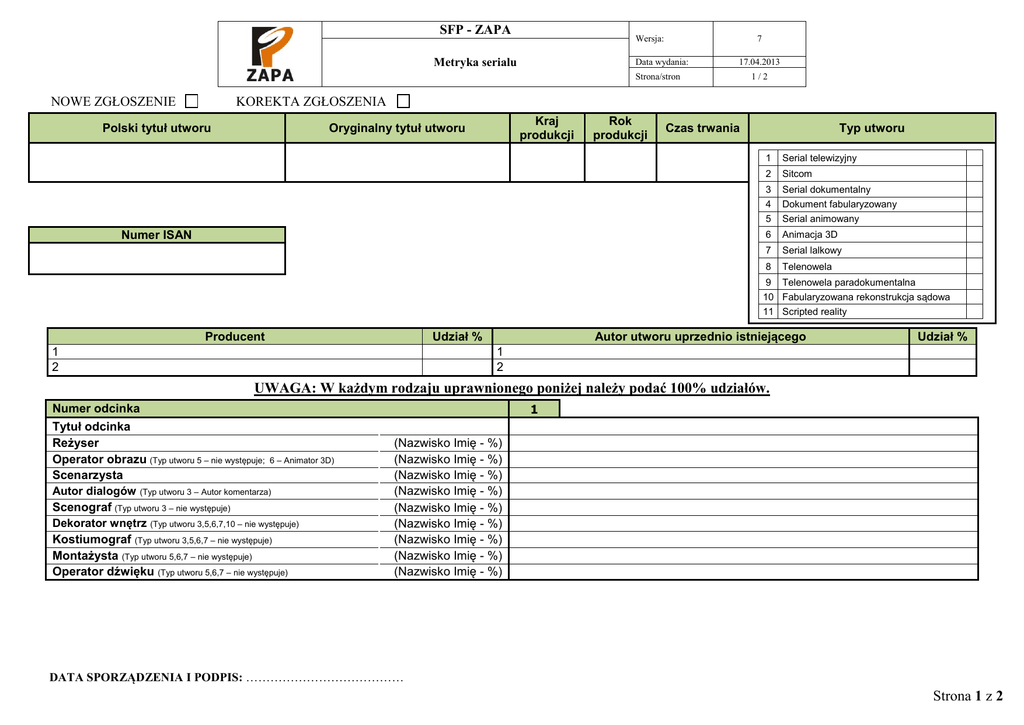 SFP - ZAPA Wersja: Metryka serialu 7 Data wydania: 17.04.2013 Strona/stron NOWE ZGŁOSZENIE 1/2 KOREKTA ZGŁOSZENIA Polski tytuł utworu Kraj produkcji Oryginalny tytuł utworu Numer ISAN Rok produkcji Czas trwania Typ utworu 1 Serial telewizyjny 2 Sitcom 3 4 5 Serial dokumentalny Dokument fabularyzowany Serial animowany 6 Animacja 3D 7 Serial lalkowy 8 Telenowela 9 Telenowela paradokumentalna 10 Fabularyzowana rekonstrukcja sądowa 11 Scripted reality Udział % Producent 1 2 Autor utworu uprzednio istniejącego Udział % 1 2 UWAGA: W każdym rodzaju uprawnionego poniżej należy podać 100% udziałów. Numer odcinka Tytuł odcinka Reżyser Operator obrazu (Typ utworu 5 – nie występuje; 6 – Animator 3D) Scenarzysta Autor dialogów (Typ utworu 3 – Autor komentarza) Scenograf (Typ utworu 3 – nie występuje) Dekorator wnętrz (Typ utworu 3,5,6,7,10 – nie występuje) Kostiumograf (Typ utworu 3,5,6,7 – nie występuje) Montażysta (Typ utworu 5,6,7 – nie występuje) Operator dźwięku (Typ utworu 5,6,7 – nie występuje) 1 (Nazwisko Imię - %) (Nazwisko Imię - %) (Nazwisko Imię - %) (Nazwisko Imię - %) (Nazwisko Imię - %) (Nazwisko Imię - %) (Nazwisko Imię - %) (Nazwisko Imię - %) (Nazwisko Imię - %) DATA SPORZĄDZENIA I PODPIS: ………………………………… Strona 1 z 2 SFP - ZAPA Metryka serialu Wersja: Data wydania: Strona/stron Numer odcinka Tytuł odcinka Reżyser Operator obrazu (Typ utworu 5 – nie występuje; 6 – Animator 3D) Scenarzysta Autor dialogów (Typ utworu 3 – Autor komentarza) Scenograf (Typ utworu 3 – nie występuje) Dekorator wnętrz (Typ utworu 3,5,6,7,10 – nie występuje) Kostiumograf (Typ utworu 3,5,6,7 – nie występuje) Montażysta (Typ utworu 5,6,7 – nie występuje) Operator dźwięku (Typ utworu 5,6,7 – nie występuje) (Nazwisko Imię - %) (Nazwisko Imię - %) (Nazwisko Imię - %) (Nazwisko Imię - %) (Nazwisko Imię - %) (Nazwisko Imię - %) (Nazwisko Imię - %) (Nazwisko Imię - %) (Nazwisko Imię - %) Numer odcinka Tytuł odcinka Reżyser Operator obrazu (Typ utworu 5 – nie występuje; 6 – Animator 3D) Scenarzysta Autor dialogów (Typ utworu 3 – Autor komentarza) Scenograf (Typ utworu 3 – nie występuje) Dekorator wnętrz (Typ utworu 3,5,6,7,10 – nie występuje) Kostiumograf (Typ utworu 3,5,6,7 – nie występuje) Montażysta (Typ utworu 5,6,7 – nie występuje) Operator dźwięku (Typ utworu 5,6,7 – nie występuje) (Nazwisko Imię - %) (Nazwisko Imię - %) (Nazwisko Imię - %) (Nazwisko Imię - %) (Nazwisko Imię - %) (Nazwisko Imię - %) (Nazwisko Imię - %) (Nazwisko Imię - %) (Nazwisko Imię - %) Numer odcinka Tytuł odcinka Reżyser Operator obrazu (Typ utworu 5 – nie występuje; 6 – Animator 3D) Scenarzysta Autor dialogów (Typ utworu 3 – Autor komentarza) Scenograf (Typ utworu 3 – nie występuje) Dekorator wnętrz (Typ utworu 3,5,6,7,10 – nie występuje) Kostiumograf (Typ utworu 3,5,6,7 – nie występuje) Montażysta (Typ utworu 5,6,7 – nie występuje) Operator dźwięku (Typ utworu 5,6,7 – nie występuje) (Nazwisko Imię - %) (Nazwisko Imię - %) (Nazwisko Imię - %) (Nazwisko Imię - %) (Nazwisko Imię - %) (Nazwisko Imię - %) (Nazwisko Imię - %) (Nazwisko Imię - %) (Nazwisko Imię - %) 7 17.04.2013 2/2 DATA SPORZĄDZENIA I PODPIS: ………………………………… Strona 2 z 2
