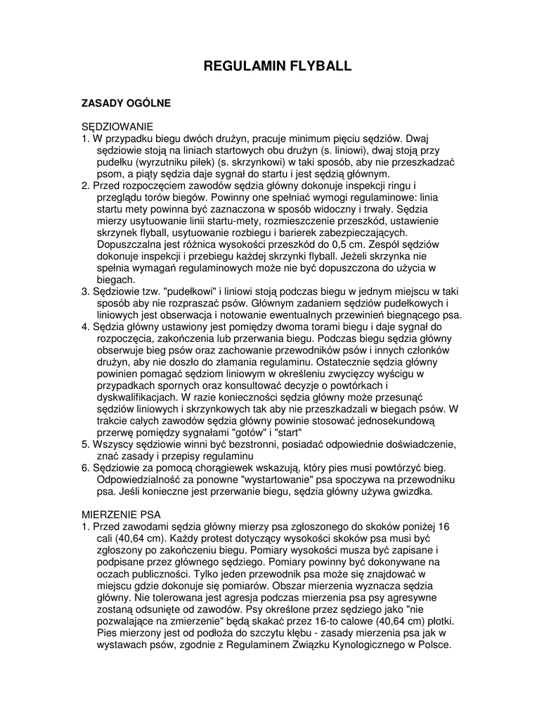 REGULAMIN FLYBALL ZASADY OGÓLNE S DZIOWANIE 1. W przypadku biegu dwóch dru yn, pracuje minimum pi ciu s dziów. Dwaj s dziowie stoj na liniach startowych obu dru yn (s. liniowi), dwaj stoj przy pudełku (wyrzutniku piłek) (s. skrzynkowi) w taki sposób, aby nie przeszkadza psom, a pi ty s dzia daje sygnał do startu i jest s dzi głównym. 2. Przed rozpocz ciem zawodów s dzia główny dokonuje inspekcji ringu i przegl du torów biegów. Powinny one spełnia wymogi regulaminowe: linia startu mety powinna by zaznaczona w sposób widoczny i trwały. S dzia mierzy usytuowanie linii startu-mety, rozmieszczenie przeszkód, ustawienie skrzynek flyball, usytuowanie rozbiegu i barierek zabezpieczaj cych. Dopuszczalna jest ró nica wysoko ci przeszkód do 0,5 cm. Zespół s dziów dokonuje inspekcji i przebiegu ka dej skrzynki flyball. Je eli skrzynka nie spełnia wymaga regulaminowych mo e nie by dopuszczona do u ycia w biegach. 3. S dziowie tzw. "pudełkowi" i liniowi stoj podczas biegu w jednym miejscu w taki sposób aby nie rozprasza psów. Głównym zadaniem s dziów pudełkowych i liniowych jest obserwacja i notowanie ewentualnych przewinie biegn cego psa. 4. S dzia główny ustawiony jest pomi dzy dwoma torami biegu i daje sygnał do rozpocz cia, zako czenia lub przerwania biegu. Podczas biegu s dzia główny obserwuje bieg psów oraz zachowanie przewodników psów i innych członków dru yn, aby nie doszło do złamania regulaminu. Ostatecznie s dzia główny powinien pomaga s dziom liniowym w okre leniu zwyci zcy wy cigu w przypadkach spornych oraz konsultowa decyzje o powtórkach i dyskwalifikacjach. W razie konieczno ci s dzia główny mo e przesun s dziów liniowych i skrzynkowych tak aby nie przeszkadzali w biegach psów. W trakcie całych zawodów s dzia główny powinie stosowa jednosekundow przerw pomi dzy sygnałami "gotów" i "start" 5. Wszyscy s dziowie winni by bezstronni, posiada odpowiednie do wiadczenie, zna zasady i przepisy regulaminu 6. S dziowie za pomoc chor giewek wskazuj , który pies musi powtórzy bieg. Odpowiedzialno za ponowne "wystartowanie" psa spoczywa na przewodniku psa. Je li konieczne jest przerwanie biegu, s dzia główny u ywa gwizdka. MIERZENIE PSA 1. Przed zawodami s dzia główny mierzy psa zgłoszonego do skoków poni ej 16 cali (40,64 cm). Ka dy protest dotycz cy wysoko ci skoków psa musi by zgłoszony po zako czeniu biegu. Pomiary wysoko ci musza by zapisane i podpisane przez głównego s dziego. Pomiary powinny by dokonywane na oczach publiczno ci. Tylko jeden przewodnik psa mo e si znajdowa w miejscu gdzie dokonuje si pomiarów. Obszar mierzenia wyznacza s dzia główny. Nie tolerowana jest agresja podczas mierzenia psa psy agresywne zostan odsuni te od zawodów. Psy okre lone przez s dziego jako "nie pozwalaj ce na zmierzenie" b d skaka przez 16-to calowe (40,64 cm) płotki. Pies mierzony jest od podło a do szczytu kł bu - zasady mierzenia psa jak w wystawach psów, zgodnie z Regulaminem Zwi zku Kynologicznego w Polsce. 2. Wysoko skoków jest ustalona na poziomie o 10 cm ni ej od wysoko ci kł bu najni szego psa w dru ynie ale nie mniej ni 20 cm. Maksymalna wysoko skoków to 40cm. Wysoko skoków jest dostosowana do korygowania o 5 centymetrów (tzn. 20, 25, 30, 35 cm). 3. S dzia główny mo e przerwa bieg w chwili jego zakłócenia, zmiany trasy biegu, agresji ze strony psa i przyzna zwyci stwo dru ynie przeciwnej. S DZIOWIE LINIOWI: 1. Rejestruj , które psy bior udział w ka dym biegu, przy pomocy blankietów zgłoszeniowych i pojedynkowych. 2. Zatrzymuj bieg z powodu falstartu lub w przypadku konieczno ci powtórzenia startu 3. Daj znak, za pomoc chor giewki, który pies musi powtórzy bieg ( zbyt wczesny pierwszy start, omini cie skoku, przekroczenie linii startu/mety bez piłki, wej cie wła ciciela na lini startu/mety lub w przypadku jakiegokolwiek innego złamania zasad regulaminu, w którym pies musi powtórzy bieg: s dzia liniowy sygnalizuje powtórk przez podniesienie ółtej flagi - w tym przypadku pies powtarza bieg po ostatnim w dru ynie. W przypadku dyskwalifikacji s dzia unosi czerwon flag . Bieg przerywa tylko dru yna zdyskwalifikowana dru yna przeciwna kontynuuje bieg. USTALENIE ZWYCI ZCY BIEGU: 1. w przypadku zastosowania elektronicznego pomiaru czasu, o zwyci zcy biegu decyduje czas uzyskany w danym biegu. W sytuacji gdy czasy biegów s równe lub ró ni si maksymalnie do trzech setnych sekundy (0,02) - s dzia główny mo e ogłosi remis 2. W przypadku r cznego pomiaru czasu decyzja zespołu s dziowskiego p przyznanie zwyci stwa powinna by jednomy lna i opiera si na ocenie wzrokowej linii mety, nie w oparciu o wskazania stoperów (czasomierzy). W przypadku niezgodno ci s dziów co do zwyci zcy biegu, bieg nale y powtórzy 3. S dziowie nie musz by obecni przy rozgrzewce. DRU YNY I FORMULARZE CZASOWE 1. Ka da dru yna składa si z minimum czterech psów i czterech przewodników i maksymalnie z 6 psów, 6 przewodników i dodatkowo ładowacza skrzynki. W skład dru yny mog równie wchodzi - je eli tak uzna zespół - jeden lub dwóch pomocników zbieraj cych upuszczone piłki, poprawiaj cych przewrócone przeszkody i w inny sposób asystuj cych dru ynie, jednak pod warunkiem, e nie b d oni stanowi przeszkody dla s dziów, czy dla dru yny przeciwnej i nie b d prowokowa psów do złamania zasad regulaminu. 2. W ka dym biegu dru yna wystawia cztery psy, z maksymalnie dwoma psami rezerwowymi stoj cymi w pobli u toru. Psy rezerwowe mog by wprowadzeni do biegu w chwili kontuzji lub zranienia innego psa. Zmiany mog by dokonywane tylko po zako czeniu ka dego biegu. Wszystkie psy, ł cznie ze zmiennikami, musz by wcze niej zgłoszone do zawodów. Po rozpocz ciu zawodów nie mo na ju wprowadza do dru yny adnych nowych psów. 3. Formularz zawiera nazw dru yny, dane kapitana dru yny, dane przewodników psów, i ładowacza, dane adresowe, imiona psów i ich ras , wysoko przeszkód. 4. W przypadku wielokrotnych zgłosze przez ten sam klub, 