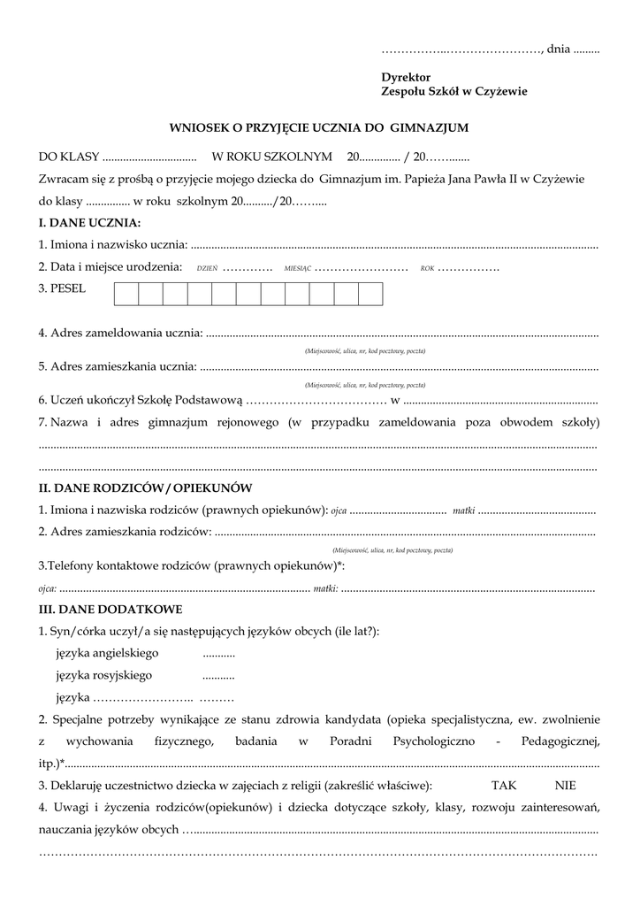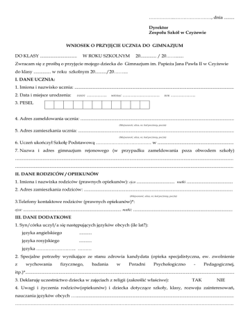 ……………..……………………, dnia ......... Dyrektor Zespołu Szkół w Czyżewie WNIOSEK O PRZYJĘCIE UCZNIA DO GIMNAZJUM DO KLASY ................................ W ROKU SZKOLNYM 20.............. / 20……....... Zwracam się z prośbą o przyjęcie mojego dziecka do Gimnazjum im. Papieża Jana Pawła II w Czyżewie do klasy ............... w roku szkolnym 20........../20…….... I. DANE UCZNIA: 1. Imiona i nazwisko ucznia: .......................................................................................................................................... 2. Data i miejsce urodzenia: DZIEŃ …………. MIESIĄC …………………… ROK ……………. 3. PESEL 4. Adres zameldowania ucznia: ..................................................................................................................................... (Miejscowość, ulica, nr, kod pocztowy, poczta) 5. Adres zamieszkania ucznia: ....................................................................................................................................... (Miejscowość, ulica, nr, kod pocztowy, poczta) 6. Uczeń ukończył Szkołę Podstawową ……………………………… w .................................................................. 7..Nazwa i adres gimnazjum rejonowego (w przypadku zameldowania poza obwodem szkoły) ............................................................................................................................................................................................. ............................................................................................................................................................................................. II. DANE RODZICÓW / OPIEKUNÓW 1. Imiona i nazwiska rodziców (prawnych opiekunów): ojca ................................. matki ........................................ 2. Adres zamieszkania rodziców: ................................................................................................................................. (Miejscowość, ulica, nr, kod pocztowy, poczta) 3.Telefony kontaktowe rodziców (prawnych opiekunów)*: ojca: ..................................................................................... matki: ...................................................................................... III. DANE DODATKOWE 1. Syn/córka uczył/a się następujących języków obcych (ile lat?): języka angielskiego ......................... języka rosyjskiego ........................... języka …………………….. ……… 2. Specjalne potrzeby wynikające ze stanu zdrowia kandydata (opieka specjalistyczna, ew. zwolnienie z wychowania fizycznego, badania w Poradni Psychologiczno - Pedagogicznej, itp.)*..................................................................................................................................................................................... 3. Deklaruję uczestnictwo dziecka w zajęciach z religii (zakreślić właściwe): TAK NIE 4. Uwagi i życzenia rodziców(opiekunów) i dziecka dotyczące szkoły, klasy, rozwoju zainteresowań, nauczania języków obcych …......................................................................................................................................... ……………………………………………………………………………………………………………………………. IV. OŚWIADCZENIA RODZICÓW (OPIEKUNÓW PRAWNYCH) 1. Oświadczam, że informacje podane przeze mnie w niniejszej karcie zgłoszenia dziecka do gimnazjum są zgodne z rzeczywistością . ................................................................... (Podpis rodzica/opiekuna prawnego) 2. Wyrażam zgodę na przetwarzanie danych osobowych zawartych w niniejszej karcie zgłoszenia dziecka do Gimnazjum im. Papieża Jana Pawła II w Czyżewie w celu dokonania rekrutacji oraz rozpoczęcia nauki w Gimnazjum. ................................................................... (Podpis rodzica/opiekuna prawnego) 3. Oświadczam, że zgodnie z art. 24 ust. 1 Ustawy z dnia 29 sierpnia 1997 r. o ochronie danych osobowych (Dz. U. 2002 r. Nr 101, poz. 926 ze zm.) zostałem(am) poinformowany(a), że: − administratorem danych osobowych zawartych w niniejszej karcie zgłoszenia dziecka do gimnazjum jest Zespół Szkół w Czyżewie Gimnazjum im. Papieża Jana Pawła II w Czyżewie, − przetwarzanie w/w danych osobowych będzie dokonywane w celu przeprowadzenia rekrutacji dziecka do gimnazjum oraz rozpoczęcia nauki w szkole, − administrator danych nie będzie przekazywać w/w danych osobowych innym podmiotom, chyba że obowiązek przekazania tych danych będzie wynikał z przepisów prawa, − mam prawo dostępu do treści w/w danych osobowych i prawo ich poprawiania, − dane osobowe wskazane w niniejszej karcie w punkcie II pod pozycją 3) i III 2) zostały podane przeze mnie dobrowolnie, natomiast podanie pozostałych danych było obowiązkowe i niezbędne dla realizacji art. 14 Ustawy z dnia 7 września 1991 r. o systemie oświaty (Dz. U. 2004 r. Nr 256, poz. 2572 ze zm.) oraz Rozporządzenia Ministra Edukacji Narodowej i Sportu z dnia 20 lutego 2004 r. w sprawie warunków i trybu przyjmowania uczniów do szkół publicznych oraz przechodzenia z jednych typów szkół do innych (Dz. U. Nr 26, poz.232ze zm.). ................................................................... (podpis rodzica/opiekuna prawnego) 4. Wyrażam** / nie wyrażam** zgodę na przetwarzanie wizerunku /zdjęć/ mojego dziecka na terenie szkoły oraz stronie internetowej szkoły w związku z udziałem i osiągnięciami w różnych projektach, konkursach, zawodach itp. ........................................................ (podpis rodzica/opiekuna prawnego) * Dane podawane dobrowolnie. ** Niepotrzebne skreślić. Załączniki: 1. Świadectwo ukończenia szkoły podstawowej ( po ukończeniu szkoły ) – oryginał. 2. Z