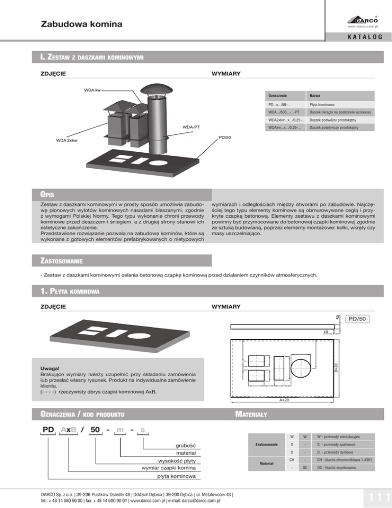 Zabudowa komina KATALOG I. ZESTAW Z DASZKAMI KOMINOWYMI ZDJĘCIE WYMIARY Oznaczenie Nazwa PD...x.../50-... Płyta kominowa WDA.../500...-...-PT Daszek okrągły na podstawie wciskanej WDA2xkw...x.../0,25-... Daszek podwójny prostokątny WDAkw...x.../0,25-... Daszek pojedynczy prostokątny OPIS Zestaw z daszkami kominowymi w prosty sposób umożliwia zabudowę pionowych wylotów kominowych nasadami blaszanymi, zgodnie z wymogami Polskiej Normy. Tego typu wykonanie chroni przewody kominowe przed deszczem i śniegiem, a z drugiej strony stanowi ich estetyczne zakończenie. Przedstawione rozwiązanie pozwala na zabudowę kominów, które są wykonane z gotowych elementów prefabrykowanych o nietypowych wymiarach i odległościach między otworami po zabudowie. Najczęściej tego typu elementy kominowe są obmurowywane cegłą i przykryte czapką betonową. Elementy zestawu z daszkami kominowymi powinny być przymocowane do betonowej czapki kominowej zgodnie ze sztuką budowlaną, poprzez elementy montażowe: kołki, wkręty czy masy uszczelniające. ZASTOSOWANIE - Zestaw z daszkami kominowymi osłania betonową czapkę kominową przed działaniem czynników atmosferycznych. 1. PŁYTA KOMINOWA WYMIARY 50 ZDJĘCIE PD/50 B+20 10 Uwaga! Brakujące wymiary należy uzupełnić przy składaniu zamówienia lub przesłać własny rysunek. Produkt na indywidualne zamówienie klienta. (- - - -) rzeczywisty obrys czapki kominowej AxB. A+20 OZNACZENIA / KOD PRODUKTU MATERIAŁY PD AxB / 50 - m - s grubość Zastosowanie W W W - przewody wentylacyjne S - S - przewody spalinowe materiał D - D - przewody dymowe wysokość płyty wymiar czapki komina CH - CH - blacha chromoniklowa 1.4301 - OC Materiał OC - blacha ocynkowana płyta kominowa DARCO Sp. z o.o. | 39-206 Pustków Osiedle 48 | Oddział Dębica | 39-200 Dębica | ul. Metalowców 43 | tel.: + 48 14 680 90 00 | fax: + 48 14 680 90 01 | www.darco.com.pl | e-mail: [email protected] 111 Zabudowa komina KATALOG 2. DASZEK PODWÓJNY PROSTOKĄTNY ZDJĘCIE WYMIARY WDA 2Xkw/0,25 (2xA)+120 250 ~500 80 B+80 4x 6.2 80 20 B-2 B+80 A-2 42 A-2 (2xA)+120 Uwaga! Przy składaniu zamówienia należy podać rzeczywiste wymiary otworu kominowego A i B lub przesłać własny rysunek Wymiary przykładowe OZNACZENIA / KOD PRODUKTU WDA2xkw AxB / 0,25 - m s A B 120 160 MATERIAŁY grubość materiał Zastosowanie wysokość wymiary W W W - przewody wentylacyjne CH - CH - blacha chromoniklowa 1.4301≠0,6 - OC Materiał daszek podwójny prostokątny OC - blacha ocynkowana gr.0,5 *Produkt na indywidualne zamówienie klienta. 3. DASZEK POJEDYNCZY PROSTOKĄTNY ZDJĘCIE WYMIARY WDA kw/0,25 A+80 250 ~500 80 B+80 4x 6.2 80 20 A-2 A+80 B-2 B+80 Uwaga! Przy składaniu zamówienia należy podać rzeczywiste wymiary otworu kominowego A i B lub przesłać własny rysunek Wymiary przykładowe OZNACZENIA / KOD PRODUKTU WDA kw AxB / 0,25 - m s grubość A B 100 270 MATERIAŁY materiał wysokość wymiary daszek pojedynczy prostokątny Zastosowanie W W W - przewody wentylacyjne CH - CH - blacha chromoniklowa 1.4301≠0,6 - OC Materiał OC - blacha ocynkowana gr.0,5 *Produkt na indywidualne zamówienie klienta. 112 Wydanie 2014 Zabudowa komina KATALOG 4. DASZEK OKRĄGŁY NA PODSTAWIE WCISKANEJ ZDJĘCIE WYMIARY WDA/500-PT D 157 ~500 Uwaga: Dla Ø > 200 daszek stożkowy DN - 6 A OZNACZENIA / KOD PRODUKTU WDA x / 500 m - s - PT podstawa wciskana DN 140 160 180 200 225 250 A 177 197 217 237 257 287 D 290 290 290 350 370 400 MATERIAŁY grubość materiał wysokość - S S - przewody spalinowe D - D - przewody dymowe Ż - Ż - bl. żaroodporna 1.4828≠0,8 - CH Zastosowanie DN średnica daszek okrągły Materiał CH - bl. chromoniklowa 1.4301≠0,8 5. PODSTAWA WCISKANA - ROZBIERALNA ZDJĘCIE WYMIARY 157 ~500 PRT/500-R DN - 6 A OZNACZENIA / KOD PRODUKTU PRT x / 500 m - s - R wersja rozbieralna DN 140 160 180 200 225 250 A 177 197 217 237 257 287 MATERIAŁY grubość materiał wysokość DN średnica podstawa wciskana DARCO Sp. z o.o. | 39-206 Pustków Osiedle 48 | Oddział Dębica | 39-200 Dębica | ul. Metalowców 43 | tel.: + 48 14 680 90 00 | fax: + 48 14 680 90 01 | www.darco.com.pl | e-mail: [email protected] - S S - przewody spalinowe Zastosowanie D - D - przewody dymowe Ż - Ż - bl. żaroodporna 1.4828≠0,8 - CH CH - bl. chromoniklowa 1.4301 Materiał 113 Zabudowa komina KATALOG II. ZESTAW Z NASADAMI KOMINOWYMI ZDJĘCIE Oznaczenie Nazwa PD...x.../50-... Płyta kominowa PRT.../500...-...-R Podstawa wciskana - rozbieralna RO200CH-DR-R Rotowent Dragon na podst. rozbieralnej TU... ... ...-T-R Turbowent Tulipan na podst. rozbieralnej PKR...x.../150...-R Podstawa kominowa redukcyjna PKR...x.../150...-R-T/25 Podstawa kominowa redukcyjna T/25 Uwaga! Należy sprawdzić, czy rozmieszczenie nasad pozwoli na ich bezkolizyjną pracę. OPIS Zestaw z nasadami kominowymi w prosty sposób umożliwia zabudowę pionowych wylotów kominowych nasadami blaszanymi, zgodnie z wymogami Polskiej Normy. Tego typu wykonanie chroni przewody kominowe przed deszczem i śniegiem, a z drugiej strony stanowi ich estetyczne zakończenie. Dodatkowo nasady kominowe osłaniają wylot przed zawiewaniem wiatru i wspomagają ciąg w kominie. Przedstawione rozwiązanie pozwala na zabudowę kominów, które są wykonane z gotowych elementów prefabrykowanych o nietypowych wymiarach i odległościach między otworami po zabudowie. Najczęściej tego typu elementy kominowe są obmurowywane cegłą i przykryte czapką betonową. Elementy zestawu z nasadami kominowymi powinny być przymocowane do betonowej czapki kominowej zgodnie ze sztuką budowlaną, poprzez elementy montażowe: kołki, wkręty czy masy uszczelniające itp. ZASTOSOWANIE - Płyta kominowa osłania betonową czapkę kominową przed działaniem czynników atmosferycznych. - Nasady kominowe osłaniają wylot przed zawiewaniem wiatru i wspomagają ciąg w kominie. III. ZESTAW Z NASADAMI KOMINOWYMI HYBRYDOWYMI ZDJĘCIE Oznaczenie PD...x.../50-... Płyta kominowa BUT.../...
