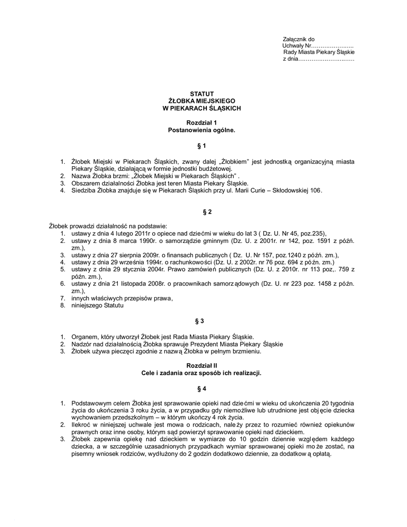 Załącznik do Uchwały Nr………………….. Rady Miasta Piekary Śląskie z dnia………………………… STATUT ŻŁOBKA MIEJSKIEGO W PIEKARACH ŚLĄSKICH Rozdział 1 Postanowienia ogólne. §1 1. Żłobek Miejski w Piekarach Śląskich, zwany dalej „Żłobkiem” jest jednostką organizacyjną miasta Piekary Śląskie, działającą w formie jednostki budżetowej. 2. Nazwa Żłobka brzmi: „Żłobek Miejski w Piekarach Śląskich” . 3. Obszarem działalności Żłobka jest teren Miasta Piekary Śląskie. 4. Siedziba Żłobka znajduje się w Piekarach Śląskich przy ul. Marii Curie – Skłodowskiej 106. §2 Żłobek prowadzi działalność na podstawie: 1. ustawy z dnia 4 lutego 2011r o opiece nad dziećmi w wieku do lat 3 ( Dz. U. Nr 45, poz.235), 2. ustawy z dnia 8 marca 1990r. o samorządzie gminnym (Dz. U. z 2001r. nr 142, poz. 1591 z późń. zm.), 3. ustawy z dnia 27 sierpnia 2009r. o finansach publicznych ( Dz. U. Nr 157, poz.1240 z późń. zm.), 4. ustawy z dnia 29 września 1994r. o rachunkowości (Dz. U. z 2002r. nr 76 poz. 694 z późn. zm.) 5. ustawy z dnia 29 stycznia 2004r. Prawo zamówień publicznych (Dz. U. z 2010r. nr 113 poz,. 759 z późn. zm.), 6. ustawy z dnia 21 listopada 2008r. o pracownikach samorz ądowych (Dz. U. nr 223 poz. 1458 z późn. zm.), 7. innych właściwych przepisów prawa, 8. niniejszego Statutu §3 1. Organem, który utworzył Żłobek jest Rada Miasta Piekary Śląskie. 2. Nadzór nad działalnością Żłobka sprawuje Prezydent Miasta Piekary Śląskie 3. Żłobek używa pieczęci zgodnie z nazwą Żłobka w pełnym brzmieniu. Rozdział II Cele i zadania oraz sposób ich realizacji. §4 1. Podstawowym celem Żłobka jest sprawowanie opieki nad dzie ćmi w wieku od ukończenia 20 tygodnia życia do ukończenia 3 roku życia, a w przypadku gdy niemożliwe lub utrudnione jest obj ęcie dziecka wychowaniem przedszkolnym – w którym ukończy 4 rok życia. 2. Ilekroć w niniejszej uchwale jest mowa o rodzicach, nale ży przez to rozumieć również opiekunów prawnych oraz inne osoby, którym sąd powierzył sprawowanie opieki nad dzieckiem. 3. Żłobek zapewnia opiekę nad dzieckiem w wymiarze do 10 godzin dziennie wzgl ędem każdego dziecka, a w szczególnie uzasadnionych przypadkach wymiar sprawowanej opieki mo że zostać, na pisemny wniosek rodziców, wydłużony do 2 godzin dodatkowo dziennie, za dodatkow ą opłatą. §5 1. Do zadań Żłobka należy w szczególności: 1) zapewnianie dziecku właściwej do jego wieku opieki pielęgnacyjnej i edukacyjnej, 2) zaspakajanie indywidualnych potrzeb dziecka, 3) wspieranie rozwoju psychomotorycznego dziecka poprzez odpowiednie zaj ęcia, 4) wspomaganie rodziny w wychowywaniu dziecka. 2. Żłobek realizuje swoje zadania przez: 1) stymulację aktywności dziecka umożliwiający jego harmonijny rozwój, 2) promowanie wiedzy prozdrowotnej wśród rodziców, 3) tworzenie przyjaznego, zgodnego z oczekiwaniami rodziców środowiska, które w skuteczny sposób zabezpiecza potrzeby małego dziecka, 4) zagwarantowanie miejsca do zabawy i odpoczynku dzieciom. §6 1. Żłobek funkcjonuje przez cały rok. 2. Zapisy do Żłobka są prowadzone przez cały rok, w miarę istnienia wolnych miejsc w Żłobku. Rozdział III Warunki przyjmowania dzieci do Żłobka. §7 1. Podstawą przyjęcia dziecka do Żłobka jest: 1) pozytywna opinia komisji rozpatruj ącej wnioski i decydującej o kolejności przyjęć, 2) zawarcie umowy cywilno-prawnej w sprawie korzystania z usług Żłobka. 2. Dzieci nieprzyjęte do Żłobka, w związku z brakiem miejsc, umieszczane s ą na liście oczekujących na przyjęcie do Żłobka. 3. Warunkiem utrzymania miejsca na li ście oczekujących na przyjęcie do Żłobka jest comiesięczne potwierdzanie przez rodzica albo opiekuna praw nego, woli korzystania z usług Żłobka. 4. Niespełnienie warunku, o którym mowa w ust. 3, skutkuje wykre śleniem z listy oczekujących na przyjęcie do Żłobka. 5. W przypadku zwolnienia się miejsca w Żłobku, dzieci przyjmowane są zgodnie z kolejnością na liście oczekujących na przyjęcie do Żłobka. Rozdział IV Opłaty za pobyt i wyżywienie §8 1. Opłaty: 1) stałą miesięczną za pobyt dziecka w Żłobku, 2) godzinową za wydłużony pobyt dziecka w Żłobku, 3) dzienną za wyżywienie, oraz warunki całkowitego lub częściowego zwolnienia od ponoszenia opłat, jak i terminy ponoszenia opłat ustala Rada Miasta Piekary Śląskie w drodze odrębnej uchwały. 2. Opłaty, o których mowa w ust.1, są wnoszone na rzecz Miasta Piekary Śląskie, za pośrednictwem Żłobka. §9 W przypadku nieobecności dziecka w Żłobku rodzice ponoszą opłatę o której mowa w § 8, ust. 1, pkt 1 w pełnej wysokości, natomiast opłata za wyżywienie ponoszona jest proporcjonalnie do ilo ści dni, w których dziecko korzysta ze Żłobka. Rozliczenie pobranej ju ż opłaty dokonywane jest w nast ępnym miesiącu. Rozdział V Mienie i gospodarka finansowa § 10 1. Żłobek wyposażony jest w mienie komunalne, stanowiące własność Miasta Piekary Śląskie, służące realizacji zadań statutowych. 2. Dyrektor samodzielnie zarządza przekazanym mu mieniem, w granicach udzielonych upowa żnień. 3. Zarząd i ochrona mienia wykonywane są z zachowaniem należytej staranności. § 11 1. Żłobek prowadzi gospodarkę finansową, według zasad określonych dla jednostek budżetowych w ustawie o finansach publicznych. 2. Za prawidłową gospodarkę finansową Żłobka odpowiada dyrektor. Rozdział VI Postanowienia końcowe § 12 1. W sprawach nie uregulowanych w niniejszym Statucie zastosowanie maj ą odpowiednie przepisy prawne. 2. Wszelkie zmiany Statutu dokonywane są w trybie obowiązującym przy jego nadaniu.