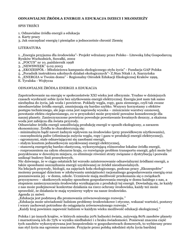 ODNAWIALNE ŹRÓDŁA ENERGII A EDUKACJA DZIECI I MŁODZIEŻY SPIS TREŚCI 1. Odnawialne źródła energii a edukacja 2. Karty pracy 3. Jak oszczędzać energię i pieniądze a jednocześnie chronić Ziemię LITERATURA 1. „Energia przyjazna dla środowiska”- Projekt wdrażany przez Polsko - Litewską Izbę Gospodarczą Rynków Wschodnich, Suwałki, 2002 2. „FOCUS” nr 10, październik 1998 3. „NEWSWEEK” 9.02.2003 4. „EKOZESPÓŁ - Młodzieżowa kampania ekologicznego stylu życia” - Fundacja GAP Polska 5. „Poradnik instruktora szkolnych działań ekologicznych”- Z.Stan Nitak i A. Szarzyńska 6. „ENERGIA w Twoim domu” - Regionalny Ośrodek Edukacji Ekologicznej Kraków 1999, E. Tyralska - Wojtycza ODNAWIALNE ŹRÓDŁA ENERGII A EDUKACJA Zapotrzebowanie na energię w społeczeństwie XXI wieku jest olbrzymie. Trudno w dzisiejszych czasach wyobrazić sobie życie bez użytkowania energii elektrycznej. Energia jest nam tak samo niezbędna do życia, jak woda i powietrze. Pokłady węgla, ropy, gazu ziemnego, czyli tak zwane nieodnawialne źródła energii, zmniejszają się bardzo szybko. Wszyscy korzystamy z efektów postępu technicznego, ale jego cena jest naprawdę wysoka – zniszczenie warstwy ozonowej, powstanie efektu cieplarnianego, co w przyszłości może przynieść poważne konsekwencje dla naszej planety. Zanieczyszczone powietrze powoduje powstawanie kwaśnych deszczy, a skażona woda jest zabójcza dla świata przyrody. Odnawialne źródła energii umożliwiają produkcję energii w sposób ekologiczny, a zarazem ekonomiczny. Źródła te charakteryzują się: - minimalnym bądź nawet żadnym wpływem na środowisko (przy prawidłowym użytkowaniu), - oszczędnością paliw (eliminacja zużycia węgla, ropy i gazu w produkcji energii elektrycznej), - ogromnymi, stale odnawiającymi się zasobami energii, - stałym kosztem jednostkowym uzyskiwanej energii elektrycznej, - stanowią energetykę bardzo elastyczną, wykorzystującą różnorodne lokalne źródła energii, - rozproszeniem na całym obszarze kraju, co rozwiązuje problem transportu energii, gdyż może być pozyskiwana w dowolnym miejscu, co eliminuje również straty związane z dystrybucją i pozwala uniknąć budowy linii przesyłowych. Nic dziwnego, że w ciągu ostatnich lat wzrosło zainteresowanie odnawialnymi źródłami energii, a także sposobami oszczędzania energii uzyskiwanej ze źródeł nieodnawialnych. Na lekcjach przyrody, biologii, na zajęciach koła ekologicznego, podczas pracy „Ekozespołów” możemy pomagać dzieciom w zdobywaniu umiejętności racjonalnego gospodarowania energią oraz poszanowania jej - w domu, szkole. Uczniowie mają możliwość przekonania się o związkach przyczynowo – skutkowych między sposobem gospodarowania energią w domu każdego z nas, a stopniem zanieczyszczenia środowiska wynikającym z produkcji tej energii. Dowiadują się, że każdy z nas może podejmować konkretne działania na rzecz ochrony środowiska, każdy też może sprawdzić, że działania te mają wymierny wpływ na nasze środowisko. Agenda 21 mówi: „Edukacja jest podstawą dla promowania zrównoważonego rozwoju.” „Edukacja może uświadomić ludziom problemy środowiskowe i etyczne, wskazać wartości, postawy i wzory zachowań potrzebne do osiągnięcia zrównoważonego rozwoju." „Każdy kraj powinien zapewnić ludziom w każdym wieku możliwość edukacji ekologicznej.” Polska i 30 innych krajów, w których mieszka 20% ludności świata, zużywają 80% zasobów planety i marnotrawią ich do 75% w wyniku niedbałości i z braku świadomości. Ponieważ znaczna część tych zasobów wykorzystywana jest bezpośrednio w gospodarstwach domowych, to wybierany przez nas styl życia ma ogromne znaczenie. Przyjęcie przez polską młodzież stylu życia bardziej przyjaznego dla środowiska pozwoli w dużym stopniu rozwiązywać problemy ekologiczne. KARTA PRACY NR 1 Świet(l)ny pomysł Dlaczego działać? Możesz być obywatelem planety za każdym razem, gdy wychodzisz na dłużej z pokoju. Jedyne, co powinieneś zrobić, to wyłączyć wszystkie urządzenia. To działanie na rzecz Ziemi pomoże ci jednocześnie zmniejszyć rachunki za energię elektryczną w twoim gospodarstwie domowym. Działanie na rzecz Ziemi - Polega ono na pamiętaniu o wyłączaniu urządzeń elektrycznych. Oto, jak to zrobić: * Wyobraź sobie Ziemię jako bliskie i drogie tobie miejsce. Niech ten obraz towarzyszy ci za każdym razem, gdy opuszczasz dane pomieszczenie w domu, jako przypomnienie o przeciwdziałaniu zanieczyszczeniu powietrza. * Gdy wychodzisz z pokoju jako ostatni, wyłącz światło. * Gdy opuszczasz pokój, wyłącz radio, telewizor, odtwarzacz płyt kompaktowych, wideo. Nie zapomnij także o komputerze. Materiały Twoja nowa świadomość Czas Kilka dodatkowych sekund Oszczędności zasobów Oszczędzasz energię elektryczną i domowy budżet, a także dzięki mniejszemu spalaniu węgla wpływasz na polepszenie jakości powietrza. To się nazywa działanie pełne mocy! KARTA PRACY NR 2 Ciepły sweter Dlaczego działać? W większości mieszkań termostat przy kaloryferze nastawiony jest zazwyczaj na trochę wyższą temperaturę, niż jest to potrzebne. Możesz obniżyć nieco temperaturę, wciąż odczuwając komfort. To działanie na rzecz Ziemi pokaże ci jeden z najprostszych sposobów zaoszczędzenia energii. Działanie na rzecz Ziemi[JD1]: * Zwołaj spotkanie całej rodziny domownikami. Omów to działanie z pozostałymi domownikami i poproś, aby włączyli się do niego razem z tobą. * W ciągu dnia, gdy wszyscy są w domu, ustaw termostat na poziomie „w swetrze”: pomiędzy 19 a 21°C. * Przed pójściem spać lub w czasie, gdy nikogo nie ma w domu, ustaw termostat na temperaturę „pod kołdrą”: między 15 a 17°C. Materiały Sweter lub ciepły podkoszulek; kołdra. Czas Kilka minut na spotkanie, kilka sekund na ustawienie termostatu. Oszczędnoś