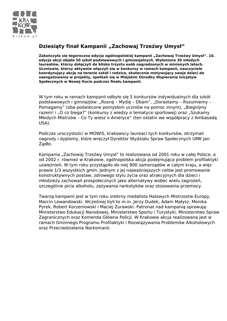 Dziesiąty finał Kampanii „Zachowaj Trzeźwy Umysł” Zakończyła się tegoroczna edycja ogólnopolskiej kampanii „Zachowaj Trzeźwy Umysł”. 10. edycja akcji objęła 50 szkół podstawowych i gimnazjalnych. Wyłoniono 30 młodych laureatów, którzy dołączyli do blisko trzystu osób nagrodzonych w minionych latach. Uczniowie, którzy aktywnie włączyli się w konkursy w ramach kampanii, nauczyciele koordynujący akcję na terenie szkół i rodzice, skutecznie motywujący swoje dzieci do zaangażowania w projekty, spotkali się w Miejskim Ośrodku Wspierania Inicjatyw Społecznych w Nowej Hucie podczas finału kampanii. W tym roku w ramach kampanii odbyło się 5 konkursów indywidualnych dla szkół podstawowych i gimnazjów: „Rosnę – Myślę – Dbam”, „Dorastamy – Rozumiemy – Pomagamy” (oba poświecone pomysłom uczniów na pomoc innym), „Biegnijmy razem! i „O co biega?” (konkursy z wiedzy o tematyce sportowej) oraz „Szukamy Młodych Mistrzów – Co Ty wiesz o Ameryce” (ten ostatni we współpracy z Ambasadą USA). Podczas uroczystości w MOWIS, krakowscy laureaci tych konkursów, otrzymali nagrody i dyplomy, które wręczył Dyrektor Wydziału Spraw Społecznych UMK Jan Żądło. Kampania „Zachowaj Trzeźwy Umysł” to realizowana od 2001 roku w całej Polsce, a od 2002 r. również w Krakowie, ogólnopolska akcja podejmująca problem profilaktyki uzależnień. W tym roku przystąpiło do niej 900 samorządów w całym kraju, a więc prawie 1/3 wszystkich gmin. Jednym z jej najważniejszych celów jest promowanie konstruktywnych postaw, zdrowego stylu życia oraz atrakcyjnych dla dzieci i młodzieży zachowań prospołecznych jako alternatywy wobec wielu zagrożeń, szczególnie picia alkoholu, zażywania narkotyków oraz stosowania przemocy. Twarzą kampanii jest w tym roku srebrny medalista Halowych Mistrzostw Europy, Marcin Lewandowski. Wcześniej byli to m.in. Jerzy Dudek, Adam Małysz, Monika Pyrek, Robert Korzeniowski i Maciej Żurawski. Patronat nad kampanią sprawują: Ministerstwo Edukacji Narodowej, Ministerstwo Sportu i Turystyki, Ministerstwo Spraw Zagranicznych oraz Komenda Główna Policji. W Krakowie akcja realizowana jest w ramach Gminnego Programu Profilaktyki i Rozwiązywania Problemów Alkoholowych oraz Przeciwdziałania Narkomanii. Powered by TCPDF (www.tcpdf.org)