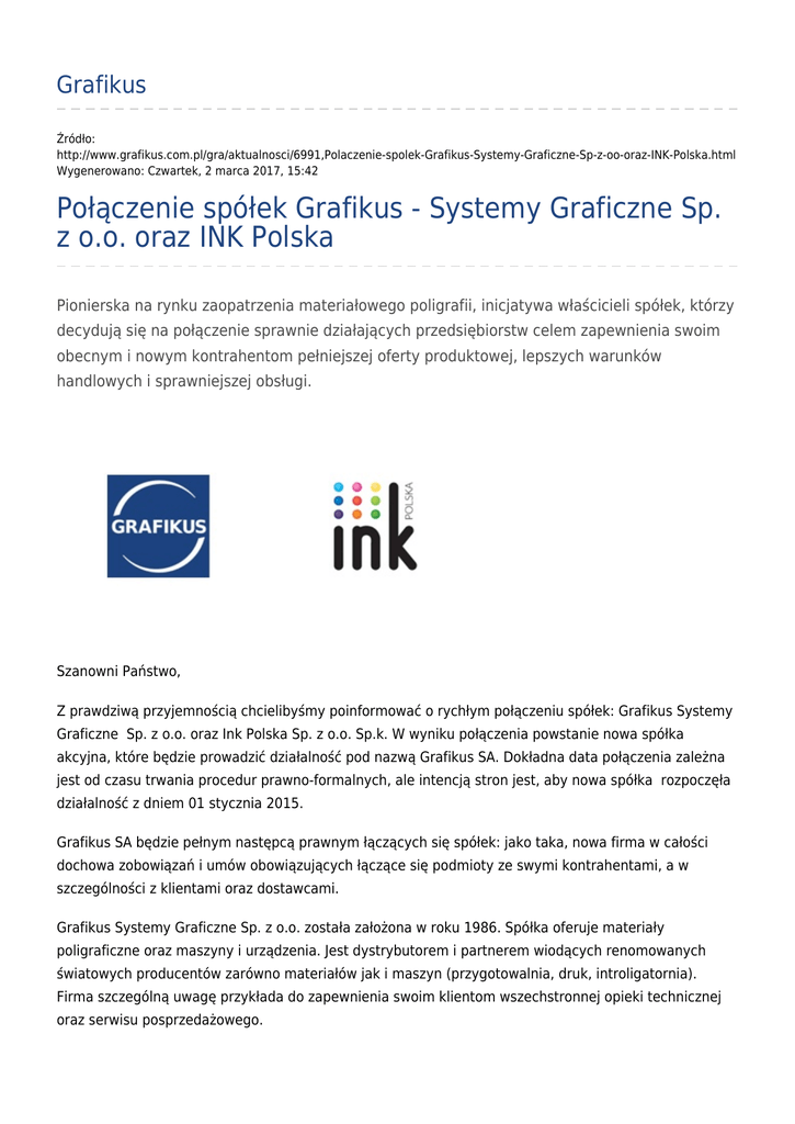 Grafikus Źródło: http://www.grafikus.com.pl/gra/aktualnosci/6991,Polaczenie-spolek-Grafikus-Systemy-Graficzne-Sp-z-oo-oraz-INK-Polska.html Wygenerowano: Czwartek, 2 marca 2017, 15:42 Połączenie spółek Grafikus - Systemy Graficzne Sp. z o.o. oraz INK Polska Pionierska na rynku zaopatrzenia materiałowego poligrafii, inicjatywa właścicieli spółek, którzy decydują się na połączenie sprawnie działających przedsiębiorstw celem zapewnienia swoim obecnym i nowym kontrahentom pełniejszej oferty produktowej, lepszych warunków handlowych i sprawniejszej obsługi. Szanowni Państwo, Z prawdziwą przyjemnością chcielibyśmy poinformować o rychłym połączeniu spółek: Grafikus Systemy Graficzne Sp. z o.o. oraz Ink Polska Sp. z o.o. Sp.k. W wyniku połączenia powstanie nowa spółka akcyjna, które będzie prowadzić działalność pod nazwą Grafikus SA. Dokładna data połączenia zależna jest od czasu trwania procedur prawno-formalnych, ale intencją stron jest, aby nowa spółka rozpoczęła działalność z dniem 01 stycznia 2015. Grafikus SA będzie pełnym następcą prawnym łączących się spółek: jako taka, nowa firma w całości dochowa zobowiązań i umów obowiązujących łączące się podmioty ze swymi kontrahentami, a w szczególności z klientami oraz dostawcami. Grafikus Systemy Graficzne Sp. z o.o. została założona w roku 1986. Spółka oferuje materiały poligraficzne oraz maszyny i urządzenia. Jest dystrybutorem i partnerem wiodących renomowanych światowych producentów zarówno materiałów jak i maszyn (przygotowalnia, druk, introligatornia). Firma szczególną uwagę przykłada do zapewnienia swoim klientom wszechstronnej opieki technicznej oraz serwisu posprzedażowego. Ink Polska Sp. z o.o. sp.k., poprzednio znana jako Sun Dystrybucja Sp. z o.o., to poznańska firma z dziesięcioletnią tradycją specjalizująca się głównie w sprzedaży farb graficznych oraz lakierów. Spółka posiada bogato wyposażone laboratorium i zaplecze produkcyjne (farby fleksograficzne, lakiery). Znaczącym osiągnięciem spółki jest uzyskanie pozycji wiodącego krajowego dostawcy farb i lakierów do druku wąsko wstęgowego (etykietowego). Obie łączące się spółki posiadają długą tradycję oraz bogate doświadczenie w działalności na rynku poligraficznym. Jednocześnie obszary kompetencji obu firm, w części wspólne, doskonale się uzupełniają. Właściciele oraz kierownictwo nowej spółki wierzą, że połączone zespoły sprzedaży, jak również rozbudowany dział serwisu i opieki technicznej, w jeszcze doskonalszy, szybszy i w pełni profesjonalny sposób prowadzić będą obsługę Państwa firm – naszych klientów. Podkreślić warto, że jest to bardzo rzadka, wręcz pionierska na rynku zaopatrzenia materiałowego poligrafii, inicjatywa właścicieli spółek, którzy decydują się na połączenie sprawnie działających przedsiębiorstw celem zapewnienia swoim obecnym i nowym kontrahentom pełniejszej oferty produktowej, lepszych warunków handlowych i sprawniejszej obsługi. Siedzibą nowej spółki będzie Warszawa, a dokładnie obecna siedziba spółki Grafikus Systemy Graficzne Sp. z o.o. Oddziały spółki Grafikus w Katowicach, Krakowie i Warszawie dalej będą prowadzić swoją działalność: oddziały obu spółek w Poznaniu zostaną połączone, o dokładnym terminie tej zmiany będziemy Państwa informować. Do czasu połączenia nie zostanie zmieniony system sprzedaży (przyjmowanie zamówień; fakturowanie; realizacja zamówień – dowóz towarów), nie zmieniają się też osoby, które były dotychczas odpowiedzialne za wielopłaszczyznowe kontakty z Państwa firmą (biuro obsługi klienta, służby finansowe, działy sprzedaży i techniczny). O przyszłych zmianach wynikających z integracji firm i ich systemów księgowych etc. będziemy informować na bieżąco. Dołożymy wszelkich starań, aby fakt łączenia spółek nie powodował żadnych odczuwalnych dla Państwa niedogodności. Pozostajemy do Państwa dyspozycji, chętnie odpowiemy na wszelkie Państwa pytania lub też udzielimy dodatkowych informacji: Jacek Kuśmierczyk Marek Garboliński Załączniki do strony Plan połączenia spółek Grafikus i Ink 1.41 MB