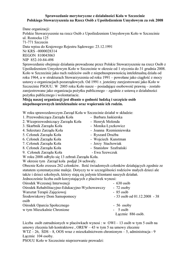 Sprawozdanie merytoryczne z działalności Koła w Szczecinie Polskiego Stowarzyszenia na Rzecz Osób z Upośledzeniem Umysłowym za rok 2008 Dane organizacji: Polskie Stowarzyszenie na rzecz Osób z Upośledzeniem Umysłowym Koło w Szczecinie ul. Rostocka 125 71-771 Szczecin Data wpisu do Krajowego Rejestru Sądowego: 23.12.1991 Nr KRS –0000028314 REGON 810043063 NIP 852-10-84-498 Sprawozdanie obejmuje działania prowadzone przez Polskie Stowarzyszenie na rzecz Osób z Upośledzeniem Umysłowym Koło w Szczecinie w okresie od 1 stycznia do 31 grudnia 2008. Koło w Szczecinie jako ruch rodziców osób z niepełnosprawnością intelektualną działa od roku 1964, a w strukturach Stowarzyszenia od roku 1991 – powołane jako ciągłość z mocy ustawy o organizacjach pozarządowych. Od 1991 r. jesteśmy zarejestrowani jako Koło w Szczecinie PSOUU. W 2005 roku Koło nasze – posiadające osobowość prawną – zostało zarejestrowane jako organizacja poŜytku publicznego – zgodnie z ustawą o działalności poŜytku publicznego i wolontariacie. Misją naszej organizacji jest dbanie o godność ludzką i szczęście osób niepełnosprawnych intelektualnie oraz wspieranie ich rodzin. W roku sprawozdawczym Zarząd Koła w Szczecinie działał w składzie: 1. Przewodnicząca Zarządu Koła - Barbara Jaskierska 2. Wiceprzewodniczący Zarządu Koła - Henryk Molenda 3. Skarbnik Zarządu Koła - Monika Łyszkowicz 4. Sekretarz Zarządu Koła - Joanna Rzemieniewska 5. Członek Zarządu Koła - Ryszard DruŜba 6. Członek Zarządu Koła - Wojciech Kunstman 7. Członek Zarządu Koła - Jerzy Stachowiak 8. Członek Zarządu Koła - Stanisław Szafrański 9. Członek Zarządu Koła - Ewa Szewczuk W roku 2008 odbyło się 13 zebrań Zarządu Koła. W okresie tym Zarząd koła podjął 24 uchwały. Obecnie Koło zrzesza 262 członków. Ilość świadomych członków działających zgodnie ze statutem systematycznie maleje. Dotyczy to w szczególności rodziców małych dzieci ale takŜe i dzieci szkolnych, którzy stają się jedynie klientami naszych działań. Jednocześnie liczba osób korzystających z placówek wynosi: Ośrodek Wczesnej Interwencji - 630 osób Ośrodek Rehabilitacyjno-Edukacyjno-Wychowawczy - 72 osoby Warsztat Terapii Zajęciowej - 85 osób Środowiskowy Dom Samopomocy - 33 osób od 01.12.2008 - 38 osób Ośrodek Oparcia Społecznego - 56 osoby w tym Mieszkalnie Chronione - 5 osób Łącznie 886 osób. Liczba osób zatrudnionych w placówkach wynosi : w OWI – 13 osób w tym 5 osób na umowy zlecenia lub kontraktowe , OREW – 43 w tym 5 na umowy zlecenie WTZ – 26, ŚDS – 8, OOS wraz z mieszkalnictwem chronionym – 5, administracja - 9 Łącznie 104 osoby. PSOUU Koło w Szczecinie nieprzerwanie prowadzi: 1. Ośrodek Wczesnej Interwencji działający od 1979 – zadanie realizowane zgodnie z Ustawą o ochronie zdrowia psychicznego i Ustawie o zakładach opieki zdrowotnej. Ośrodek prowadzi wielospecjalistyczną diagnozę i rehabilitację psycho – ruchową oraz wsparcie rodziny. Placówka ma formułę medyczno – rehabilitacyjno – edukacyjną. Finansowana jest częściowo poprzez projekt/ kontrakt z Narodowym Funduszem Zdrowia oraz opracowywanie projektów finansowanych z innych źródeł, w tym w szczególności z umów z Gminą – Miasto Szczecin. Obecnie rehabilitacją objętych jest 630 dzieci z dysfunkcjami w wieku od 0 do 7 lat. 2. Ośrodek Rehabilitacyjno – Edukacyjno - Wychowawczy działa od 1989 – jest niepubliczną placówką Stowarzyszenia na Rzecz Osób z Upośledzeniem Umysłowym Koło w Szczecinie. W okresie sprawozdawczym, działalnością edukacyjną, rewalidacyjną i wychowawczą objętych było: − w ramach subwencji oświatowej - 64 osoby – dzieci, młodzieŜ i osoby dorosłe głęboko i głębiej upośledzone umysłowo z dodatkowymi sprzęŜeniami, − w ramach kontraktu z Narodowym Funduszem Zdrowia zmiennie : 72 osób, − w ramach programu PARTNER III - 64 osoby W ramach Ośrodka od roku 2002 działa zespół „Tańczący Mix” . Zespół składa się z 12 osób w tym 8 osób z niepełnosprawnością intelektualną. W roku 2008 zespół brał udział w wielu spotkaniach z uczestnikami innych Ośrodków RehabilitacyjnoEdukacyjno-Wychowawczych w Nowielinie, Świnoujściu, Kamieniu Pomorskim i Przybiernowie, występował w trakcie takich imprez jak: Spotkanie Organizacji Pozarządowych Pod Platanami, Festiwal Twórczości Osób Niepełnosprawnych Bez Barier, Akcja Zostaw 1% w Szczecinie. 3. Warsztat Terapii Zajęciowej – zadanie realizowane zgodnie z Ustawą o rehabilitacji i zatrudnieniu osób niepełnosprawnych – działa od 1993 roku – na podstawie umowy zawartej pomiędzy Miejskim Ośrodkiem Pomocy Rodzinie a naszym Kołem. Obecnie korzysta z WTZ 85 osób dorosłych z niepełnosprawnością intelektualną. Zadanie realizowane jest w 17 pracowniach tematycznych. Finansowanie działań ustawowych realizowane jest ze środków PFRON, utrzymywanie obiektu , doposaŜenia oraz remonty obiektu finansowane są ze środków bezpośrednio pozyskanych przez Zarząd Koła poprzez projekty oraz wkład własny ze środków finansowych Koła. W roku 2008 przeprowadzono remont obiektu WTZ polegający na nadbudowie klatki schodowej oraz wymianie pokrycia całego dachu. Całość kosztów (219 120,00 zł) pokryto ze środków własnych Koła. 4. Środowiskowy Dom Samopomocy działa od 2000 roku – zadanie realizowane zgodnie z Ustawą o ochronie zdrowia psychicznego oraz Ustawą o pomocy społecznej. Środowiskowy Dom Samopomocy jest placówką dla dorosłych osób z upośledzeniem umysłowym w celu podtrzymania aktywności Ŝyciowej, ciągłego uspołeczniania, nauki zaradności oraz przebywania w grupie rówieśniczej realizującej indywidualne programy. W 2008 roku z placówki korzystało 33 osoby a od grudnia 2008 – 38 osób. Uczestnicy mieli zapewnione podstawowe świadczenia opiekuńcze, edukacyjne i rehabilitacyjne oraz brali udział 