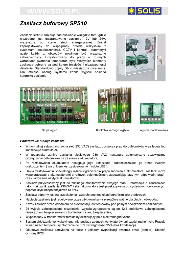 Zasilacz buforowy SPS10 Zasilacz SPS10 znajduje zastosowanie wszędzie tam, gdzie niezbędne jest gwarantowane zasilanie 12V lub 24V, niezależne od stanu sieci energetycznej. Został zaprojektowany do współpracy przede wszystkim z systemami bezpieczeństwa, CCTV i kontroli, automatyki gdzie każdy z obwodów powinien być niezależnie zabezpieczony. Przystosowany do pracy w trudnych warunkach (wahania temperatur, pył). Wszystkie elementy zasilacza dobrane są pod kątem trwałości i niezawodności działania. Standardowo objęty 36cio miesięczną gwarancją. Dla łatwości obsługi systemu każde wyjście posiada kontrolkę zasilania. Grupa wyjść Kontrolka każdego wyjścia Wyjścia monitorowania Podstawowe funkcje zasilacza W normalnej sytuacji (sprawna sieć 230 VAC) zasilacz dostarcza prąd do odbiorników oraz ładuje lub konserwuje akumulator, W przypadku zaniku zasilania sieciowego 230 VAC następuje automatyczne bezzwłoczne przełączenie odbiorników na zasilanie z akumulatora, Po rozładowaniu akumulatora następuje jego odłączenie, zabezpieczające go przed trwałym uszkodzeniem ( warunkiem jest zastosowanie modułu LBB ). Dzięki zastosowaniu specjalnego układu ograniczenia prądu ładowania akumulatora, zasilacz może współpracować z akumulatorami o różnych pojemnościach, zapewniając przy tym odpowiedni prąd i czas ładowania użytych akumulatorów. Zasilacz przystosowany jest do zdalnego monitorowania swojego stanu. Informacja o zdarzeniach takich jak zanik zasilania 230VAC i stan akumulatora jest przekazywana do systemów monitorujących poprzez styki bezpotencjałowe NO/NC. Zasilacz odporny jest na przeciążenia i zwarcie poprzez układ ograniczników prądowych, Napięcie zasilania jest regulowane przez użytkownika – szczególnie ważne dla długich obwodów, Każdy zasilacz przed oddaniem do eksploatacji jest testowany pod pełnym obciążeniem nominalnym, 24 wyjścia zabezpieczone niezależnie, wyjścia zgrupowane są po 12 i dodatkowo zabezpieczone niezależnymi bezpiecznikami z kontrolkami stanu bezpiecznika, Wyposażony w transformator toroidalny eliminujący pole elektromagnetyczne, System chłodzenia konwekcyjnego, nie posiada żadnych wentylatorów ani części ruchomych. Pracuje w warunkach temperatury otoczenie do 35oC w wilgotności 95% (bez kondesacji) Obudowa zasilacza zamykana na klucz z układem sygnalizacji otwarcia drzwi (tamper). Stopień ochrony IP20. Zasilacz pracuje w trybie pracy buforowej - akumulator jest cały czas podłączony do układu ładowania i stanowi awaryjne źródło zasilania w przypadku zaniku napięcia sieciowego. Po naładowaniu akumulator pobiera minimalny prąd konserwujący, który uzupełnia jego samorozładowanie. Standardowo wszystkie wyjścia zabezpieczone są bezpiecznikami 1.25A, 7A na grupę, 10A na obydwie grupy. Inne zabezpieczenia na życzenie. Parametry wejściowe nominalne wejściowe napięcie sieciowe zasilacza UWej nom 230V 50Hz zakres zmian napięcia sieciowego U Wej 190 ... 240 VAC maksymalny prąd pobierany z sieci przez zasilacz I Wej max 0,7 A / 1.3 A Parametry wyjściowe nominalne napięcie wyjściowe U Wyj nom 12 V / 24V zakres napięć wyjściowych zasilacza (regulowane)U Wyj 11,5...14,0 VDC / 23,0...28,0 VDC maksymalny nominalny prąd wyjściowy zasilacza I Wyj nom 10 A *) zabezpieczenia: bezpiecznik główny 10A bezzwłoczny, dwie grupy po 5 A (bezp. bezzwłoczne), 12 wyjść/grupę po 1.25 A (bezp. zwłoczne) (Inne zabezpieczenia na życzenie) Dane dotyczące współpracy z akumulatorami zakres pojemności akumulatorów 30...130 Ah minimalne napięcie rozładowania akumulatorów 10,5 V / 21V Parametry środowiskowe zakres temperatur składowania -40..+70 °C zakres temperatur pracy -5...45 °C wilgotność względna (bez kondensacji) 15...95 % MTBF 130 000h Parametry konstrukcyjne materiał obudowy stal malowana proszkowo wymiary (szer x wys x głęb) 345x295x70 [mm] Obudowa zamykana na klucz (2 szt kluczy w komplecie) Produkt objęty 36-cio miesięczną gwarancją Schemat blokowy *) Przy projektowaniu instalacji należy uwzględnić rezerwę prądu na ładowanie akumulatorów 1.0 – 1.5A. Diagnostyka LED: Czerwony (DC) Zielony (AC) Stan zasilania ON ON Praca zasilacza z AC. Rozładowany lub brak akumulatora buforowego. ON OFF Zasilanie buforowe. Niskie napięcie akumulatora OFF ON Prawidłowa praca zasilacza. OFF OFF Brak napięcia wejściowego AC. Zasilanie buforowe. Zalecenia dotyczące instalacji: Przed przystąpieniem do instalacji urządzenia prosimy dokładnie zapoznać się z niniejszą instrukcją obsługi. Niestosowanie się do zawartych w instrukcji zasad bezpieczeństwa może doprowadzić do wypadku lub ciężkich obrażeń. Producent nie odpowiada za uszkodzenia lub obrażenia spowodowane nieprawidłowym użytkowaniem urządzenia, niezgodnym z instrukcją obsługi. Zasilacz pod obciążeniem (>5A) wydziela dużą ilość energii cieplnej. Temperatura radiatorów chłodzących w skrajnych o przypadkach może przekraczać 100 C. Montować zasilacz w miejscu zapewniającym swobodny ruch powietrza. Należy unikać montażu wszelkiego rodzaju urządzeń wrażliwych na podwyższoną temperaturę pracy nad zasilaczem. Instalacji urządzenia należy dokonać zgodnie z informacjami zawartymi w niniejszej instrukcji. - Urządzenie może być instalowane i serwisowane tylko przez wykwalifikowany personel. Urządzenie (obudowa) musi mieć podłączony zacisk ochronny do istniejącej instalacji elektrycznej. Nie wolno zasłaniać otworów wentylacyjnych pozwalających na zapewnienie odpowiedniego chłodzenia urządzenia, ponieważ może to doprowadzić do przegrzania i uszkodzenia urządzenia. Nie wolno wrzucać przez perforację obudowy żadnych przedmiotów. Nie wolno umieszczać urządzenia na powierzchniach mokrych lub wilgotnych. Nie wolno wystawiać urządzenia na działanie wysokich temperatur lub bezpośrednie działanie promieni słonecznych. Nie wolno dotykać gorących 