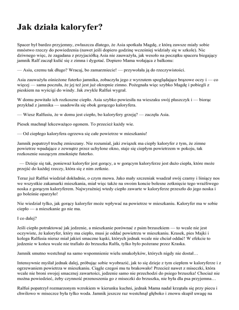 Jak działa kaloryfer? Spacer był bardzo przyjemny, zwłaszcza dlatego, że Asia spotkała Magdę, z którą zawsze miały sobie mnóstwo rzeczy do powiedzenia (nawet jeśli dopiero godzinę wcześniej widziały się w szkole). Nic dziwnego więc, że zagadana z przyjaciółką Asia nie zauważyła, jak wesoło na początku spaceru biegający jamnik Ralf zaczął kulić się z zimna i dygotać. Dopiero Mama wołająca z balkonu: — Asiu, czemu tak długo? Wracaj, bo zamarzniecie! — przywołała ją do rzeczywistości. Asia zauważyła ośnieżone futerko jamnika, zobaczyła jego z wyrzutem spoglądające brązowe oczy i — co więcej — sama poczuła, że jej też jest już okropnie zimno. Pożegnała więc szybko Magdę i pobiegli z pieskiem na wyścigi do windy. Jak zwykle Ralfuś wygrał. W domu powitało ich rozkoszne ciepło. Asia szybko powiesiła na wieszaku swój płaszczyk i — biorąc przykład z jamnika — usadowiła się obok gorącego kaloryfera. — Wiesz Ralfusiu, że w domu jest ciepło, bo kaloryfery grzeją? — zaczęła Asia. Piesek machnął lekceważąco ogonem. To przecież każdy wie. — Od ciepłego kaloryfera ogrzewa się całe powietrze w mieszkaniu! Jamnik popatrzył trochę zmieszany. Nie rozumiał, jaki związek ma ciepły kaloryfer z tym, że zimne powietrze wpadające z zewnątrz przez uchylone okno, staje się ciepłym powietrzem w pokoju, tak rozkosznie suszącym zmoknięte futerko. — Dzieje się tak, ponieważ kaloryfer jest gorący, a w gorącym kaloryferze jest dużo ciepła, które może przejść do każdej rzeczy, która się z nim zetknie. Teraz już Ralfuś wiedział dokładnie, o czym mowa. Jako mały szczeniak wsadzał swój czarny i lśniący nos we wszystkie zakamarki mieszkania, miał więc także na swoim koncie bolesne zetknięcie tego wrażliwego noska z gorącym kaloryferem. Najwyraźniej wtedy ciepło zawarte w kaloryferze przeszło do jego noska i go boleśnie oparzyło! Nie wiedział tylko, jak gorący kaloryfer może wpływać na powietrze w mieszkaniu. Kaloryfer ma w sobie ciepło — a mieszkanie go nie ma. I co dalej? Jeśli ciepło potraktować jak jedzenie, a mieszkanie porównać z psim brzuszkiem — to wcale nie jest oczywiste, że kaloryfer, który ma ciepło, musi je oddać powietrzu w mieszkaniu. Krasek, pies Majki i kolega Ralfusia nieraz miał jakieś smaczne kąski, których jednak wcale nie chciał oddać! W efekcie to jedzenie w końcu wcale nie trafiało do brzuszka Ralfa, tylko było pożerane przez Kraska. Jamnik smutno westchnął na samo wspomnienie wielu smakołyków, których nigdy nie dostał… Intensywnie myślał jednak dalej, próbując sobie wyobrazić, jak to się dzieje z tym ciepłem w kaloryferze i z ogrzewaniem powietrza w mieszkaniu. Ciągle czegoś mu tu brakowało! Przecież nawet z miseczki, która wcale nie broni swojej smacznej zawartości, jedzenie samo nie przechodzi do psiego brzuszka! Chociaż nie można powiedzieć, żeby czynność przenoszenia go z miseczki do brzuszka, nie była dla psa przyjemna… Ralfuś popatrzył rozmarzonym wzrokiem w kierunku kuchni, jednak Mama nadal krzątała się przy piecu i chwilowo w miseczce była tylko woda. Jamnik jeszcze raz westchnął głęboko i znowu skupił uwagę na Ralfuś popatrzył rozmarzonym wzrokiem w kierunku kuchni, jednak Mama nadal krzątała się przy piecu i chwilowo w miseczce była tylko woda. Jamnik jeszcze raz westchnął głęboko i znowu skupił uwagę na tym, co mówiła Asia. — Z ciepłem jest trochę inaczej niż z jedzeniem — powiedziała Asia, domyśliwszy się z miny Ralfusia, że ma on — jak zwykle — ochotę na „małe co nieco". — Ciepło samo przechodzi od przedmiotu, który ma wysoką temperaturę, do takiego przedmiotu, który ma temperaturę niską. Ralfuś wiedział, że temperatura to coś takiego, co pokazuje termometr. Jak temperatura jest wysoka, to przedmiot jest gorący i trudno go zjeść. Ileż to razy musiał niecierpliwie czekać na swój świeżo ugotowany obiad, bo Mama twierdziła, że ma on za wysoką temperaturę i musi wystygnąć. A jak temperatura jest niska, to przedmiot jest zimny — na przykład wyjęte z lodówki lody. Oblizał się więc tylko i słuchał dalej. — Ciepło przepływa od przedmiotu do przedmiotu jak woda z góry na dół. Wysoka temperatura kaloryfera — to wysoko podniesiony garnuszek, z którego wylewa się wodę. Niska temperatura mieszkania — to nisko położona wanna, do której wlewa się wodę. Rozumiesz Ralfuniu? Skojarzenie z wanną nie podobało się pieskowi. Wanna oznaczała niemiłe chwile, kiedy po wspaniałym tarzaniu się w śmieciach na podwórku Ralfuś lądował pod prysznicem i mama bez żadnej litości szorowała jego futerko. Skrzywił się więc z niesmakiem, słuchał jednak uważnie dalej. Może z tej opowiastki o cieple i kaloryferach wynikać będzie jakiś praktyczny wniosek? Może na przykład uda się wymyślić sposób na to, żeby woda płynęła w drugą stronę i zamiast moczyć psie futerko schowała się z powrotem do prysznica? Niestety, Asia szybko rozwiała jego marzenia. — Ciepło przechodzi tylko od obiektu cieplejszego do zimniejszego, tak jak woda płynie tylko z góry w dół. Piesek otrząsnął się z obrzydzeniem. Już on wiedział, co to znaczy, że „woda płynie tylko z góry w dół”! No i jak tu uwierzyć zapewnieniom, że wiedza może się przydać w praktyce?! Przecież ta woda z prysznica nadal będzie mu dokuczała i cała nowo zdobyta wiedza nie będzie mogła nic w tej sprawie dopomóc… Asia jednak mówiła dalej, więc Ralfuś nadstawił ucha. — Im wyższa temperatura kaloryfera, tym więcej ciepła może on oddać. To tak, jak z rzeką — jeśli spływa z wysoka, to płynie bardzo szybko i w krótkim czasie przenosi bardzo dużo wody. Jeśli natomiast różnica wysokości między źródłami rzeki a jeziorem, do którego ona wpływa, jest niewielka, to rzeka płynie wolno i przenosi