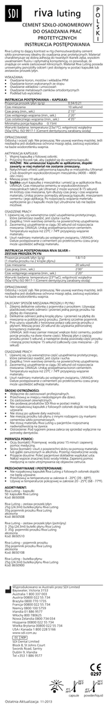 riva luting CEMENT SZKŁO-JONOMEROWY DO OSADZANIA PRAC PROTETYCZNYCH INSTRUKCJA POSTĘPOWANIA P O L S K I Riva Luting to dający kontrast w rtg chemoutwardzalny cement szkło-jonomerowy idealny do osadzania prac protetycznych. Materiał charakteryzuje się dobrą adhezją do twardych tkanek zęba, wysokim uwalnianiem fluoru i optymalną konsystencją, co powoduje, że znajduje on wiele zastosowań klinicznych. Materiał Riva Luting posiada uniwersalny jasnożółty odcień i jest dostępny w postaci kapsułek lub zestawów proszek/płyn. WSKAZANIA: • Osadzanie koron, mostów i wkładów PFM • Osadzanie koron wykonanych ze stopu • Osadzanie wkładów i umocowań • Osadzanie metalowych zamków ortodontycznych • Podkład lub wyścielacz INSTRUKCJA POSTĘPOWANIA – KAPSUŁKI: Proporcja proszek/płyn (g/g) 0.34/0.21 Czas mieszania 10 sekund Czas pracy (min., sek.) 2’15” Czas wstępnego wiązania (min., sek.) 2’20” Czas ostatecznego wiązania (min., sek.) 4’35” Minimalna porcja/kapsułka 0.15ml Warunki badania: temperatura (23±1ºC), wilgotność względna (50±10%). ISO 9917-1 (Cement dentystyczny zarabiany wodą) OPRACOWANIE: Odizoluj i oczyść ząb. Nie przesuszaj. Nie usuwaj warstwy mazistej. Jeśli niezbędna jest dodatkowa ochrona miazgi zęba, zastosuj wyścielacz na bazie wodorotlenku wapnia. AKTYWACJA KAPSUŁKI: 1. Wyjmij kapsułkę z foliowej osłonki. 2. Przyciśnij tłoczek tak, aby zagłębił się do wnętrza kapsułki. WAŻNE: Nie umieszczać kapsułki w aplikatorze, dopóki zawarty w niej materiał nie zostanie zmieszany. 3. Natychmiast umieść uaktywnioną kapsułkę w mieszalniku Ultramat 2 lub dowolnym wysokoobrotowym mieszalniku (4000 – 4800 obr./min). 4. Mieszaj przez 10 sekund. 5. Szybko usuń kapsułkę z mieszalnika i umieść ją w aplikatorze Riva. UWAGA: Czas mieszania cementu w wysokoobrotowych mieszalnikach takich jak Ultramat 2 może wynosić 8-15 sekund. Im krótszy czas mieszania, tym dłuższy czas pracy i czas wiązania materiału. Unikaj przerw pomiędzy aktywacją kapsułki, mieszaniem cementu i jego aplikacją. Po rozpoczęciu wiązania materiału wytłoczenie go z kapsułki może być utrudnione lub nie będzie możliwe. OSADZENIE PRACY: 1. Upewnij się, czy wewnętrzna część uzupełnienia protetycznego, które zamierzasz osadzić, jest czysta i sucha. 2. Zaaplikuj 1mm warstwę cementu na powierzchnię uzupełnienia. 3. Zacementuj uzupełnienie w ciągu 30 sekund od rozpoczęcia mieszania. UWAGA: Unikaj przepełniania koron cementem. Temperatura wyższa niż 23ºC / 74ºF przyspieszy wiązanie materiału. 4. Usuń nadmiary materiału po wstępnym związaniu. UWAGA: Dalsze postępowanie z cementem po przekroczeniu czasu pracy może upośledzić adhezję materiału. INSTRUKCJA POSTĘPOWANIA RIVA SILVER – ZESTAW PROSZEK/PŁYN: Proporcja proszek/płyn (g/g) 1.8/1.0 (1 miarka proszku na 2 krople płynu) Czas mieszania 20 sekund Czas pracy (min., sek.) 2’00” Czas wstępnego wiązania (min., sek.) 2’20” Warunki badania: temperatura (23º1±C), wilgotność względna (50±10%) ISO 9917-1 (Cement dentystyczny zarabiany wodą) OPRACOWANIE: Odizoluj i oczyść ząb. Nie przesuszaj. Nie usuwaj warstwy mazistej. Jeśli niezbędna jest dodatkowa ochrona miazgi zęba, zastosuj wyścielacz na bazie wodorotlenku wapnia. ZALECANY SPOSÓB MIESZANIA PROSZKU I PŁYNU 1. Zdejmij delikatnie osłonkę z pojemnika z proszkiem. Używając plastikowej miarki odmierz i przenieś jedną porcję proszku na płytkę do mieszania. 2. Delikatnie odmierz jedną kroplę płynu i przenieś na płytkę do mieszania w pobliże porcji proszku. Zamknij szczelnie pojemnik. 3. Przy użyciu szpatułki z tworzywa połącz całą porcję proszku z płynem. Mieszaj przez 20 sekund do uzyskania jednorodnej konsystencji materiału. UWAGA: Jeśli masz zamiar mieszać większe ilości cementu, podziel porcje proszku na dwie równe części. Mieszaj płyn z częścią proszku przez 5 sekund, a następnie dodaj pozostałą część proszku i mieszaj przez kolejne 15 sekund (całkowity czas mieszania – 20 sekud) OSADZANIE PRACY: 1. Upewnij się, czy wewnętrzna część uzupełnienia protetycznego, które zamierzasz osadzić, jest czysta i sucha. 2. Zaaplikuj 1mm warstwę cementu na powierzchnię uzupełnienia. 3. Zacementuj uzupełnienie w ciągu 30 sekund od rozpoczęcia mieszania. UWAGA: Unikaj przepełniania koron cementem. Temperatura wyższa niż 23ºC / 74ºF przyspieszy wiązanie materiału. 4. Usuń nadmiary materiału po wstępnym związaniu. UWAGA: Dalsze postępowanie z cementem po przekroczeniu czasu pracy może upośledzić adhezję materiału. ŚRODKI OSTROŻNOŚCI: • Wyłącznie do zastosowań profesjonalnych. • Przechowuj w miejscu niedostępnym dla dzieci. • Do zastosowań zewnętrznych. • Nie podawaj produktów SDI Riva w postaci iniekcji • Nie rozpakowuj kapsułek z foliowych osłonek dopóki nie będą używane. • Nie stosuj po upływie daty ważności. • Nie mieszaj proszku lub płynu z innymi rodzajami czy markami cementów szkło-jonomerowych. • Nie stosuj materiału Riva Luting u pacjentów rozpoznaną nadwrażliwością na żywice. • Ostrzeżenie: Pod rygorem prawa zaleca się sprzedaż wyłącznie na potrzeby dentystów. PIERWSZA POMOC: • Oczy (kontakt): Przemywaj wodą przez 15 minut i zapewnij pomoc medyczną. • Skóra (kontakt): Usuń z powierzchni skóry za pomocą materiału lub gąbki zanurzonych w alkoholu. Przemyj niezwłocznie wodą. • Przyjęcie doustne: Poleć pacjentowi dokładnie wypłukać usta. Nakaż wypicie znacznej ilości wody/mleka. Zapewnij pomoc medyczną w razie utrzymywania się objawów zatrucia. PRZECHOWYWANIE I POSTĘPOWANIE: • Nie rozpakowuj kapsułek Riva Luting z foliowych osłonek dopóki nie będą używane. • Przechowuj w temperaturze w zakresie 4 - 20ºC (39 - 68ºF). • Używaj w temperaturze pokojowej w zakresie 20 - 25ºC (68 - 77ºF). ASORTYMENT: Riva Luting – kapsułki 5