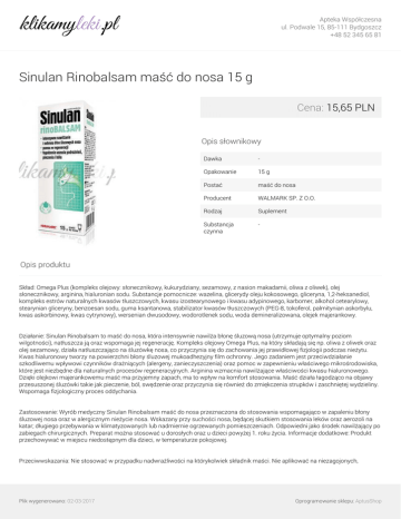 Apteka Współczesna ul. Podwale 15, 85-111 Bydgoszcz +48 52 345 65 81 Sinulan Rinobalsam maść do nosa 15 g Cena: 15,65 PLN Opis słownikowy Dawka - Opakowanie 15 g Postać maść do nosa Producent WALMARK SP. Z O.O. Rodzaj Suplement Substancja czynna - Opis produktu Skład: Omega Plus (kompleks olejowy: słonecznikowy, kukurydziany, sezamowy, z nasion makadamii, oliwa z oliwek), olej słonecznikowy, arginina, hialuronian sodu. Substancje pomocnicze: wazelina, glicerydy oleju kokosowego, gliceryna, 1,2-heksanediol, kompleks estrów naturalnych kwasów tłuszczowych, kwasu izostearynowego i kwasu adypinowego, karbomer, alkohol cetearylowy, stearynian gliceryny, benzoesan sodu, guma ksantanowa, stabilizator kwasów tłuszczowych (PEG-8, tokoferol, palmitynian askorbylu, kwas askorbinowy, kwas cytrynowy), wersenian dwusodowy, wodorotlenek sodu, woda demineralizowana, olejek majerankowy. Działanie: Sinulan Rinobalsam to maść do nosa, która intensywnie nawilża błonę śluzową nosa (utrzymuje optymalny poziom wilgotności), natłuszcza ją oraz wspomaga jej regenerację. Kompleks olejowy Omega Plus, na który składają się np. oliwa z oliwek oraz olej sezamowy, działa natłuszczająco na śluzówkę nosa, co przyczynia się do zachowania jej prawidłowej fizjologii podczas nieżytu. Kwas hialuronowy tworzy na powierzchni błony śluzowej mukoadhezyjny film ochronny. Jego zadaniem jest przeciwdziałanie szkodliwemu wpływowi czynników drażniących (alergeny, zanieczyszczenia) oraz pomoc w zapewnieniu właściwego mikrośrodowiska, które jest niezbędne dla naturalnych procesów regeneracyjnych. Arginina wzmacnia nawilżające właściwości kwasu hialuronowego. Dzięki olejkowi majerankowemu maść ma przyjemny zapach, ma to wpływ na komfort stosowania. Maść działa łagodząco na objawy przesuszonej śluzówki takie jak pieczenie, ból, swędzenie oraz przyczynia się również do zmiękczenia strupków i zaschniętej wydzieliny. Wspomaga fizjologiczny proces oddychania. Zastosowanie: Wyrób medyczny Sinulan Rinobalsam maść do nosa przeznaczona do stosowania wspomagająco w zapaleniu błony śluzowej nosa oraz w alergicznym nieżycie nosa. Wskazany przy suchości nosa, będącej skutkiem stosowania leków oraz aerozoli na katar; długiego przebywania w klimatyzowanych lub nadmiernie ogrzewanych pomieszczeniach. Odpowiedni jako środek nawilżający po zabiegach chirurgicznych. Preparat można stosować u dorosłych oraz u dzieci powyżej 1. roku życia. Informacje dodatkowe: Produkt przechowywać w miejscu niedostępnym dla dzieci, w temperaturze pokojowej. Przeciwwskazania: Nie stosować w przypadku nadwrażliwości na którykolwiek składnik maści. Nie aplikować na niezagojonych, Plik wygenerowano: 02-03-2017 Oprogramowanie sklepu: AptusShop Apteka Współczesna ul. Podwale 15, 85-111 Bydgoszcz +48 52 345 65 81 otwartych ranach. Sposób użycia: Stosować donosowo. Aplikować maść w niewielkiej ilości. Równomiernie nanosić na błony śluzowe nosa, a następnie rozprowadzić, delikatnie masując od zewnętrznej strony. Można stosować nawet kilka razy dziennie. Plik wygenerowano: 02-03-2017 Powered by TCPDF (www.tcpdf.org) Oprogramowanie sklepu: AptusShop