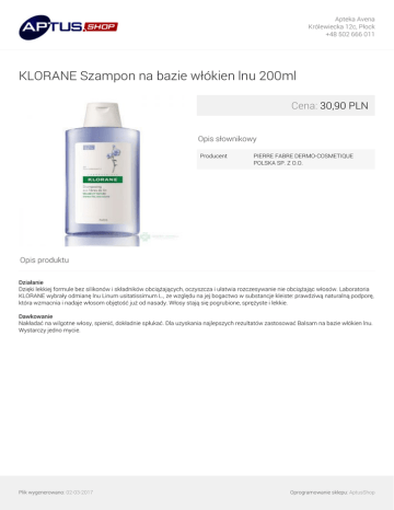 Apteka Avena Królewiecka 12c, Płock +48 502 666 011 KLORANE Szampon na bazie włókien lnu 200ml Cena: 30,90 PLN Opis słownikowy Producent PIERRE FABRE DERMO-COSMETIQUE POLSKA SP. Z O.O. Opis produktu Działanie Dzięki lekkiej formule bez silikonów i składników obciążających, oczyszcza i ułatwia rozczesywanie nie obciążając włosów. Laboratoria KLORANE wybrały odmianę lnu Linum usitatissimum L., ze względu na jej bogactwo w substancje kleiste: prawdziwą naturalną podporę, która wzmacnia i nadaje włosom objętość już od nasady. Włosy stają się pogrubione, sprężyste i lekkie. Dawkowanie Nakładać na wilgotne włosy, spienić, dokładnie spłukać. Dla uzyskania najlepszych rezultatów zastosować Balsam na bazie włókien lnu. Wystarczy jedno mycie. Plik wygenerowano: 02-03-2017 Powered by TCPDF (www.tcpdf.org) Oprogramowanie sklepu: AptusShop
