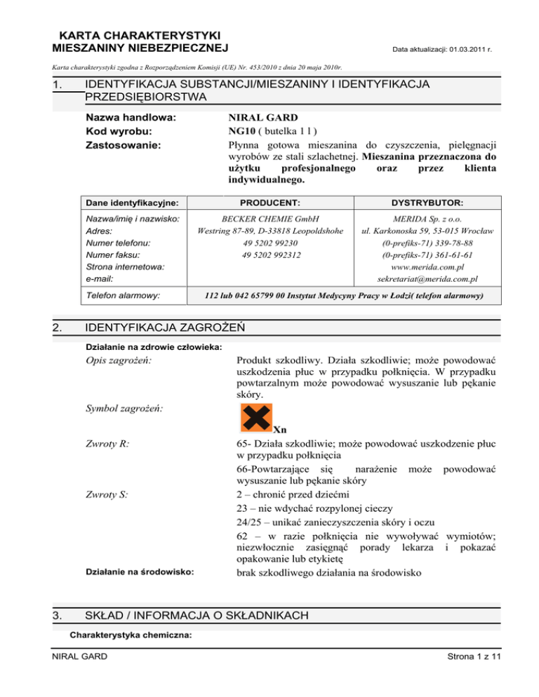 KARTA CHARAKTERYSTYKI MIESZANINY NIEBEZPIECZNEJ Data aktualizacji: 01.03.2011 r. Karta charakterystyki zgodna z Rozporządzeniem Komisji (UE) Nr. 453/2010 z dnia 20 maja 2010r. 1. IDENTYFIKACJA SUBSTANCJI/MIESZANINY I IDENTYFIKACJA PRZEDSIĘBIORSTWA Nazwa handlowa: Kod wyrobu: Zastosowanie: Dane identyfikacyjne: PRODUCENT: DYSTRYBUTOR: Nazwa/imię i nazwisko: Adres: Numer telefonu: Numer faksu: Strona internetowa: e-mail: BECKER CHEMIE GmbH Westring 87-89, D-33818 Leopoldshohe 49 5202 99230 49 5202 992312 MERIDA Sp. z o.o. ul. Karkonoska 59, 53-015 Wrocław (0-prefiks-71) 339-78-88 (0-prefiks-71) 361-61-61 www.merida.com.pl [email protected] Telefon alarmowy: 2. NIRAL GARD NG10 ( butelka 1 l ) Płynna gotowa mieszanina do czyszczenia, pielęgnacji wyrobów ze stali szlachetnej. Mieszanina przeznaczona do użytku profesjonalnego oraz przez klienta indywidualnego. 112 lub 042 65799 00 Instytut Medycyny Pracy w Łodzi( telefon alarmowy) IDENTYFIKACJA ZAGROŻEŃ Działanie na zdrowie człowieka: Opis zagrożeń: Produkt szkodliwy. Działa szkodliwie; może powodować uszkodzenia płuc w przypadku połknięcia. W przypadku powtarzalnym może powodować wysuszanie lub pękanie skóry. Symbol zagrożeń: Zwroty R: Zwroty S: Działanie na środowisko: 3. Xn 65- Działa szkodliwie; może powodować uszkodzenie płuc w przypadku połknięcia 66-Powtarzające się narażenie może powodować wysuszanie lub pękanie skóry 2 – chronić przed dziećmi 23 – nie wdychać rozpylonej cieczy 24/25 – unikać zanieczyszczenia skóry i oczu 62 – w razie połknięcia nie wywoływać wymiotów; niezwłocznie zasięgnąć porady lekarza i pokazać opakowanie lub etykietę brak szkodliwego działania na środowisko SKŁAD / INFORMACJA O SKŁADNIKACH Charakterystyka chemiczna: NIRAL GARD Strona 1 z 11 KARTA CHARAKTERYSTYKI MIESZANINY NIEBEZPIECZNEJ 3. Data aktualizacji: 01.03.2011 r. SKŁAD / INFORMACJA O SKŁADNIKACH Deklaracja składników zgodnie z Rozporządzeniem w sprawie detergentów 648/2004/WE Składniki niebezpieczne zawarte w produkcie: Nazwa niebezpiecznej substancji i zakres stężeń Benzyna(ropa naftowa) alkilat ciężki Niskowrząca modyfikowana frakcja benzynowa > 30% : 4. Numer CAS Numer WE Symbole niebezpieczeństwa 64741-65-7 265-067-2 Xn, R65, R66 Klasyfikacja po uwzględnieniu Noty H i P. Produkt zawiera < 0,1% wagowy benzenu PIERWSZA POMOC Wskazówki ogólne: W przypadku wystąpienia niepokojących objawów należy wezwać lekarza i jeśli to możliwe pokazać opakowanie lub etykietę. Natychmiast zdjąć zanieczyszczone produktem .. Nie wywoływać wymiotów Wdychanie: Zadbać o dopływ świeżego powietrza. W przypadku utrzymujących się dolegliwości niezwłocznie skontaktować się z lekarzem. Skóra: Zdjąć zanieczyszczoną odzież i buty. Zanieczyszczoną skórę zmyć natychmiast dużą ilością wody. W przypadku wystąpienia podrażnienia skonsultować się z lekarzem. Oczy: Upewnić się, czy poszkodowany nie nosi szkieł kontaktowych, wyjąć szkła kontaktowe. Przez kilka minut płukać oczy pod bieżącą wodą ( 5 minut), przytrzymując odchylone powieki. Nałożyć jałowy opatrunek i zasięgnąć porady lekarza okulisty. Połknięcie: Nie powodować wymiotów. Nie podawać poszkodowanemu nic do picia i do jedzenia. Skonsultować się z lekarzem. Wskazówki dla lekarza: Należy niezwłocznie okazać etykietę produktu lekarzowi. Leczyć objawowo. 5. POSTĘPOWANIE W PRZYPADKU POŻARU Zalecane środki gaśnicze: Stosować rozpyloną wodę, piana gaśnicza odporna na alkohole, proszek gaśniczy. Nieodpowiednie środki gaśnicze: Zwarty strumień wody – ryzyko rozprzestrzenienia pożaru. Szczególne zagrożenie ze strony produktów spalania i wydzielających się gazów: W czasie pożaru może dojść do uwolnienia tlenku węgla (CO) Specjalne wyposażenie ochronne strażaków: Stosować środki ochrony ogólnej typowe w warunkach pożaru. Nie należy przebywać w zagrożonej ogniem strefie bez aparatu do oddychania z niezależnym obiegiem powietrza. Inne uwagi: Zagrożone ogniem pojemniki chłodzić z bezpiecznej odległości rozproszonym strumieniem NIRAL GARD Strona 2 z 11 KARTA CHARAKTERYSTYKI MIESZANINY NIEBEZPIECZNEJ 5. Data aktualizacji: 01.03.2011 r. POSTĘPOWANIE W PRZYPADKU POŻARU wody. Zebraną wodę gaśniczą traktować jako odpad i usuwać zgodnie z obowiązującymi przepisami. 6. POSTĘPOWANIE W PRZYPADKU NIEZAMIERZONEGO UWOLNIENIA DO ŚRODOWISKA Indywidualne środki ostrożności: W celu zapobiegania kontaktu ze skórą lub oczami, w obszarze strefy zagrożenia zakładać odpowiednie środki ochrony indywidualnej – patrz punkt 8. Nie dopuszczać osób postronnych i nieupoważnionych. Do prac związanych z likwidacją skutków awarii skierować osoby przeszkolone i wyposażone w odpowiednie środki ochrony oczu, dróg oddechowych i skóry. Środki ostrożności w zakresie ochrony środowiska: Powstrzymać wyciek. Nie dopuszczać do przedostawania się produktu do kanalizacji, wód powierzchniowych i wód gruntowych. W przypadku uwolnienia dużych ilości produktu lub skażenia środowiska powiadomić odpowiednie władze i służby ratownictwa chemicznego. Metody oczyszczania/usuwania: Mniejsze ilości uwolnionego produktu – wytrzeć np. papierowym ręcznikiem lub spłukać wodą. Większe ilości uwolnionego produktu – przesypać materiałem pochłaniającym ciecze (piasek, ziemia okrzemkowa, uniwersalne środki wiążące, trociny) i zebrać do oznakowanego, szczelnie zamykanego pojemnika na odpady. Usuwać zgodnie z zaleceniami przedstawionymi w punkcie 13. 7. POSTĘPOWANIE Z SUBSTANCJAMI I MIESZANINĄ I ICH MAGAZYNOWANIE Postępowanie z preparatem: Unikać kontaktu Magazynowanie: Przechowywać w oryginalnych, szczelnie zamkniętych pojemnikach, w chłodnym i suchym pomieszczeniu, w miejscu niedostępnym dla dzieci. Nie przechowywać razem z żywnością, paszą i napojami. Specyficzne zastosowania: Środek do czyszczenia, pielęgnacji i konser