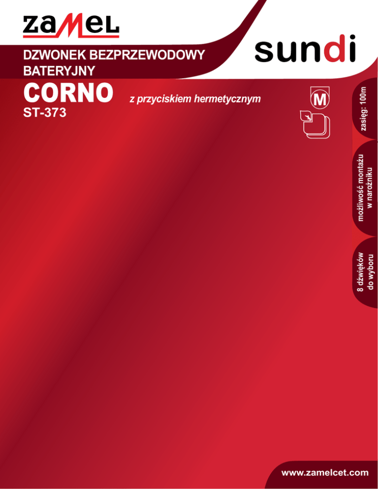 możliwość montażu w narożniku ST-373 z przyciskiem hermetycznym 8 dźwięków do wyboru CORNO zasięg: 100m DZWONEK BEZPRZEWODOWY BATERYJNY www.zamelcet.com karta gwarancyjna producent udziela 24 miesięcznej gwarancji pieczęć i podpis sprzedawcy, data sprzedaży 1. ZAMEL Sp. z o.o. udziela 24 - miesięcznej gwarancji na sprzedawane towary. 2. Gwarancją ZAMEL Sp. z o.o. nie są objęte: a)mechaniczne uszkodzenia powstałe w transporcie, załadunku / rozładunku lub innych okolicznościach, b)uszkodzenia powstałe na skutek wadliwie wykonanego montażu lub eksploatacji wyrobów ZAMEL Sp. z o.o., c)uszkodzenia powstałe na skutek jakichkolwiek przeróbek dokonanych przez KUPUJĄCEGO lub osoby trzecie a odnoszących się do wyrobów będących przedmiotem sprzedaży lub urządzeń niezbędnych do prawidłowego funkcjonowania wyrobów będących przedmiotem sprzedaży, d)uszkodzenia wynikające z działania siły wyższej lub innych zdarzeń losowych, za które ZAMEL Sp. z o.o. nie ponosi odpowiedzialności e)źródła zasilania (baterie), będące na wyposażeniu urządzenia w momencie jego sprzedaży (jeśli występują). 3. Wszelkie roszczenia z tytułu gwarancji KUPUJĄCY zgłosi w punkcie zakupu lub firmie ZAMEL Sp. z o.o. na piśmie po ich stwierdzeniu. 4. ZAMEL Sp. z o.o. zobowiązuje się do rozpatrywania reklamacji zgodnie z obowiązującymi przepisami prawa polskiego. 5. Wybór formy załatwienia reklamacji, np. wymiana towaru na wolny od wad, naprawa lub zwrot pieniędzy należy do ZAMEL Sp. z o.o. 6. Terytorialny zasięg obowiązywania gwarancji: Rzeczpospolita Polska. 7. Gwarancja nie wyłącza, nie ogranicza, ani nie zawiesza uprawnień KUPUJĄCEGO wynikających z niezgodności towaru z umową. ZAMEL Sp. z o.o. 43-200 Pszczyna, ul. Zielona 27, tel.: (32) 210 46 65; fax: (32) 210 80 04 e-mail: [email protected], www.zamelcet.com CORNO • • • • • • • • • • • • Produkt energooszczędny Urządzenia firmy ZAMEL cechowane tym znakiem współpracują ze sobą. • • • ST-373 DZWONEK BEZPRZEWODOWY BATERYJNY idealny jako dzwonek do drzwi, wewnętrzne urządzenie przywoławcze lub alarm osobisty, przydatny w domu, firmie lub osobom wymagającym opieki, nie wymaga instalacji dzwonkowej, dzwonek i przycisk zasilany bateryjnie, przycisk z wizytówką, możliwość montażu na ścianie (tradycyjnie), w narożniku lub zastosowanie jako dzwonek przenośny, transmisja radiowa (częstotliwość 433,92MHz), zasięg działania*: 100m w terenie otwartym, w razie potrzeby możliwość zastosowania retransmitera (RT-228) w celu zwiększenia zasięgu działania dzwonka, możliwość przypisania dwóch przycisków do jednego dzwonka, możliwość przypisania dowolnej ilości dzwonków do jednego przycisku, możliwość współpracy z przyciskiem ST-300P i ST-400P, przycisk przystosowany do pracy w zmiennych warunkach atmosferycznych, np. przy furtce (IP44), osiem dźwięków do wyboru (Westminster, Ding Dong, dzwony rurowe, trąbka, szczekanie psa oraz popularne melodie ) – możliwość rozpoznania miejsca przywołania, komplet nie zawiera baterii zasilających do dzwonka, poziom dźwięku max. 75 dB. Instrukcja montażu wewnątrz opakowania. zasilanie dzwonka: 2 x bateria 1,5V (typ R6, „AA”); IP 20 zasilanie przycisku: 1 x bateria 3V (typ CR2032); IP44 zasięg: 100m ST-373-001 0681 PN-EN 301 489-1 Masa netto wyrobu: 0,180 kg Kraj pochodzenia: PRC Producent: SCI LTD Symbol oznaczający selektywne zbieranie sprzętu elektrycznego i elektronicznego. Zakaz umieszczania zużytego sprzętu z innymi odpadami. Deklaracja zgodności znajduje się na stronie internetowej www.zamelcet.com Dane techniczne Odbiornik – dzwonek bateryjny CORNO ● zasilanie: 2 x bateria 1,5V (typ R6, „AA”) ● pobór prądu: - czuwanie 0,15mA, - dźwięk 100mA ● częstotliwość: 433,92MHz ● dźwięk: 8 dźwięków do wyboru ● poziom dźwięku: max 75dB ● klasa ochronności: III ● stopień ochrony: IP 20 ● temperaturowy zakres pracy: od 0ºC do +35ºC ● wymiary [mm]: 190 x 140 x 58 Nadajnik – przycisk dzwonkowy typ ST-300P ● zasilanie: 1 x bateria typ 3V CR 2032 ● transmisja: radiowa ● częstotliwość: 433,92MHz ● kodowanie: 256 kodów ● zasięg działania*: 100m w terenie otwartym ● klasa ochronności: III ● stopień ochrony: IP 44 ● temperaturowy zakres pracy: od -20ºC do +35ºC ● wymiary [mm]: 85 x 26 x 32 *Podany zasięg działania dotyczy przestrzeni otwartej czyli waruków idealnych bez przeszkód. Jeżeli pomiędzy odbiornikiem a nadajnikiem znajdują się przeszkody, należy przewidzieć zmniejszenie zasięgu działania odpowiednio dla: drewna i gipsu od 5 do 20%, cegły od 20 do 40%, betonu zbrojongo od 40 do 80%. Przy przeszkodach metalowych, stosowanie systemów radiowych nie jest zalecane z uwagi na znaczne ograniczenie zasięgu działania. Negatywny wpływ na zasięg działania mają też napowietrzne i podziemne linie energetyczne dużej mocy oraz nadajniki sieci GSM umieszczone w bliskiej odległości urządzeń. instrukcja Produkt energooszczędny Urządzenia firmy ZAMEL cechowane tym znakiem współpracują ze sobą. 1. Opis ogólny. Dzwonek ten może być wykorzystywany jako: dzwonek do drzwi, wewnętrzne urządzenie przywoławcze lub alarm osobisty. Nie wymaga instalacji dzwonkowej. Dzwonek i przycisk dzwonkowy są zasilane bateryjnie. Dzonek można zamontować tradycyjnie na ścianie, w narożniku lub stosować jako dzwonek przenośny. W nadawaniu i odbieraniu sygnału wykorzystywana jest częstotliwość 433,92MHz. Dzwonek posiada stosunkowo duży zasięg działania, gdyż w terenie otwartym dochodzi on do 100m. Jeden dzwonek może współpracować z dwoma przyciskami, natomiast jeden przycisk może współpracować z nieograniczoną ilością dzwonków. Dzwonek może współpracować z przyciskami ST-300P i ST400P. Użytkownik ma do wyboru osiem różnych dźwięków i melodii, dzięki czemu przy zastosowaniu dwóch pilotów do j