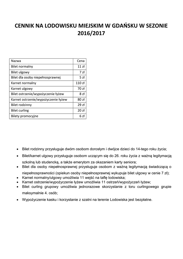 CENNIK NA LODOWISKU MIEJSKIM W GDAŃSKU W SEZONIE
