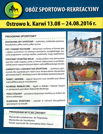 OBÓZ SPORTOWO-REKREACYJNY Ostrowo k. Karwi 13.08 – 24.08.2016 r. PROGRAM SPORTOWY • ZESPOŁOWE GRY SPORTOWE – siatkówka, siatkówka plażowa, koszykówka, piłka nożna, piłka ręczna • GRY I ZABAWY RUCHOWE – aktywność ruchowa w formie gier i zabaw ruchowych na świeżym powietrzu uwzględniając warunki pogodowe: wyścigi rzędów, podchody, ringo, badminton • PODSTAWY SPORTÓW WALKI – nauka padów oraz elementów sportów walki (zapasy, judo) w formie zabawowej na profesjonalnej macie zapaśniczej pod okiem wykwalifikowanego trenera • GIMNASTYKA I AKROBATYKA SPORTOWA – podstawy gimnastyki dla najmłodszych dzieci oraz doskonalenie elementów gimnastycznych i akrobatycznych dla bardziej zaawansowanych • TANIEC I AEROBIK – zajęcia taneczne oraz aerobik pod okiem wykwalifikowanych instruktorów • PŁYWANIE REKREACYJNE – kąpiel w Bałtyku i basenie krytym w pensjonacie pod okiem Ratownika Wodnego • TENIS STOŁOWY – pensjonat dysponuje świetlicą ze stołem do tenisa stołowego • OLIMPIADA SPORTOWA – zawody w różnych dyscyplinach sportowych na wesoło PROGRAM WYCIECZKOWY • Wycieczka autokarowa do Trójmiasta • Wycieczka do Szymbarku • Piesze wycieczki do Jastrzębiej Góry i Karwi ZAKWATEROWANIE Pensjonat Asia (www.asia.afr.pl) Atrakcyjnie położony w odległości ok. 1 km od morza. Pokoje 3 i 4 osobowe z łazienkami. Obiekt jest ogrodzony i monitorowany, posiada basen kryty, który jest dostępny przez cały dzień dla uczestników obozu, w bliskiej odległości znajduje się las i polana, na której można organizować gry i zabawy ruchowe PROGRAM KULTURALNY zne Ognisko, dyskoteki w specjalnej sali, zajęcia rozwijające zdolności artystyc , warcaby i szachy w turnieje ), origami szkle, na nie dzieci (plastyczne, malowa okolicy o wiedzy y konkurs rzeźb z piasku, konkurs TRANSPORT Autokar, WC, klimatyzacja, DVD WYŻYWIENIE Trzy posiłki dziennie + podwieczorek KADRA WYCHOWAWCZO SZKOLENIOWA Wychowawcy to nauczyciele, pracujący na co dzień z dziećmi i młodzieżą w SP 342 w Warszawie oraz innych szkołach Białołęki (nauczyciele wychowania fizycznego, wychowawcy świetlicy, nauczyciele edukacji wczesnoszkolnej) CENA: 1450 zł – 11 dni, rodzeństwo 2700 zł niem, ubezpieczenie, Podana cena zawiera następujące świadczenia: pobyt wraz z wyżywie i wychowawczą, trenerską opiekę m, autokare t transpor , wyjazdu dniu w śniadanie i suchy prowiant o programu podaneg realizację bilety wstępu, przewodnika oraz transport w ramach wycieczek, zabawy. dobrej dużo i ę atmosfer sportowego i innych atrakcji, nagrody, fajną część kwoty proszę Termin wpłacania zaliczek w kwocie 300 zł to 30 kwietnia 2016 r. Pozostałą niżej konto: podane na m przelewe dokonać można Wpłaty r. 2016 czerwca wpłacać do 24 UKS Talent Białołęka PKO BP 23 1020 1042 0000 8502 0219 6004 Kontakt: Radosław Radtke, tel. 601626137, [email protected] ILOŚĆ MIEJSC OGRANICZONA!!! Wejdź koniecznie na stronę www.zapasybialoleka.pl i zobacz w zakładce galeria jak się bawiliśmy na obozie w latach poprzednich!