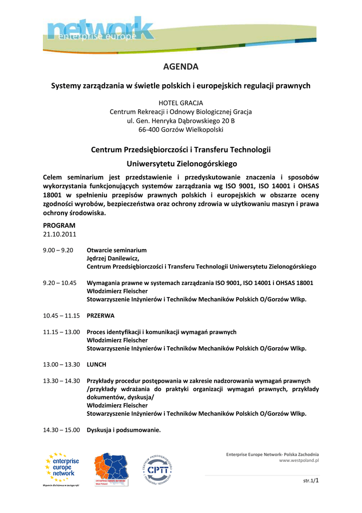 AGENDA Systemy zarządzania w świetle polskich i europejskich regulacji prawnych HOTEL GRACJA Centrum Rekreacji i Odnowy Biologicznej Gracja ul. Gen. Henryka Dąbrowskiego 20 B 66-400 Gorzów Wielkopolski Centrum Przedsiębiorczości i Transferu Technologii Uniwersytetu Zielonogórskiego Celem seminarium jest przedstawienie i przedyskutowanie znaczenia i sposobów wykorzystania funkcjonujących systemów zarządzania wg ISO 9001, ISO 14001 i OHSAS 18001 w spełnieniu przepisów prawnych polskich i europejskich w obszarze oceny zgodności wyrobów, bezpieczeństwa oraz ochrony zdrowia w użytkowaniu maszyn i prawa ochrony środowiska. PROGRAM 21.10.2011 9.00 – 9.20 Otwarcie seminarium Jędrzej Danilewicz, Centrum Przedsiębiorczości i Transferu Technologii Uniwersytetu Zielonogórskiego 9.20 – 10.45 Wymagania prawne w systemach zarządzania ISO 9001, ISO 14001 i OHSAS 18001 Włodzimierz Fleischer Stowarzyszenie Inżynierów i Techników Mechaników Polskich O/Gorzów Wlkp. 10.45 – 11.15 PRZERWA 11.15 – 13.00 Proces identyfikacji i komunikacji wymagań prawnych Włodzimierz Fleischer Stowarzyszenie Inżynierów i Techników Mechaników Polskich O/Gorzów Wlkp. 13.00 – 13.30 LUNCH 13.30 – 14.30 Przykłady procedur postępowania w zakresie nadzorowania wymagań prawnych /przykłady wdrażania do praktyki organizacji wymagań prawnych, przykłady dokumentów, dyskusja/ Włodzimierz Fleischer Stowarzyszenie Inżynierów i Techników Mechaników Polskich O/Gorzów Wlkp. 14.30 – 15.00 Dyskusja i podsumowanie. Enterprise Europe Network- Polska Zachodnia www.westpoland.pl str.1/1