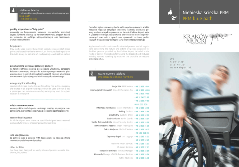niebieska ścieżka Niebieska ścieżka PRM PRM blue path - infrastruktura dedykowana osobom niepełnosprawnym blue path - dedicated facilities punkty przywoławcze "help point" pozwalają na bezpośrednie wezwanie pracowników specjalnej asysty; punkty te znajdują się na terenie terminalu, drogach dojścia do terminalu, na parkingu wielopoziomowym oraz terenowym, a także na stacji kolejki help points they can be used to directly summon special assistance staff; these points are located inside the terminal, on the routes leading to it, on the multi-storey car park and off-road parking, as well as train station Formularz zgłoszeniowy asysty dla osób niepełnosprawnych, a także wszystkie regulacje dotyczące charakteru i zakresu udzielania pomocy osobom niepełnosprawnym na terenie Kraków Airport ujęte w „Kodeksie dobrego postępowania przy obsłudze osób niepełnosprawnych oraz osób o ograniczonej sprawności ruchowej podróżujących drogą lotniczą” dostępne są na stronie krakowairport.pl. Application form for assistance for disabled persons and all regulations concerning the nature and extent of special assistance for disabled persons provided by the Kraków Airport, included in the "Code of Correct Proceedings for Serving the Disabled and Reduced Mobility Persons Travelling by Airplane" are available on website krakowairport.pl. GPS N: 50° 4' 21" E: 19° 48' 21" krakowairport.pl automatyczne wezwanie pierwszej pomocy na terenie lotniska znajdują się specjalne urządzenia, oznaczone kolorem czerwonym, służące do automatycznego wezwania pierwszej pomocy w nagłych przypadkach przez 24h na dobę; umożliwiają one wezwanie dyżurującego na lotnisku zespołu ratowniczego ważne numery telefony important telephone numbers emergency first aid calling specialized devices, marked in red, for calling first aid in emergency are located in all airport buildings and can be used 24 hours a day; a passenger can summon an on-duty emergency team to a given location at the airport Sekcja PRM PRM Section + 48 12 639 30 64 Informacja Lotniskowa 24h Airport Information 24h + 48 12 295 58 00 + 48 12 639 39 89 + 48 12 341 39 89 + 48 12 363 39 89 miejsca zarezerwowane we wszystkich strefach portu lotniczego znajdują się miejsca zarezerwowane, zaprojektowane z myślą o osobach niepełnosprawnych 0 801 055 000 Informacja Turystyczna Tourist Information + 48 12 285 53 41 Parking Car Park + 48 12 639 34 56 Urząd Celny Customs Office + 48 12 639 32 36 reserved waiting areas in all the airport areas there are specially-designed seats reserved exclusively for the use of passengers with disabilities Straż Graniczna Border Guards + 48 12 639 32 37 Służba Ochrony Lotniska Airport Security Service + 48 12 639 33 28 Lotniskowa Straż Pożarna Airport Fire Brigade + 48 12 639 31 01 Sekcja Medyczna Medical Section + 48 12 639 30 15 do potrzeb osób o statusie PRM dostosowane są również: strona internetowa, telefony, windy, toalety + 48 600 001 151 Zagubiony Bagaż Lost Luggage + 48 12 285 51 21 + 48 12 639 32 48 Welcome Airport Services + 48 12 285 51 15 other facilities that have been designed for use by disabled persons: website, telephones, lifts, toilets LS Airport Services + 48 12 639 37 37 Kierownik Terminalu Terminal Manager + 48 12 639 33 09 Kierownik/Manager of VIP & Business Services + 48 12 639 33 54 Public Relations + 48 12 639 34 43 fot. shutterstock.com inne udogodnienia Osoby z ograniczoną możliwością poruszania się (PRM), których możliwość poruszania się jest ograniczona w wyniku niepełnosprawności fizycznej, intelektualnej, wieku, schorzenia lub innej przyczyny, mają prawo do specjalnej asysty na terenie lotniska oraz w czasie odbywania podróży lotniczej. Porty i linie lotnicze zobligowane są do udzielenia osobom niepełnosprawnym bezpłatnej pomocy oraz zapewnienia im odpowiedniej opieki i szeregu udogodnień. Obsługę osób niepełnosprawnych w imieniu Kraków Airport prowadzi agent handlingowy Welcome Airport Services. Na terenie lotniska funkcjonuje specjalna „niebieska ścieżka” – infrastruktura dostosowana do potrzeb osób niepełnosprawnych. Persons with reduced mobility (PRM), whose mobility is reduced due to mental or physical disability, health condition, age, or another factor, have the right to special assistance in the airport area and during their journey. The airport and airlines are obligated to give free aid to disabled persons, and to provide them with proper care and facilities. Services for disabled persons on behalf of Kraków Airport are handled by our handling agent, Welcome Airport Services. At the airport one can find a special “blue path” – facilities designed to meet the needs of disabled persons. z/do lotniska from/to airport taxi specjalna asysta dla osób niepełnosprawnych w pobliżu wejść do terminalu znajdują się miejsca postojowe dla taksówek; przewoźnicy dysponują samochodami umożliwiającymi przewóz osób na wózkach inwalidzkich specjalną asystę możesz przywołać za pomocą jednego z punktów przywoławczych „help point” lub zgłosić w punktcie informacji lotniskowej; pracownik asysty udzieli Ci wszelkiej pomocy od momentu przybycia do portu lotniczego, aż do wejścia na pokład samolotu taxi there are taxi ranks near terminal entrances which allow for convenient transportation to/from the terminal; the taxi companies have vehicles adapted for carrying persons on wheelchairs or transporting wheelchairs to najszybsze połączenie centrum Krakowa z lotniskiem. Podróż zajmuje tylko 17 minut; przystanek kolejki zlokalizowany jest za budynkiem garażu wielopoziomowego; kolejka przystosowana jest do przewozu osób niepełnosprawnych train the fastest mean of transportation from Kraków city centre to the airport. The journey takes only 17 minutes; a railway station is situated at the rear of the multi-storey garage buiding; the train is adopted to transport disabled persons „Need Help” 