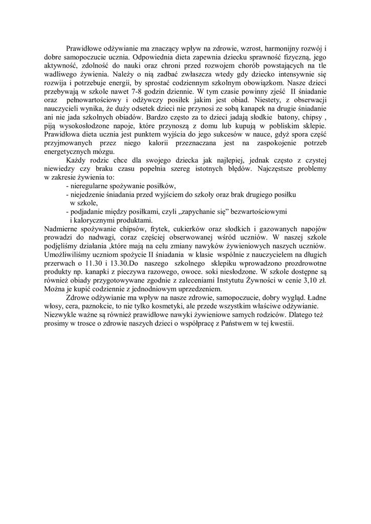 Prawidłowe odżywianie ma znaczący wpływ na zdrowie, wzrost, harmonijny rozwój i dobre samopoczucie ucznia. Odpowiednia dieta zapewnia dziecku sprawność fizyczną, jego aktywność, zdolność do nauki oraz chroni przed rozwojem chorób powstających na tle wadliwego żywienia. Należy o nią zadbać zwłaszcza wtedy gdy dziecko intensywnie się rozwija i potrzebuje energii, by sprostać codziennym szkolnym obowiązkom. Nasze dzieci przebywają w szkole nawet 7-8 godzin dziennie. W tym czasie powinny zjeść II śniadanie oraz pełnowartościowy i odżywczy posiłek jakim jest obiad. Niestety, z obserwacji nauczycieli wynika, że duży odsetek dzieci nie przynosi ze sobą kanapek na drugie śniadanie ani nie jada szkolnych obiadów. Bardzo często za to dzieci jadają słodkie batony, chipsy , piją wysokosłodzone napoje, które przynoszą z domu lub kupują w pobliskim sklepie. Prawidłowa dieta ucznia jest punktem wyjścia do jego sukcesów w nauce, gdyż spora część przyjmowanych przez niego kalorii przeznaczana jest na zaspokojenie potrzeb energetycznych mózgu. Każdy rodzic chce dla swojego dziecka jak najlepiej, jednak często z czystej niewiedzy czy braku czasu popełnia szereg istotnych błędów. Najczęstsze problemy w zakresie żywienia to: - nieregularne spożywanie posiłków, - niejedzenie śniadania przed wyjściem do szkoły oraz brak drugiego posiłku w szkole, - podjadanie między posiłkami, czyli „zapychanie się” bezwartościowymi i kalorycznymi produktami. Nadmierne spożywanie chipsów, frytek, cukierków oraz słodkich i gazowanych napojów prowadzi do nadwagi, coraz częściej obserwowanej wśród uczniów. W naszej szkole podjęliśmy działania ,które mają na celu zmiany nawyków żywieniowych naszych uczniów. Umożliwiliśmy uczniom spożycie II śniadania w klasie wspólnie z nauczycielem na długich przerwach o 11.30 i 13.30.Do naszego szkolnego sklepiku wprowadzono prozdrowotne produkty np. kanapki z pieczywa razowego, owoce. soki niesłodzone. W szkole dostępne są również obiady przygotowywane zgodnie z zaleceniami Instytutu Żywności w cenie 3,10 zł. Można je kupić codziennie z jednodniowym uprzedzeniem. Zdrowe odżywianie ma wpływ na nasze zdrowie, samopoczucie, dobry wygląd. Ładne włosy, cera, paznokcie, to nie tylko kosmetyki, ale przede wszystkim właściwe odżywianie. Niezwykle ważne są również prawidłowe nawyki żywieniowe samych rodziców. Dlatego też prosimy w trosce o zdrowie naszych dzieci o współpracę z Państwem w tej kwestii.