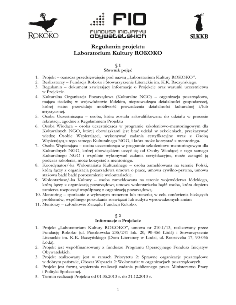 Regulamin projektu Laboratorium Kultury ROKOKO §1 Słownik pojęć 1. Projekt – oznacza przedsięwzięcie pod nazwą „Laboratorium Kultury ROKOKO”. 2. Realizatorzy – Fundacja Rokoko i Stowarzyszenie Literackie im. K.K. Baczyńskiego. 3. Regulamin – dokument zawierający informacje o Projekcie oraz warunki uczestnictwa w Projekcie. 4. Kulturalna Organizacja Pozarządowa (Kulturalne NGO) – organizacja pozarządowa, mająca siedzibę w województwie łódzkim, nieprowadząca działalności gospodarczej, której statut przewiduje możliwość prowadzenia działalności kulturalnej i/lub artystycznej. 5. Osoba Uczestnicząca – osoba, która została zakwalifikowana do udziału w procesie rekrutacji, zgodnie z Regulaminem Projektu 6. Osoba Wiodąca – osoba uczestnicząca w programie szkoleniowo-mentoringowym dla Kulturalnych NGO, której obowiązkami jest brać udział w szkoleniach, przekazywać wiedzę Osobie Wspierającej, wykonywać zadania certyfikacyjne wraz z Osobą Wspierającą z tego samego Kulturalnego NGO, i która może korzystać z mentoringu. 7. Osoba Wspierająca – osoba uczestnicząca w programie szkoleniowo-mentoringowym dla Kulturalnych NGO, której obowiązkiem uczyć się od Osoby Wiodącej z tego samego Kulturalnego NGO i wspólnie wykonywać zadania certyfikacyjne, może zastąpić ją podczas szkolenia, może korzystać z mentoringu. 8. Koordynator/-ka Wolontariatu Kulturalnego – osoba zameldowana na terenie Polski, którą łączy z organizacją pozarządową umowa o pracę, umowa cywilno-prawna, umowa stażowa bądź bądź porozumienie wolontariackie. 9. Wolontariusz/-ka Kultury – osoba zameldowana na terenie województwa łódzkiego, którą łączy z organizacją pozarządową umowa wolontariacka bądź osoba, która dopiero zamierza rozpocząć współpracę z organizacją pozarządową. 10. Mentoring – spotkanie z wybranym trenerem lub trenerką w celu omówienia bieżących problemów, wspólnego poszukania rozwiązań lub audytu wprowadzonych zmian 11. Mentorzy – członkowie Zarządu Fundacji Rokoko. §2 Informacje o Projekcie 1. Projekt „Laboratorium Kultury ROKOKO”, umowa nr 210-I/13, realizowany przez Fundację Rokoko (ul. Piotrkowska 235/241 lok. 20, 90-456 Łódź) i Stowarzyszenie Literackie im. K.K. Baczyńskiego (Dom Literatury w Łodzi, ul. Roosevelta 17, 90-056 Łódź). 2. Projekt jest współfinansowany z funduszu Programu Operacyjnego Fundusz Inicjatyw Obywatelskich. 3. Projekt realizowany jest w ramach Priorytetu 2: Sprawne organizacje pozarządowe w dobrym państwie, Obszar Wsparcia 2: Wolontariat w organizacjach pozarządowych. 4. Projekt jest formą wspierania realizacji zadania publicznego przez Ministerstwo Pracy i Polityki Społecznej. 5. Termin realizacji Projektu od 01.05.2013 r. do 31.12.2013 r. 1 6. Miejscem realizacji Projektu jest miasto Łódź. 7. Celami realizacji Projektu jest rozwój potencjału sektora organizacji pozarządowych w zakresie wolontariatu kulturalnego poprzez wielostronne, zintegrowane wsparcie go jako specyficznej sfery bezinteresownej pracy na rzecz organizacji oraz społeczeństwa obywatelskiego ze szczególnym uwzględnieniem regionu łódzkiego. 8. Informacje na temat Projektu zamieszczone są na stronie internetowej www.rokoko.org.pl. 9. Wsparcie w ramach Projektu obejmuje: a. szkolenia dla Kulturalnych NGO, b. szkolenia dla Koordynatorów/-ek Wolontariatu Kulturalnego, c. szkolenia dla Wolontariuszy/-ek Kultury, d. mentoring dla Kulturalnych NGO. 10. Regulamin określa zasady realizacji Projektu, w szczególności: a. procedurę rekrutacji na szkolenia, b. prawa i obowiązki Osoby Uczestniczącej, c. zasady korzystania z mentoringu. §3 Prawa i obowiązki Osoby Uczestniczącej 1. Udział w Projekcie jest bezpłatny. 2. Osoba Uczestnicząca ma obowiązek zapoznania się z całością tekstu niniejszego Regulaminu oraz respektowania jego zasad. 3. Osoba Uczestnicząca zobowiązuje się do wypełnienia i podpisania pełnej dokumentacji projektowej, w tym list potwierdzających obecność oraz odbiór produktów i usług zgodnie ze stanem faktycznym. 4. Realizatorzy w ramach szkoleń zapewnia pakiet materiałów dydaktycznych. 5. Realizatorzy szkoleń, w uzasadnionych przypadkach, zastrzegają sobie możliwość późniejszego przekazania materiałów Osobom Uczestniczącym. 6. Osoba Uczestnicząca podczas szkoleń ma zapewniony posiłek. 7. Osoba Uczestnicząca zobowiązuje się do uczestniczenia w szkoleniach w pełnym wymiarze godzin. 8. Osoba Uczestnicząca jest zobowiązana do udziału w badaniach ankietowych i ewaluacyjnych w ramach Projektu w trakcie jego trwania i po jego zakończeniu. 9. Osoba Uczestnicząca wyraża zgodę na bezpłatne i bezterminowe wykorzystanie dla celów promocyjnych oraz monitoringu i ewaluacji swojego wizerunku na różnych polach eksploatacji Projektu. 10. Osoba Uczestnicząca jest zobowiązana do potwierdzania własnoręcznym podpisem swojej obecności na liście obecności. 11. Warunkiem ukończenia programu szkoleniowo-mentoringowego dla Kulturalnych NGO oraz otrzymania certyfikatu jest 80% frekwencja na zajęciach oraz zaliczenie zadań certyfikacyjnych. 12. Warunkiem ukończenia programu szkoleniowego dla Koordynatorów/-ek Wolontariatu Kulturalnego oraz Wolontariuszy/-ek Kultury oraz otrzymania certyfikatu jest 100% frekwencja. 13. Rezygnacja z uczestnictwa może nastąpić tylko w sytuacjach niezależnych od Osoby Uczestniczącej, których nie udało się przewidzieć w chwili wysłania zgłoszenia rekrutacyjnego, wynikających z: ważnych (losowych) przyczyn, przyczyn natury 2 zdrowotnej uniemożliwiającej korzystanie ze wsparcia przewidzianego w Projekcie. Konsekwencją nieuzasadnionego wycofania się będzie obowiązek zwrotu części kosztów udziału w projekcie (20% wartości kosztu Projektu w przeliczeniu na jedną osobę Uczestniczącą). 14. W przypadku rezygnacji z udziału w Projekcie Osoba Uczestnicząca zobowiązana jest do niez