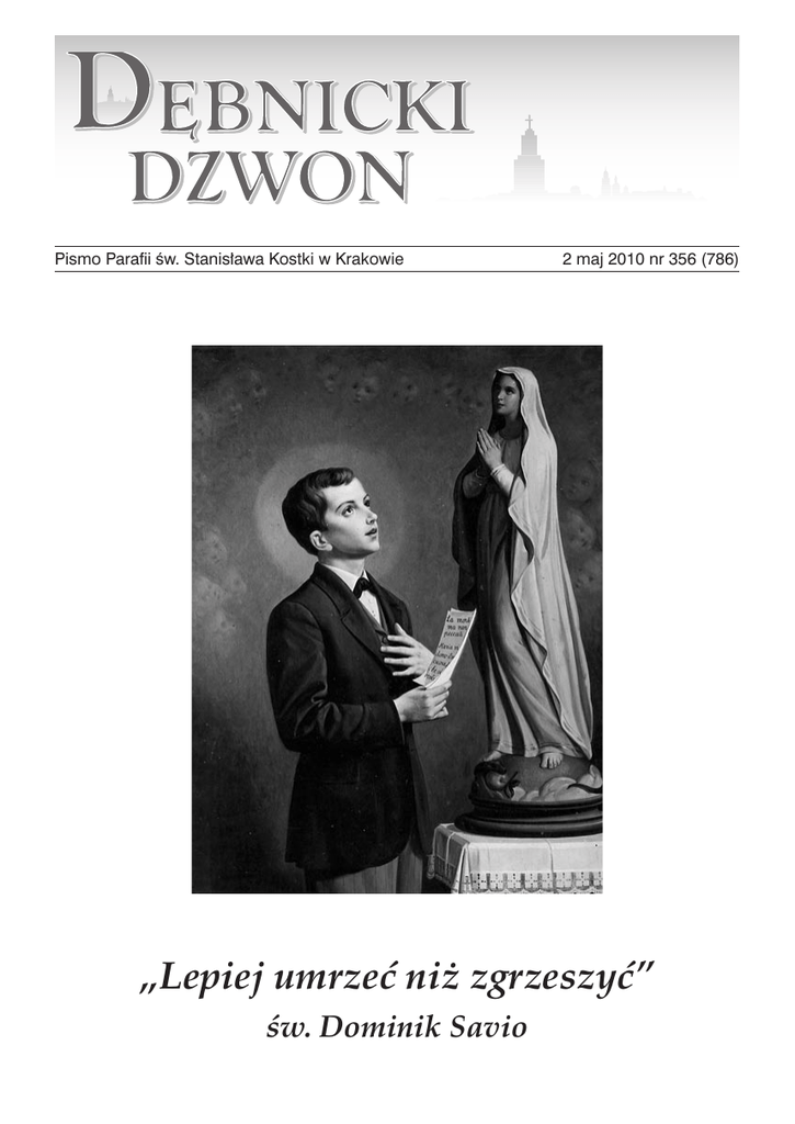 Pismo Parafii św. Stanisława Kostki w Krakowie 2 maj 2010 nr 356 (786) „Lepiej umrzeć niż zgrzeszyć” św. Dominik Savio Słowo Dla Życia Po wyjściu Judasza rzekł Jezus: Syn Człowieczy został teraz otoczony chwałą, a w Nim Bóg został chwałą otoczony. Jeżeli Bóg został w Nim otoczony chwałą, to i Bóg Go otoczy chwałą w sobie samym, i to zaraz Go chwałą otoczy. Dzieci, jeszcze krótko jestem z wami. Przykazanie nowe daję wam, abyście się wzajemnie miłowali tak, jak Ja was umiłowałem; żebyście i wy tak się miłowali wzajemnie. Po tym wszyscy poznają, żeście uczniami moimi, jeśli będziecie się wzajemnie miłowali. Z ewangelii według św. Jana 13,31-33a.34-35 Nie ma jedności bez miłości „Daje Wam przykazanie nowe, abyście się wzajemnie miłowali tak, jak ja was umiłowałem; żebyście i wy tak się miłowali wzajemnie”. Jezusowe przykazanie miłości było wtedy, przed dwoma tysiącami lat, rzeczywiście nowe. A dziś? Jezus także i do nas mówi: „Po tym wszyscy poznają, żeście uczniami moimi, jeśli będziecie się wzajemnie miłowali. Miłujcie się wzajemnie,” Czy czasem nie słuchamy tego wezwania z zażenowaniem, a może i z odrobiną sceptycyzmu? Czy wypełniamy to przykazanie? Znamy je przecież nie od dziś, a mimo to ciągle mamy wrażenie, że jest nierealne, a może i nawet niedzisiejsze. Czyż nie potwierdzają tego nasze codzienne doświadczenia w domu, w miejscu pracy, w szkole, na ulicy, w autobusie, w szpitalu, w parafii, w naszej Ojczyźnie, w świecie…? Przykazanie wzajemnej miłości jest piękne i wielu z nas myśli sobie w duszy tak samo, jak kiedyś apostołowie: „Najbardziej ze wszystkiego potrzeba nam właśnie wzajemnego poszanowania, zauważania siebie, miłości”. Po chwili jednak dodajemy ze smutkiem: 2 „To jednak utopia, pobożne życzenie”. Czy Ewangelia może nam jakoś pomóc? Na pewno nie w tym sensie, że poda nam gotową receptę na prostą realizację przykazania miłości w naszym życiu. Znajdziemy jednak w ewangelii dwie istotne wskazówki: Po pierwsze, w bardzo wyraźnie widać, że Jezus wierzy głęboko, iż Jego uczniowie są w stanie wypełnić to przykazanie, że potrafią kochać. Ufa im, mimo, że kłócą się między sobą o to, kto z nich jest pierwszy i najważniejszy, mimo, że Go nie rozumieją i nadal popełniają karygodne błędy. Jezus ufa im. Jeżeli ufa im, to zaufaniem darzy także i nas. Po drugie, Ewangelia mówi nam, że tak naprawdę nie ma dla uczniów Chrystusa, żadnej alternatywy. Miłość musi być naszym celem, ideałem, do którego krok po kroku zmierzamy, bo inaczej przestaniemy być uczniami Jezusa i zaprzeczymy wszystkim wysiłkom, które podejmujemy, aby godnie żyć i szanować życie innych. Kiedy dokładniej przyjrzymy się naszemu codziennemu życiu, to zobaczymy, że jednak są w nim takie chwile i sytuacje, w których udaje się nam to przykazanie realizować, że mimo wszystko potrafimy kochać innych, a inni potrafią kochać nas. ”Daję wam przykazanie nowe, abyście się wzajemnie miłowali tak, jak ja was umiłowałem; żebyście i wy tak się miłowali wzajemnie”. Przykazanie to nie jest już nowe, ale stale na nowo powinniśmy próbować żyć według niego. Nie kochajmy innych tylko wtedy gdy połączy nas jakieś dramatyczne wydarzenie. Każda chwila życia ma wielką, bezcenna wartość: „Śpieszmy się kochać ludzi, tak szybko odchodzą”- wzywa poeta ks. Jan Twardowski. Opracowali: ks. Czesław Major SDB i ks. Jan Dubas SDB Zaproszenie do udziału w Mszy św. w intencji maturzystów. Zgodnie z wieloletnią tradycją, Ksiądz Kardynał Stanisław Dziwisz odprawi Mszę świętą w intencji maturzystów w Bazylice Mariackiej w przeddzień rozpoczęcia matury – 3 maja – w uroczystość NMP Królowej Polski, o godz. 18.30. Serdecznie zapraszamy do udziału w tej modlitwie maturzystów, ich rodziców oraz nauczycieli, wychowawców, katechetów. Wydział Duszpasterstwa Dzieci i Młodzieży Kurii Metropolitalnej w Krakowie 3 POWOŁANIE W SŁUŻBIE WSPÓLNOTY KOŚCIOŁA ORĘDZIE BENEDYKTA XVI NA 47. ŚWIATOWY DZIEŃ MODLITW O POWOŁANIA 25 KWIETNIA 2010 – IV NIEDZIELA WIELKANOCNA Czcigodni Bracia w biskupstwie i kapłaństwie, Drodzy Bracia i Siostry! 47 Światowy Dzień Modlitw o Powołania, który przeżywać będziemy w IV Niedzielę Wielkanocną – 25 kwietnia 2010 roku, w Niedzielę „Dobrego Pasterza” – stanowi dla mnie okazję, by poddać pod refleksję temat, który dobrze harmonizuje z Rokiem Kapłańskim: Świadectwo wzbudza powołania. Owocność propozycji powołaniowych zależy najpierw od inicjatywy i działania Boga, ale – jak to potwierdza doświadczenie duszpasterskie – jest wspierana także jakością i bogactwem świadectwa osobistego i wspólnotowego tych, którzy już odpowiedzieli na wołanie Pana do podjęcia posługi kapłańskiej czy do życia konsekrowanego. Ich świadectwo może pomóc innym, by i oni zapragnęli z wielkodusznością odpowiedzieć na głos Chrystusa. Powyższy temat jest zatem ściśle powiązany z życiem i posłannictwem kapłanów oraz osób konsekrowanych. Wszystkich, których Pan powołał do pracy w swojej winnicy, pragnę zaprosić do tego, by odnowili 4 swoją wierną odpowiedź, zwłaszcza w tym Roku Kapłańskim, który ustanowiłem w związku ze 150. rocznicą śmierci św. Jana Marii Vianneya, proboszcza z Ars, który jest wciąż aktualnym wzorem kapłana i proboszcza. Już w Starym Testamencie prorocy byli świadomi swego powołania, by własnym życiem świadczyć o tym, co głosili, gotowi zmierzyć się równocześnie z niezrozumieniem, odrzuceniem czy prześladowaniem. Zadanie, które otrzymali od Boga, pochłaniało ich całkowicie, jak „płonący ogień” w sercu, którego nie da się zatrzymać (por. Jr 20, 9) i dlatego byli gotowi oddać Panu nie tylko swój głos, ale całe swe istnienie. W pełni czasów sam Jezus jest tym, który został posł