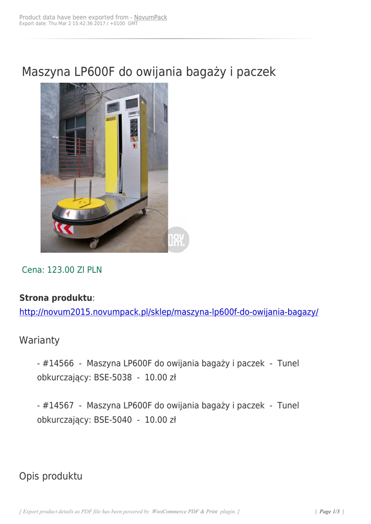 Product data have been exported from - NovumPack Export date: Thu Mar 2 15:42:36 2017 / +0100 GMT Maszyna LP600F do owijania bagaży i paczek Cena: 123.00 Zl PLN Strona produktu: http://novum2015.novumpack.pl/sklep/maszyna-lp600f-do-owijania-bagazy/ Warianty - #14566 - Maszyna LP600F do owijania bagaży i paczek - Tunel obkurczający: BSE-5038 - 10.00 zł - #14567 - Maszyna LP600F do owijania bagaży i paczek - Tunel obkurczający: BSE-5040 - 10.00 zł Opis produktu [ Export product details as PDF file has been powered by WooCommerce PDF & Print plugin. ] | Page 1/3 | Product data have been exported from - NovumPack Export date: Thu Mar 2 15:42:36 2017 / +0100 GMT Owijarka do bagaży - maszyna LP600F-L przeznaczona jest do usługowego pakowania na lotniskach, terminalach, dworcach itp. Maszyna z powodzeniem, w prosty, szybki i tani sposób zabezpiecza bagaż podróżny owijając go folią stretch. Dzięki odpowiedniemu naciągowi folii, maszyna jest w stanie zapakować 300-400 szt bagaży przy użyciu tylko 1 rolki. Bagaż podróżny zabezpieczony w ten sposób jest odporny na uszkodzenia, zadrapania, zabrudzenia itp.. Zasilanie maszyny: 230V/60Hz, Moc 0,75Kw Materiały: Maszyna wykorzystuje standardowe rolki z folią stretch o wymiarach: długość 500mm, 20-25mikronów, nawój ~1600m, waga max. 15kg. Maszyna LP600F zapewnia bardzo dobre naciąganie folii co zapewnia oszczędność na materiałach opakowaniowych Obsługuje standardowe folie stretch (500mm, 25mic, 1600m, tuleja 76mm) Zaprojektowana tak by zapakować praktycznie każdy rozmiar walizki/torby podróżnej już w 1 kroku. Max waga bagażu do 100kg, max. wymiar bagażu 500-800mm (DŁ/Wys) Dwa tryby pracy, automatyczny i manualny – do niestandardowych bagaży Wysoka szybkość pakowania, regulacja prędkości obrotowej ( 0-36 rpm), Płynny rozruch i zatrzymanie owijania. Ruch w górę / w dół wózka filmu w trybie automatycznym zapewnia pomoc dla sprawnego owijania dużych walizek. Regulacja naciągu folii Wysokiej jakości części elektroniczne marki OMRON Wielkość urządzenia : długość 1600mm , szerokość 600 mm, wysokość 1700 mm Wiele opcji kolorystycznych Specyfikacja [ Export product details as PDF file has been powered by WooCommerce PDF & Print plugin. ] | Page 2/3 | Product data have been exported from - NovumPack Export date: Thu Mar 2 15:42:36 2017 / +0100 GMT - Zasilanie: 230V 50Hz - Gwarancja: 12 m-cy [ Export product details as PDF file has been powered by WooCommerce PDF & Print plugin. ] | Page 3/3 |
