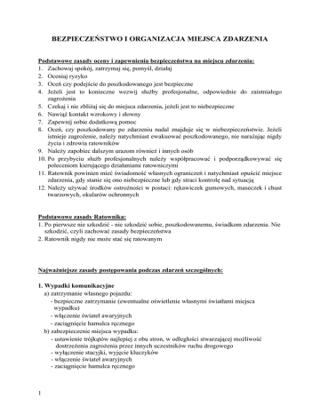 BEZPIECZEŃSTWO I ORGANIZACJA MIEJSCA ZDARZENIA Podstawowe zasady oceny i zapewnienia bezpieczeństwa na miejscu zdarzenia: 1. Zachowaj spokój, zatrzymaj się, pomyśl, działaj 2. Oceniaj ryzyko 3. Oceń czy podejście do poszkodowanego jest bezpieczne 4. Jeżeli jest to konieczne wezwij służby profesjonalne, odpowiednie do zaistniałego zagrożenia 5. Czekaj i nie zbliżaj się do miejsca zdarzenia, jeżeli jest to niebezpieczne 6. Nawiąż kontakt wzrokowy i słowny 7. Zapewnij sobie dodatkową pomoc 8. Oceń, czy poszkodowany po zdarzeniu nadal znajduje się w niebezpieczeństwie. Jeżeli istnieje zagrożenie, należy natychmiast ewakuować poszkodowanego, nie narażając nigdy życia i zdrowia ratowników 9. Należy zapobiec dalszym urazom również i innych osób 10. Po przybyciu służb profesjonalnych należy współpracować i podporządkowywać się poleceniom kierującego działaniami ratowniczymi 11. Ratownik powinien mieć świadomość własnych ograniczeń i natychmiast opuścić miejsce zdarzenia, gdy stanie się ono niebezpieczne lub gdy straci kontrolę nad sytuacją 12. Należy używać środków ostrożności w postaci: rękawiczek gumowych, maseczek i chust twarzowych, okularów ochronnych Podstawowe zasady Ratownika: 1. Po pierwsze nie szkodzić - nie szkodzić sobie, poszkodowanemu, świadkom zdarzenia. Nie szkodzić, czyli zachować zasady bezpieczeństwa 2. Ratownik nigdy nie może stać się ratowanym Najważniejsze zasady postępowania podczas zdarzeń szczególnych: 1. Wypadki komunikacyjne a) zatrzymanie własnego pojazdu: - bezpieczne zatrzymanie (ewentualne oświetlenie własnymi światłami miejsca wypadku) - włączenie świateł awaryjnych - zaciągnięcie hamulca ręcznego b) zabezpieczenie miejsca wypadku: - ustawienie trójkątów najlepiej z obu stron, w odległości stwarzającej możliwość dostrzeżenia zagrożenia przez innych uczestników ruchu drogowego - wyłączenie stacyjki, wyjęcie kluczyków - włączenie świateł awaryjnych - zaciągnięcie hamulca ręcznego 1 c) postępowanie z poszkodowanym: - rozpięcie lub rozcięcie pasów - badanie - postępowanie w zależności od potrzeb - zwrócić uwagę na potencjalne niebezpieczeństwo uruchomienia poduszki powietrznej zagrażające ratownikowi d) poszkodowanych nie wyjmujemy z pojazdów z wyjątkiem sytuacji, kiedy istnieje jakiekolwiek zagrożenie na miejscu zdarzenia, np: - samochód grozi zapaleniem lub już się pali, (silnik gasimy przy lekko uchylonej masce, zużywamy całą gaśnicę) - samochód jest niestabilny lub występują inne zagrożenia - poszkodowanego trzeba resuscytować - gdy poszkodowany jest we wstrząsie e) każdy poszkodowany w wypadku komunikacyjnym jest traktowany jako osoba z potencjalnie uszkodzonym kręgosłupem na odcinku szyjnym 2. Wypadki na wodzie i pod wodą - nie narażać, życia i zdrowia ratowników - zapewnić profesjonalną pomoc: Pogotowie Ratunkowe, PSP, WOPR - zapobiegać dalszym ofiarom: nie wpuszczać świadków zdarzenia do wody, na lód, itp. 3. Wypadki elektryczne - odłączyć dopływ prądu - zapewnić profesjonalną pomoc: Pogotowie Ratunkowe, Pogotowie Energetyczne tel: 991 PSP - nie dotykać poszkodowanego przed przyjazdem służb profesjonalnych lub odłączeniem napięcia - w przypadku awarii linii wysokiego napięcia nie podchodzić do miejsca zdarzenia 4. Wypadki z udziałem materiałów łatwopalnych (pożary) - zabezpieczyć ewakuację poszkodowanych - zapewnić pomoc służb profesjonalnych: PSP, OSP - w miarę możliwości zlikwidować ogniska otwartego ognia - nie narażać zdrowia i życia ratowników poprzez kierowanie ich w bezpośrednie miejsce zdarzenia 2 5. Wypadki z udziałem materiałów niebezpiecznych - większość wypadków z udziałem materiałów niebezpiecznych związana jest z ich transportem - pojazdy przewożące materiały niebezpieczne są oznakowane - zapewnić pomoc służb profesjonalnych: PSP - przeprowadzić rozpoznanie (w miarę możliwości odczytać oznaczenie przewożonego materiału niebezpiecznego – tabliczka informująca) - odgrodzić terenu - nie dopuszczać postronnych 6. Wypadki lotnicze - zapewnienie pomocy służb profesjonalnych: PSP - ewakuować poszkodowanych - podchodzić do miejsca zdarzenia od strony nawietrznej - uważać na zasięg śmigieł helikopterów 7. Wypadki kolejowe - dokonujemy ogólnej rozpoznania co do położenia i rozmiarów katastrofy - powiadamiamy służby ratownicze i przystępujemy do pomocy przedmedycznej - jeśli istnieje taka konieczność ewakuujemy poszkodowanych - gdy w wypadku występuje udział transportu materiałów niebezpiecznych postępujemy jak w przypadku zdarzeń z materiałami niebezpiecznymi 8. Wypadki z udziałem gazu - bezwzględnie zapewnić pomoc służb profesjonalnych: Pogotowie Gazowe tel: 992, PSP, - unikać kontaktu z oparami - ewakuować poszkodowanych - przewietrzyć pomieszczenie 9. Przestępstwa - należy ocenić prawdopodobieństwo użycia przemocy wobec ratowników, ofiar lub świadków zdarzenia - wezwać Policję nr tel. 997 - należy starać się nie zacierać śladów przestępstwa 3 10. Zdarzenia w budynkach i zamkniętych przestrzeniach a) należy dokładnie ocenić miejsce zdarzenia przed wejściem do niego - czy konstrukcje są trwałe - czy nie mają śladów uszkodzeń - czy jest prawdopodobieństwo substancji toksycznych - czy jest prawdopodobieństwo obniżonej wartości tlenu lub podwyższone stężenie innych gazów - czy teren jest oświetlony - czy nie ma ognia, dymu lub innych oparów b) wezwij służby profesjonalne c) nigdy nie wchodź do budowli sam, zawsze powiadom inne osoby o wejściu do budynków d) nigdy nie wchodź do studni, kominów, szamba i innych studzienek, ze względu na możliwą obecność trujących gazów 4 Bibliography: 1. Medycyna Ratunkowa wyd. Urban & Partner pod redakcją prof. Juliusza Jakubaszki 2. Basic Trauma Life Support course book 3. Wytyczne Resuscytacji Krążeniowo – Oddechow